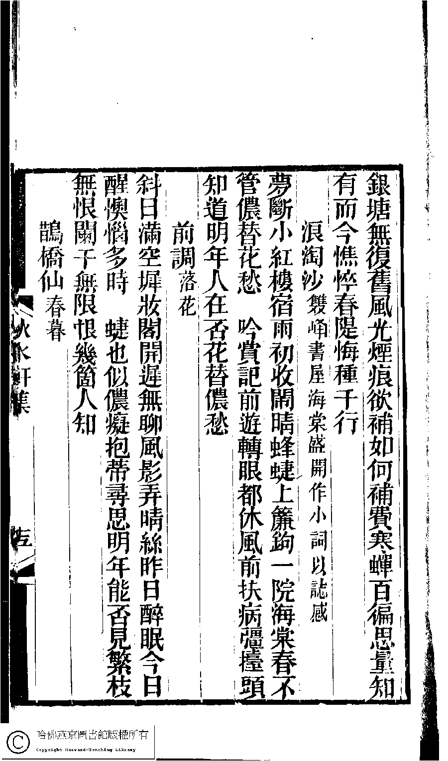| 浪淘沙 : 雙峰書屋海棠盛開作小詞以誌感 Lang tao sha : Shuang feng shu wu hai tang sheng kai zuo xiao ci yi zhi gan 詞 ci 莊盤珠﹐字蓮佩 Zhuang Panzhu, zi: Lianpei 林下雅音集﹕五種(淸冒俊輯) 秋水軒詩詞集: 一卷 Lin xia ya yin ji: 5 zhong (edited by Mao Jun, Qing dynasty) Qiu shui xuan shi ci ji: 1 juan, pp. 詞.15a. |