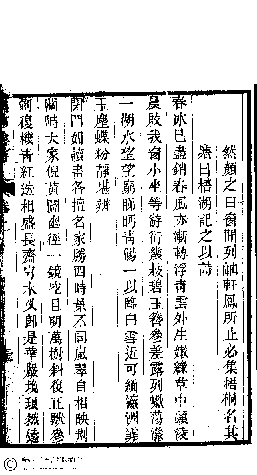 | 予居在粵西會垣地近北城曰鳳凰里宅後地空曠塘水渺瀰隔岸有李園花時白雪玲瓏綿亘數十丈城外諸山排青映碧入書窗中如圖畫然顏之曰窗間列岫軒鳳所止必集梧桐名其塘曰梧湖記之以詩 (二首) Yu ju zai Yue xi Huiyuan di jin bei cheng yue Fenghuangli zhai hou di kong kuang tang shui miao mi ge an you li yuan hua shi bai xue ling long mian gen shu shi zhang cheng wai zhu shan pai qing ying bi ru shu chuang zhong ru tu hua ran yan zhi yue chuang jian Lie xiu xuan feng suo zhi bi ji wu tong ming qi tang yue Wu Hu ji zhi yi shi 詩 - 五言古詩 shi - wuyangushi 錢守璞﹐字壽芝﹐又名藕香﹐蓮因﹐蓮緣 Qian Shoupu, zi: Shouzhi 繡佛樓詩稿﹕二卷(清錢守璞撰) Xiu fo lou shi gao: 2 juan (by Qian Shoupu, Qing dynasty) , pp. 2.36b,2.37a,2.37b. |
