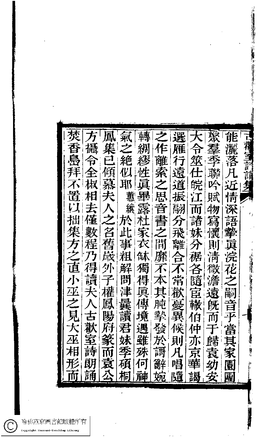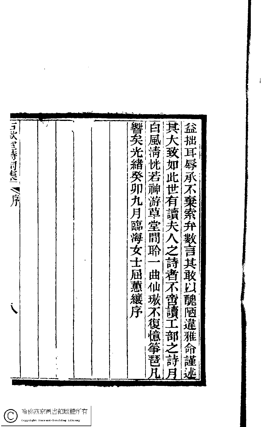 | 屈蕙纕序 Qu Huixiang xu 文﹕序 Wen: Xu 屈蕙纕﹐字逸珊 Qu Huixiang, zi: Yishan 古歡室集:詩三卷,詞一卷,醫學篇二卷,女學篇一卷,中饋錄一卷(清曽懿撰) Gu huan shi ji: shi 3 juan, ci 1 juan, yi xue pian: 2 juan, nü xue pian 1 juan, zhong kui lu 1 juan (by Zeng Yi, Qing dynasty) , pp. 序.7a,序.7b,序.8a,序.8b. |