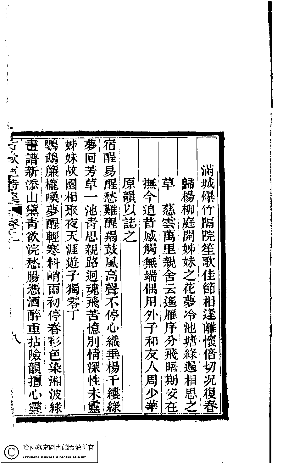 | 滿城爆竹隔院笙歌佳節相逢離懷倍切況復春歸楊柳庭開姊妹之花夢冷池塘綠遍相思之草慈雲萬里親舍云遙雁序分飛晤期安在撫今追昔感觸無端偶用外子和友人周少華原韻以誌之(二首) Man cheng bao zhu ge yuan sheng ge jia jie xiang feng li huai bei qie kuang fu chun gui yang liu ting kai zi mei zhi hua meng leng chi tang lü bian xiang si zhi cao ci yun wan li qin she yun yao yan xu fen fei wu qi an zai fu jin zhui xi gan chu wu duan ou yong wai zi he you ren Zhou Shaohua yuan yun yi zhi zhi (Er shou) 詩 - 七言律詩 shi - qiyanlüshi 曾懿﹐字伯淵﹐又名朗秋 Zeng Yi, zi: Boyuan 古歡室集:詩三卷,詞一卷,醫學篇二卷,女學篇一卷,中饋錄一卷(清曽懿撰) Gu huan shi ji: shi 3 juan, ci 1 juan, yi xue pian: 2 juan, nü xue pian 1 juan, zhong kui lu 1 juan (by Zeng Yi, Qing dynasty) , pp. 2.8a,2.8b. |