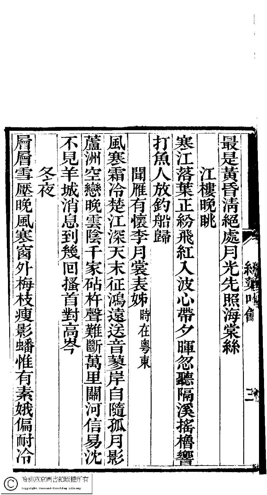 | 江樓晚眺 Jiang lou wan tiao 詩 - 七言絕句 shi - qiyanjueju 楊書蘭﹐字畹香 Yang Shulan, zi: Wanxiang 澹香閣詩鈔:一卷外四種(清李星池等撰) 紅蕖吟館詩鈔﹕一卷(清楊書蘭撰) Dan xiang ge shi chao: 1 juan wai 4 zhong (by Li Xingchi etc., Qing dynasty) Hong qu yin guan shi chao: 1 juan (by Yang Shulan, Qing dynasty), pp. 2.3b. |
