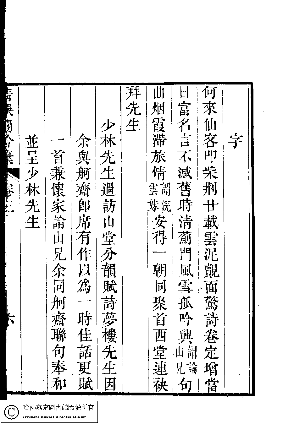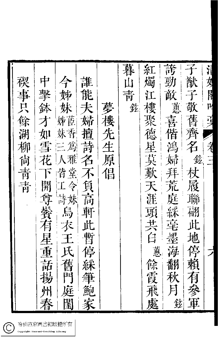 | 少林先生過訪山堂分韻賦詩夢樓先生因余與舸齋即席有作以為一時佳話更賦一首兼懷家論山兄余同舸齋聯句奉和並呈少林先生 Shaolin xian sheng guo fang shan tang fen yun fu shi Menglou xian sheng yin yu yu Gezhai ji xi you zuo yi wei yi shi jia hua geng fu yi shou jian huai jia Lunshan xiong yu tong Gezhai lian ju feng he bing cheng Shaolin xian sheng 詩 - 七言聯句 shi - qiyanlianju 鮑之蕙﹐號茝香﹐字仲姒 Bao Zhihui, hao: Chaixiang, zi: Zhongsi 張鉉﹐號舸齋﹐字翊和 Zhang Xuan, hao: Gezhai, zi: Yihe 清娛閣吟稾﹕六卷(清鮑之蕙撰) Qing yu ge yin gao : 6 juan (by Bao Zhihui, Qing dynasty) , pp. 3.6a,3.6b. |