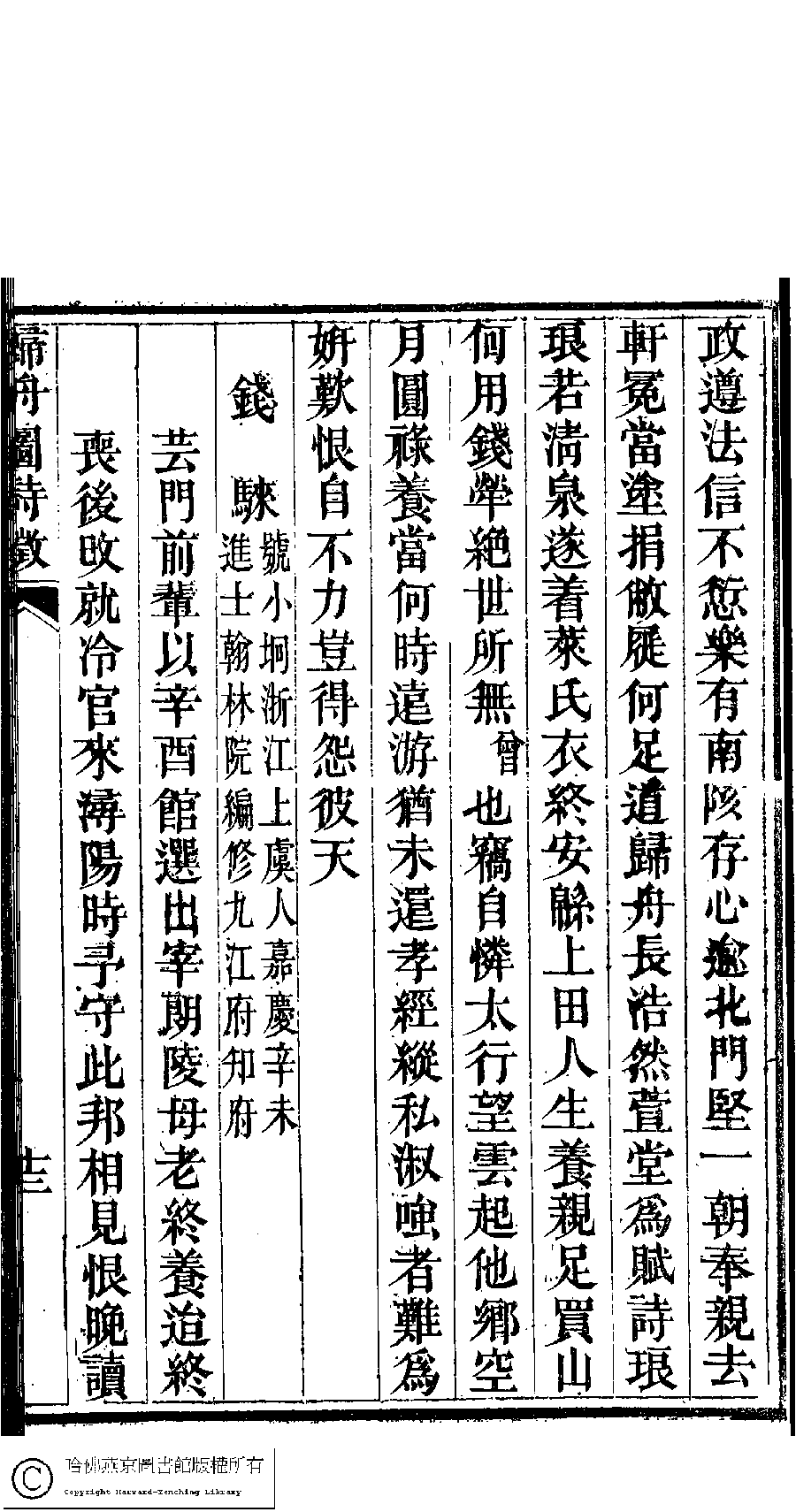 | 道光四年九月曾需次都門謁芸門太老夫子於邸寓出歸舟安侍圖命題敬用老太師母太夫人寫懷原韻恭賦 Daoguang si nian jiu yue Zeng xu ci du men ye Yunmen tai lao fu zi yu di yu chu Gui zhou an shi tu ming ti jing yong lao tai shi mu tai fu ren Xie huai yuan yun gong fu 詩 - 五言排律 shi - wuyanpailü 王懷曾﹐號君耜 Wang Huaizeng, hao: Junsi 詠雪樓稿﹕五卷,卷首一卷,附一卷(清甘立媃撰) Yong xue lou gao: 5 juan, juan shou 1 juan, fu 1 juan ( by Gan lirou, Qing dynasty) , pp. 5.詩徵.12b,5.詩徵.13a. |