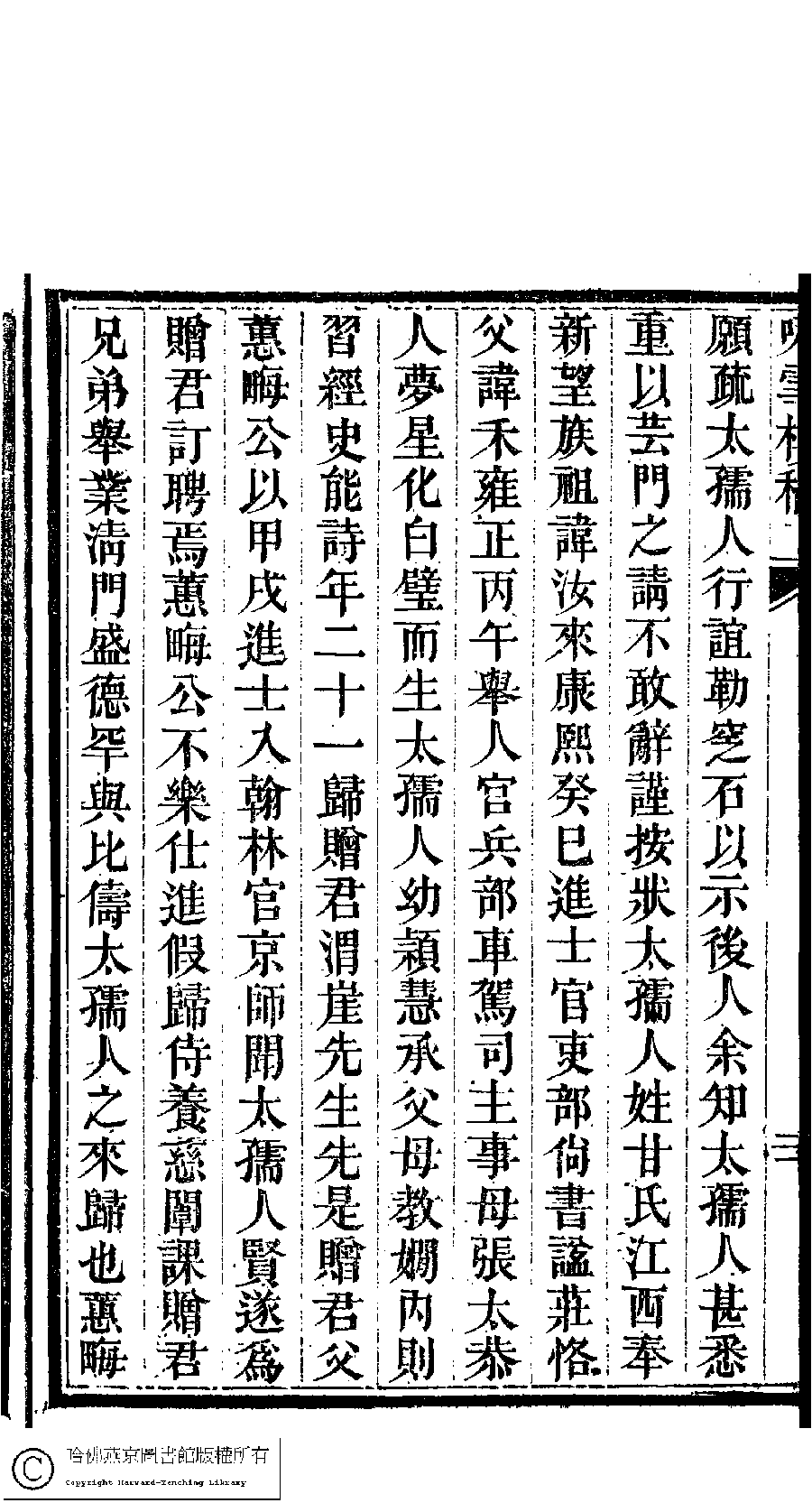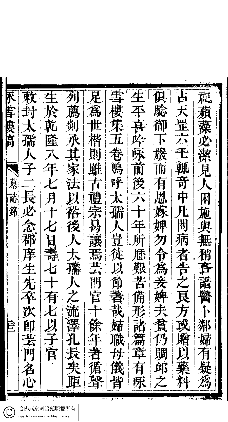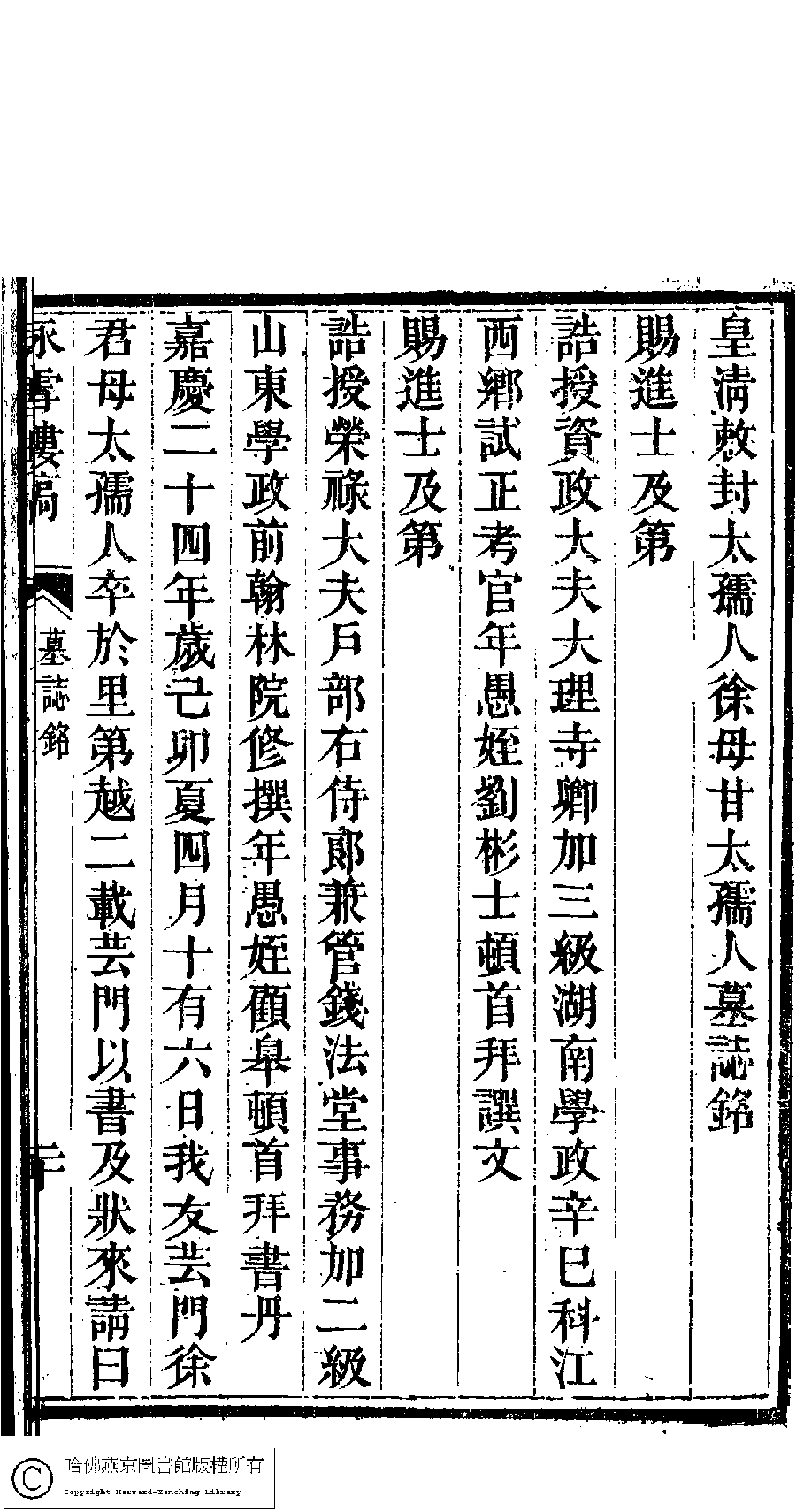 | 皇清敕封太孺人徐母甘太孺人墓誌銘 Huang Qing chi feng tai ru ren Xu mu Gan tai ru ren mu zhi ming 文﹕墓誌銘 Wen: Mu zhi ming 劉彬士﹐號雲圃﹐又名筠圃 Liu Binshi, hao: Yunpu 顧皋﹐號歅齋﹐字晴芬﹐又名緘石 Gu Gao, hao: Yanzhai, zi: Qingfen 詠雪樓稿﹕五卷,卷首一卷,附一卷(清甘立媃撰) Yong xue lou gao: 5 juan, juan shou 1 juan, fu 1 juan ( by Gan lirou, Qing dynasty) , pp. 5.墓銘.20a,5.墓銘.20b,5.墓銘.21a,5.墓銘.21b,5.墓銘.22a,5.墓銘.22b. |