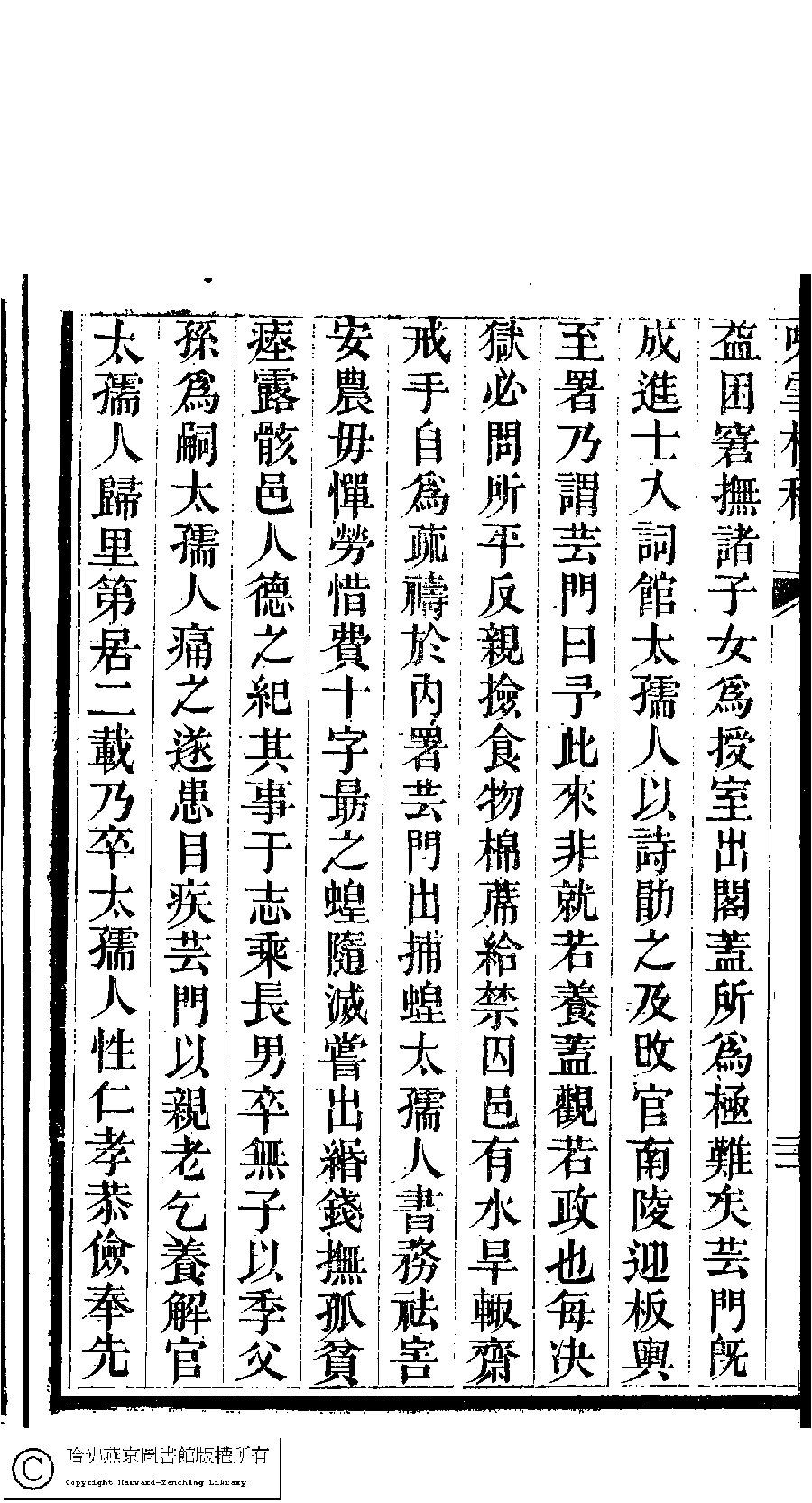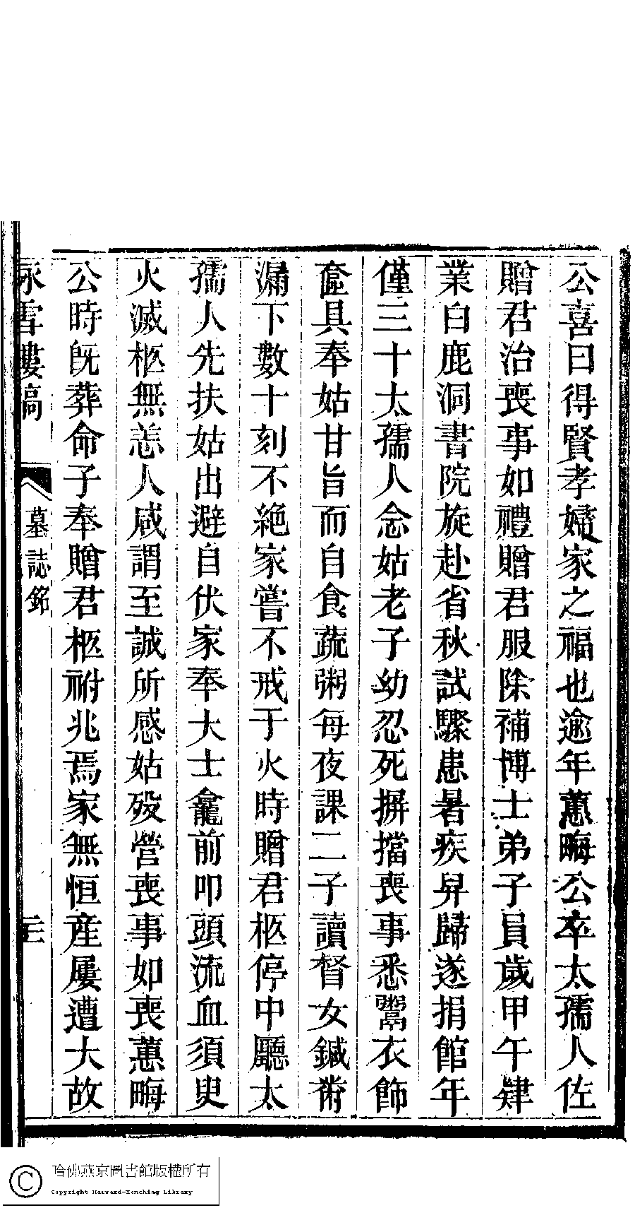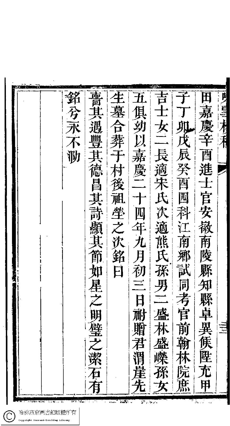 | 皇清敕封太孺人徐母甘太孺人墓誌銘 Huang Qing chi feng tai ru ren Xu mu Gan tai ru ren mu zhi ming 文﹕墓誌銘 Wen: Mu zhi ming 劉彬士﹐號雲圃﹐又名筠圃 Liu Binshi, hao: Yunpu 顧皋﹐號歅齋﹐字晴芬﹐又名緘石 Gu Gao, hao: Yanzhai, zi: Qingfen 詠雪樓稿﹕五卷,卷首一卷,附一卷(清甘立媃撰) Yong xue lou gao: 5 juan, juan shou 1 juan, fu 1 juan ( by Gan lirou, Qing dynasty) , pp. 5.墓銘.20a,5.墓銘.20b,5.墓銘.21a,5.墓銘.21b,5.墓銘.22a,5.墓銘.22b. |