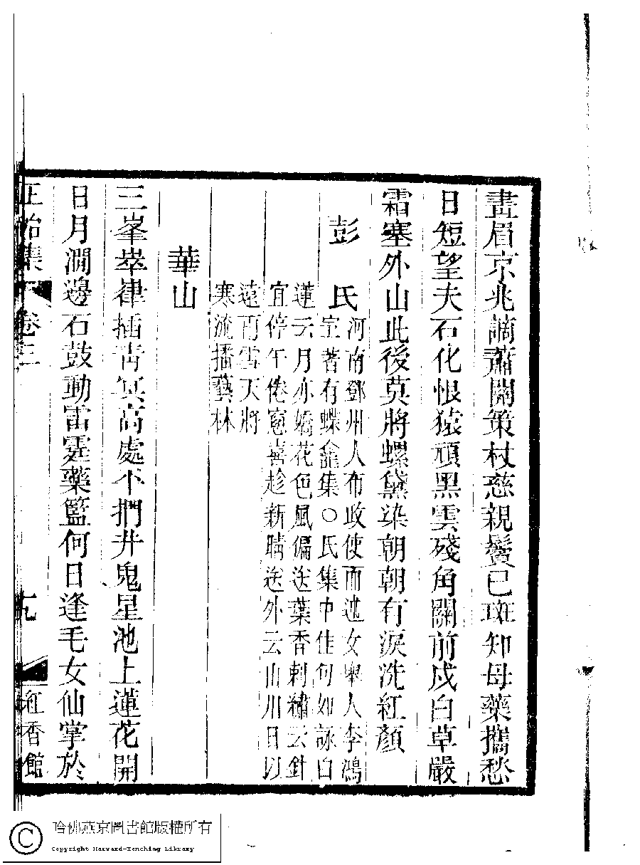 | 華山 Hua Shan 詩 - 七言律詩 shi - qiyanlüshi 彭氏(李鴻儒妻) Peng shi (Li Hongru qi) 國朝閨秀正始集﹕二十卷﹐附錄﹕一卷﹐補遺﹕一卷﹐又附題詞﹕一卷(清惲珠輯) Guo chao gui xiu zheng shi ji: 20 juan, fu lu: 1 juan, bu yi: 1 juan, you fu ti ci: 1 juan (edited by Yun Zhu, Qing dynasty) , pp. 3.19a,3.19b. |