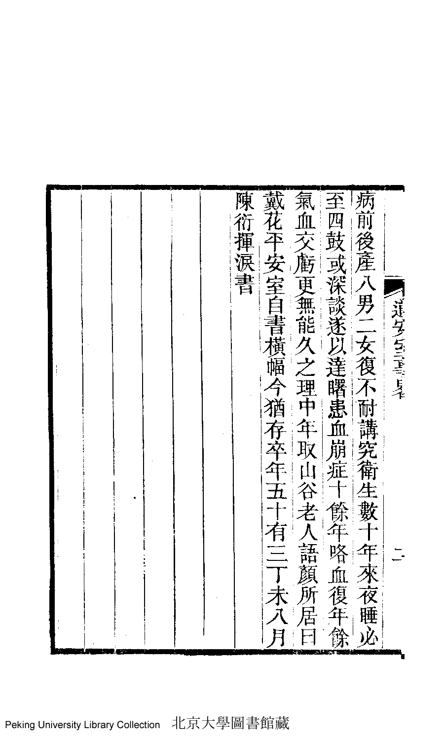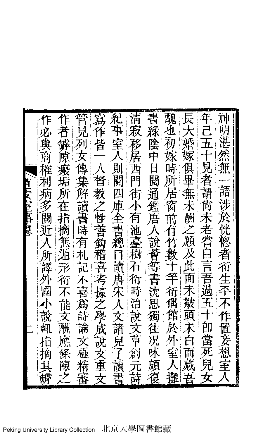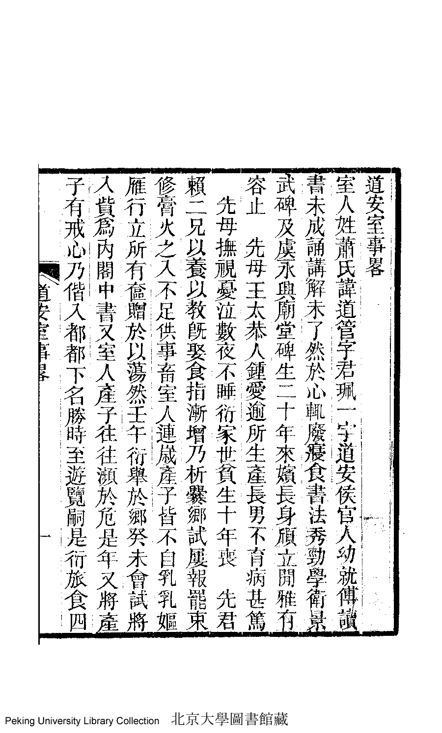 | 道安室事畧 dao an shi shi lüe 文﹕略傳 Wen: lüe zhuan 陳衍﹐號石遺老人﹐字叔伊 Chen Yan, hao: Shiyilaoren, zi: Shuyi 道安室雜文﹕一卷﹐蕭閒堂遺詩﹕一卷﹐戴花平安室詞﹕一卷﹐平安室雜記﹕ 一卷(清蕭道管撰) Dao an shi za wen: 1 juan, Xiao xian tang yi shi: 1 juan, Dai hua ping an shi ci: 1 juan, Ping an shi za ji: 1 juan (by Xiao Daoguan, Qing dynasty) , pp. 事畧.1a,事畧.1b,事畧.2a,事畧.2b. |