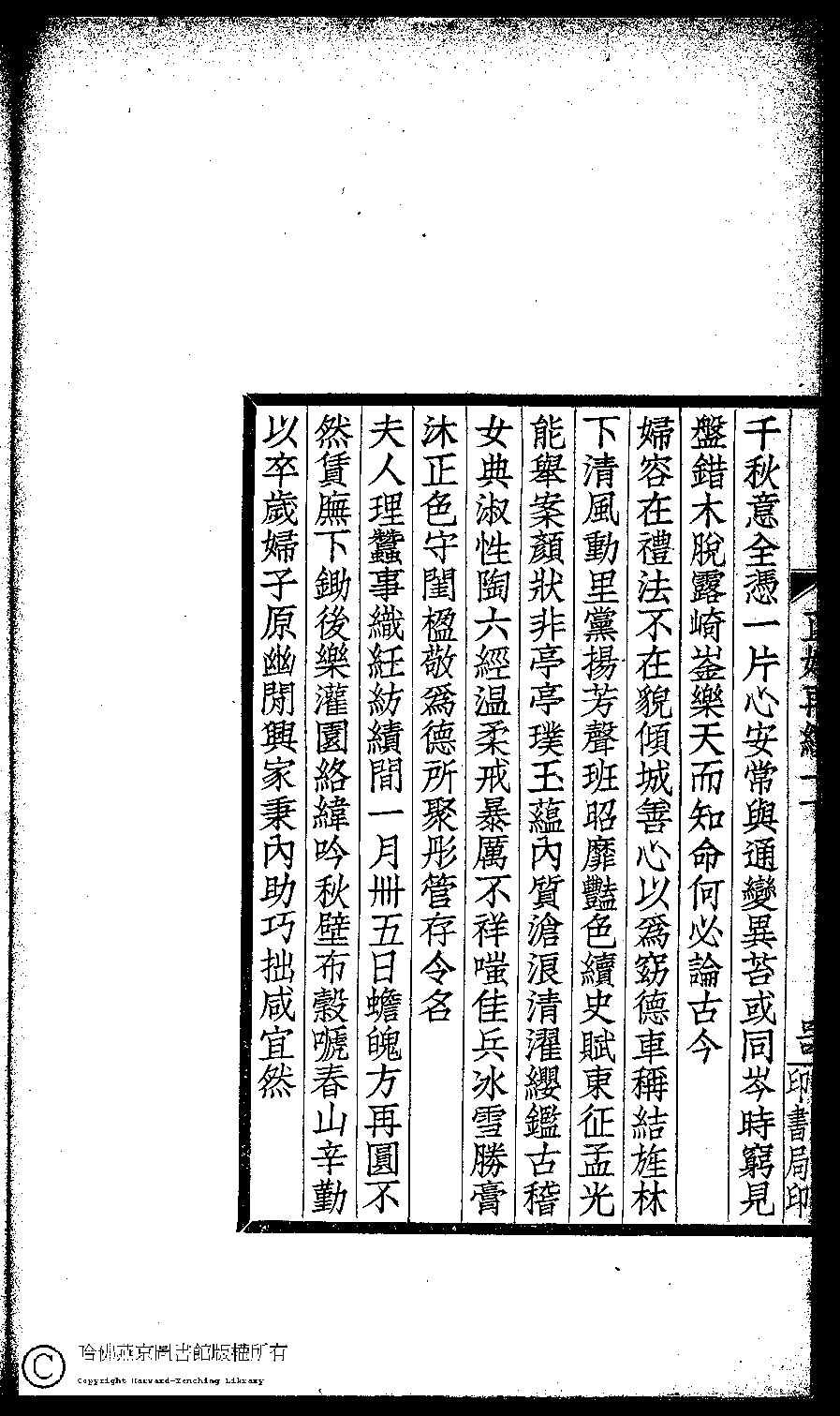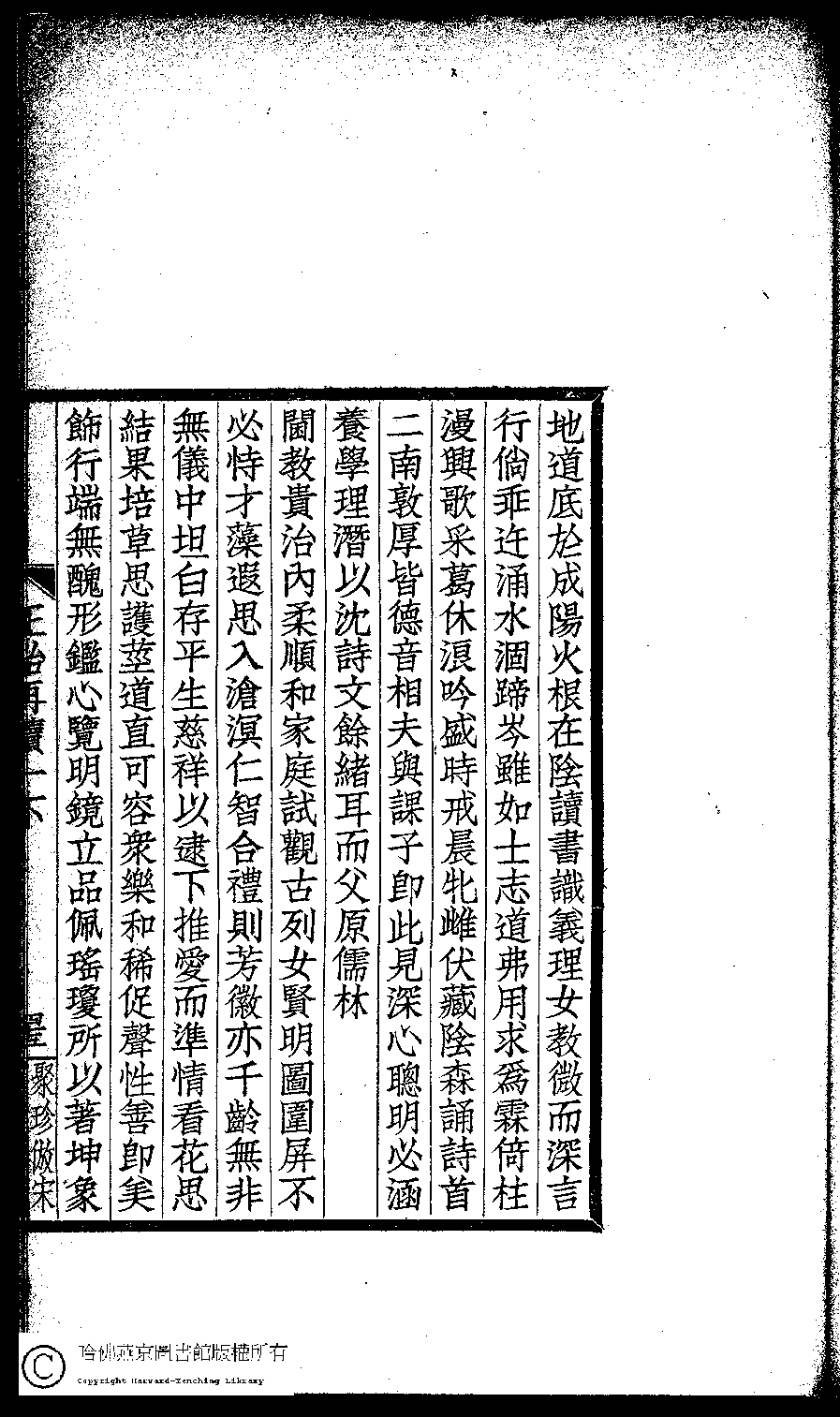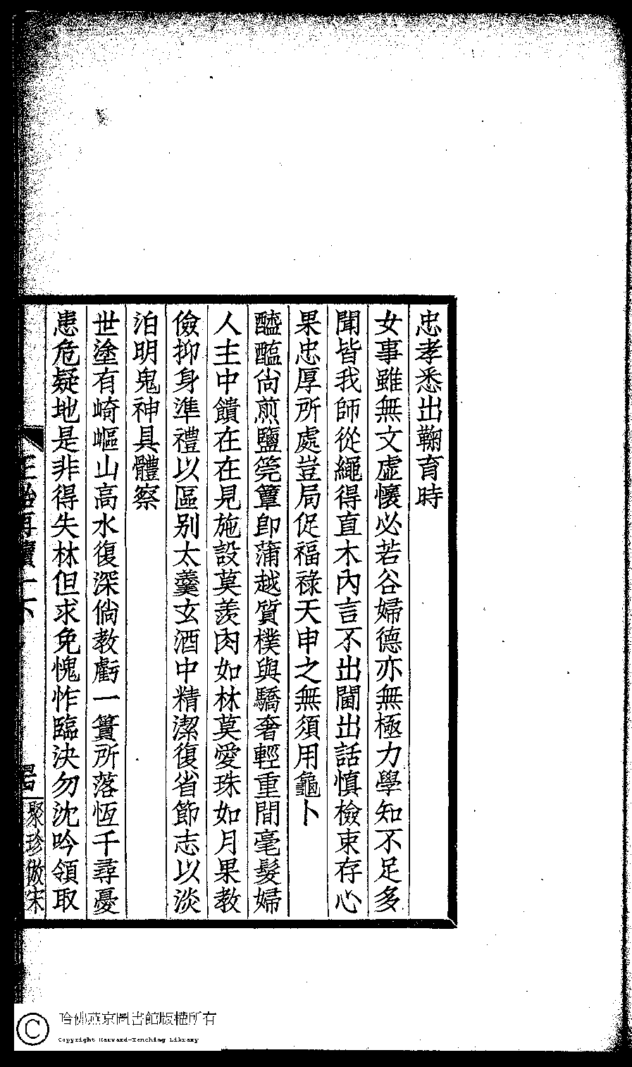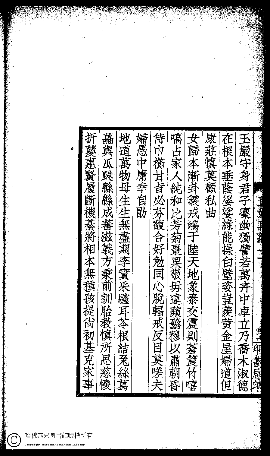 | 前既作課兒詩芸葒二女亦以為請余思吾國女教以貞順為主五千年來鮮有流弊晚近士夫倡興女學如陳相之見許行所誤恐不止毫釐千里已也二女從余既熟女誡女訓諸書因更朂以理義用張景陽雜詩韻作訓女詩十首 Qian ji zuo ke er shi yun hong er nü yi yi wei qing yu si wu guo nü jiao yi zhen shun wei zhu wu qian nian lai xian you liu bi wan jin shi fu chang xing nü xue ru Chen xiang zhi jian xu xing suo wu kong bu zhi hao li qian li yi ye er nü cong yu ji shu nü jie nü xun zhu shu yin geng xu yi li yi yong Zhang Jingyang za shi yun zuo Xun nü shi shi shou 詩 - 五言古詩 shi - wuyangushi 薛紹徽﹐號男姒﹐字秀玉 Xue Shaohui, hao: Nansi, zi: Xiuyu 閨秀正始再續集(民國單士釐輯) Gui xiu zheng shi zai xu ji , pp. 一下.43a,一下.43b,一下.44a,一下.44b,一下.45a,一下.45b. |