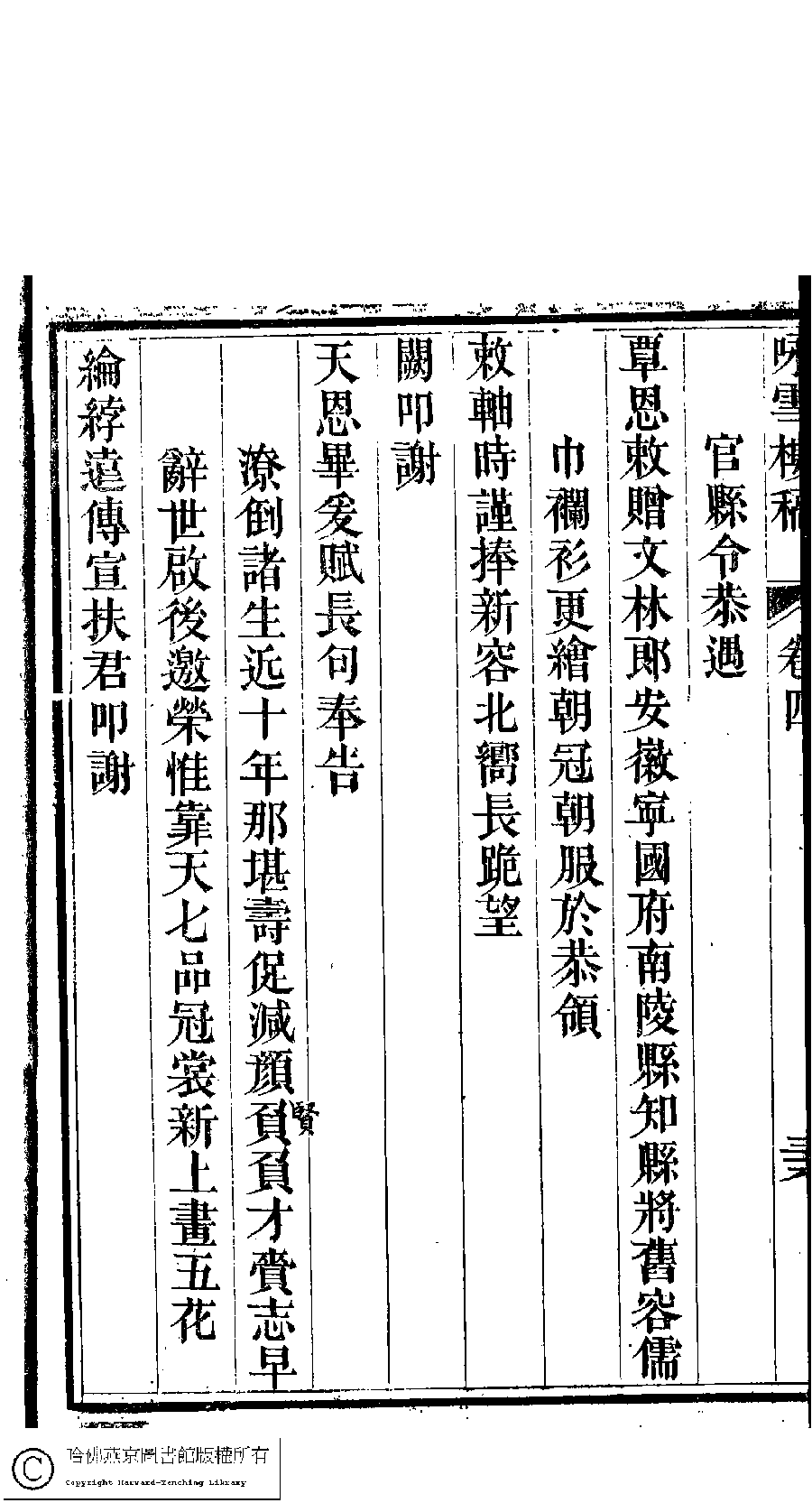 | 先夫謝世歷今三十有六年矣嘉慶己巳以次兒官縣令恭遇覃恩敕贈文林郎安徽寧國府南陵縣知縣將舊容儒巾襴衫更繪朝冠朝服於恭領敕軸時謹捧新容北嚮長跪望闕叩謝天恩畢爰賦長句奉告 Xian fu xie shi li jin san shi you liu nian yi Jiaqing ji si yi ci er guan xian ling gong yu tan en chi zeng wen lin lang Anhui Ning guo Fu Nanling Xian zhi xian jiang jiu rong ru jin lan shan geng hui chao guan chao fu yu gong ling chi zhou shi jin peng xin rong bei xiang chang gui wang que kou xie tian en bi yuan fu chang ju feng gao 詩 - 七言律詩 shi - qiyanlüshi 甘立媃﹐字如玉 Gan Lirou, zi: Ruyu 詠雪樓稿﹕五卷,卷首一卷,附一卷(清甘立媃撰) Yong xue lou gao: 5 juan, juan shou 1 juan, fu 1 juan ( by Gan lirou, Qing dynasty) , pp. 4.38a,4.39a,4.39b. |