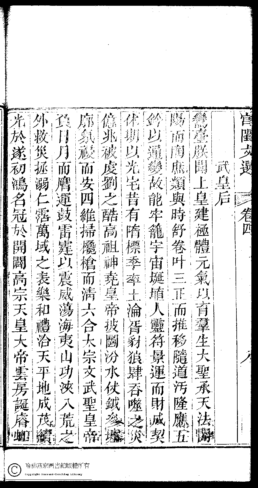 | 改元光宅赦文 Gai yuan guang zhai she wen 文﹕文 Wen: Wen 武則天﹐號媚娘﹐又名曌, 武后, 武皇后 Wu Zetian, hao: Meiniang 宮閨文選:二十六卷,姓氏小錄 : 一卷(清周壽昌輯訂) Gong gui wen xuan: 26 juan, Xing shi xiao lu: 1 juan (edited by Zhou Shouchang) , pp. 4.10a,4.10b,4.11a,4.11b,4.12a,4.12b,4.13a,4.8a,4.8b,4.9a,4.9b. |