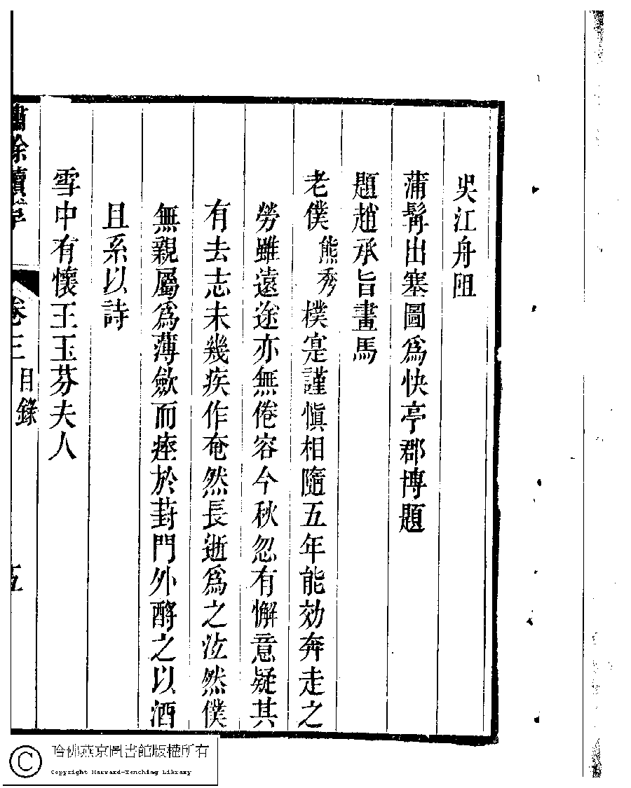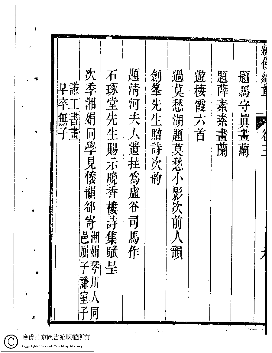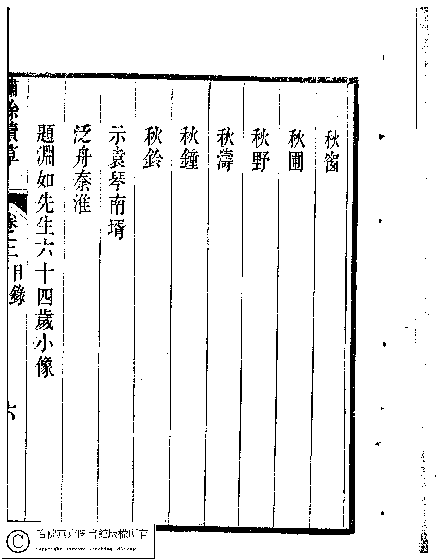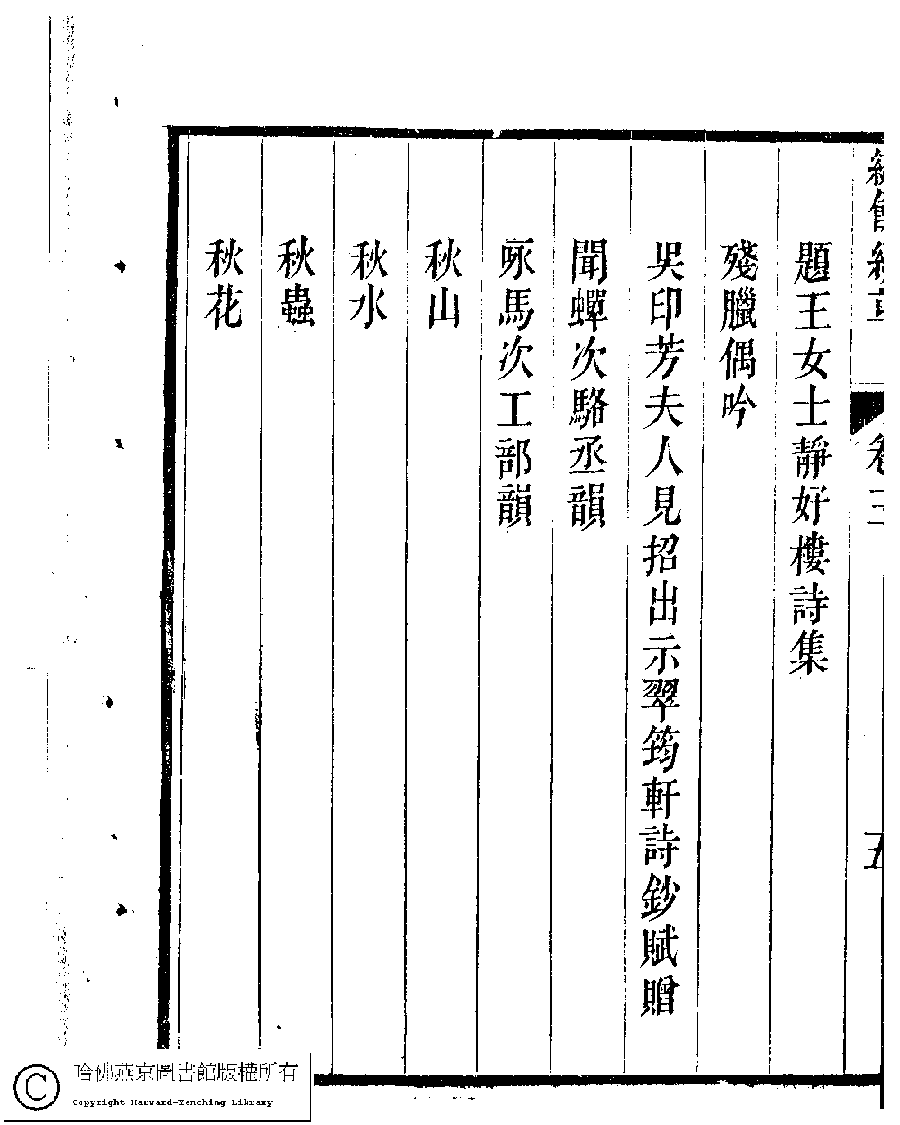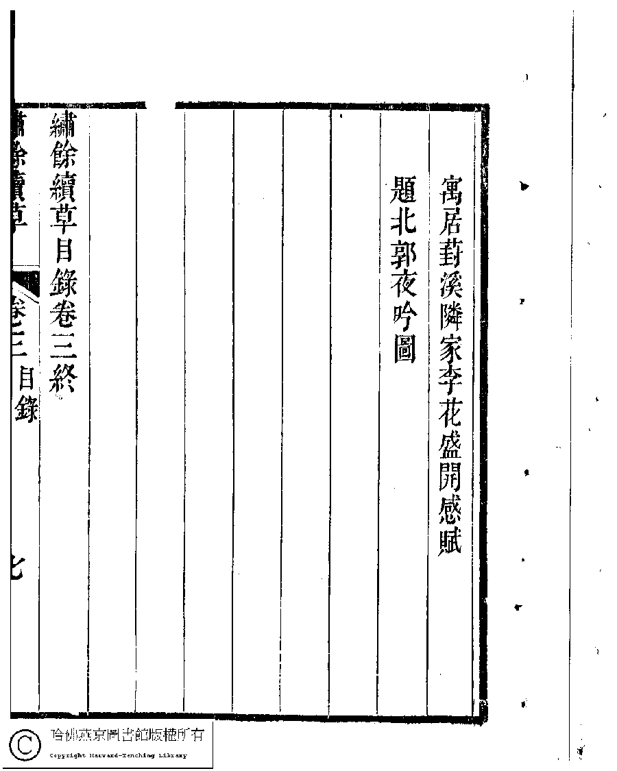 繡餘續草﹕五卷(清歸懋儀撰) Xiu yu xu cao: 5 juan (by Gui Maoyi, Qing dynasty) , pp. 3.目錄.1a,3.目錄.1b,3.目錄.2a,3.目錄.2b,3.目錄.3a,3.目錄.3b,3.目錄.4a,3.目錄.4b,3.目錄.5a,3.目錄.5b,3.目錄.6a,3.目錄.6b,3.目錄.7a,3.目錄.7b.