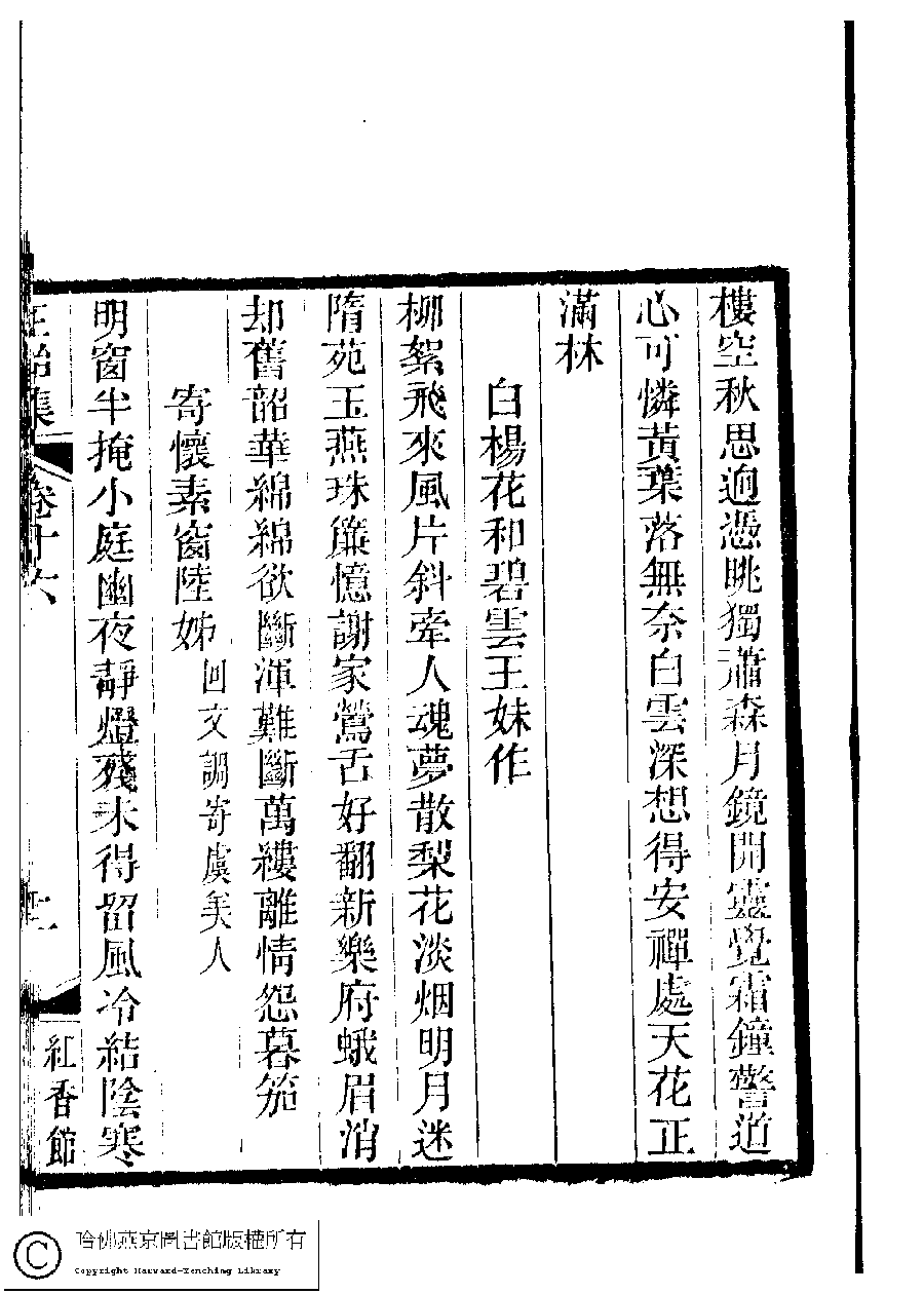 | 秋夜懷寂居禪友 Qiu ye huai ji ju chan you 詩 - 五言律詩 shi - wuyanlüshi 張芬﹐字紫蘩﹐又名月樓 Zhang Fen, zi: Zifan 國朝閨秀正始集﹕二十卷﹐附錄﹕一卷﹐補遺﹕一卷﹐又附題詞﹕一卷(清惲珠輯) Guo chao gui xiu zheng shi ji: 20 juan, fu lu: 1 juan, bu yi: 1 juan, you fu ti ci: 1 juan (edited by Yun Zhu, Qing dynasty) , pp. 16.1b,16.2a. |