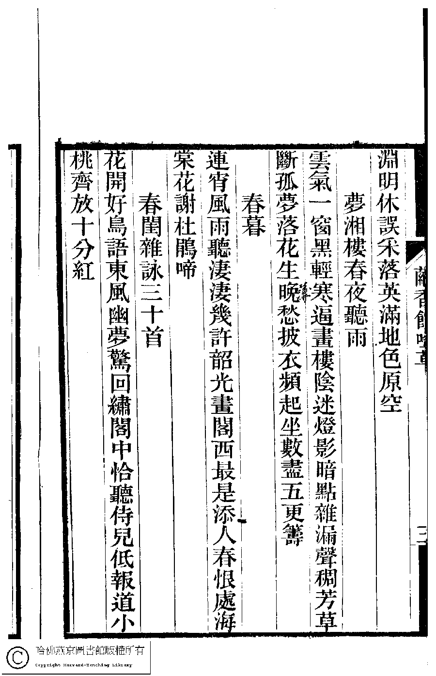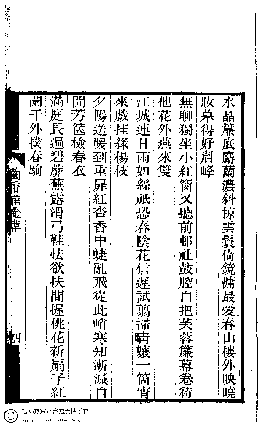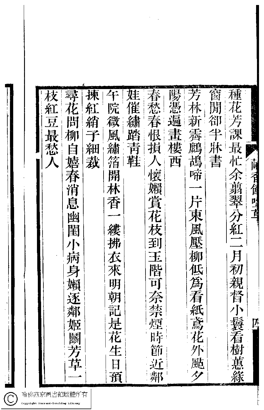 | 春閨雜詠三十首 Chun gui za yong san shi shou 詩 - 七言絕句 shi - qiyanjueju 宗粲﹐字倩宜﹐又名茝生,粲生 Zong Can, zi: Qianyi 夢湘樓詩稿﹕二卷﹐詞稿﹕一卷﹔繭香館吟艸﹕一卷﹐繡餘詞草﹕一卷(清宗婉等撰) Meng xiang lou shi gao: 2 juan, ci gao: 1 juan; jian xiang guan yin cao: 1 juan, xiu yu ci cao: 1 juan (by Zong Wan, Qing dynasty) , pp. 3b,4a,4b,5a,5b,6a,6b. |