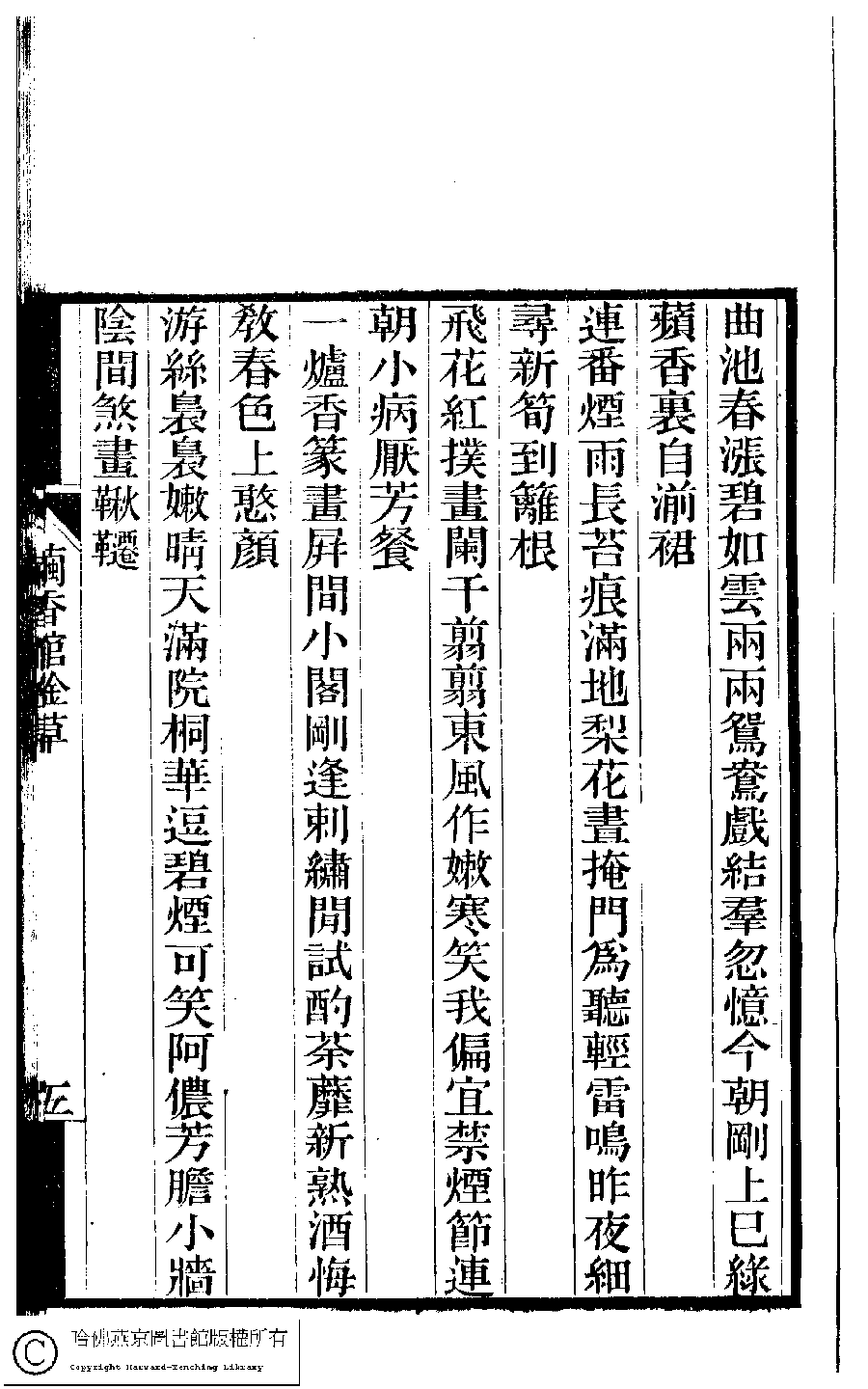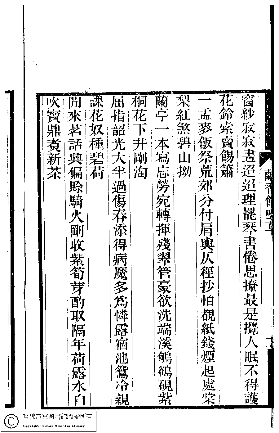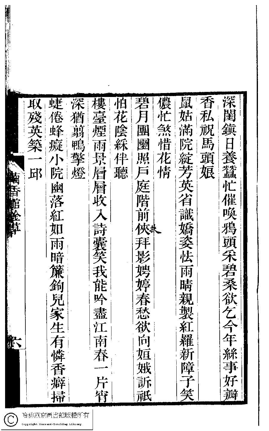 | 春閨雜詠三十首 Chun gui za yong san shi shou 詩 - 七言絕句 shi - qiyanjueju 宗粲﹐字倩宜﹐又名茝生,粲生 Zong Can, zi: Qianyi 夢湘樓詩稿﹕二卷﹐詞稿﹕一卷﹔繭香館吟艸﹕一卷﹐繡餘詞草﹕一卷(清宗婉等撰) Meng xiang lou shi gao: 2 juan, ci gao: 1 juan; jian xiang guan yin cao: 1 juan, xiu yu ci cao: 1 juan (by Zong Wan, Qing dynasty) , pp. 3b,4a,4b,5a,5b,6a,6b. |