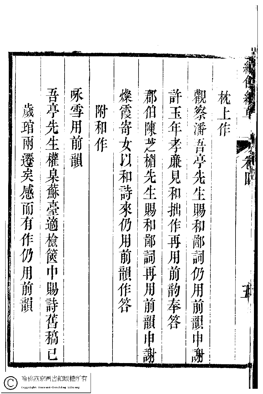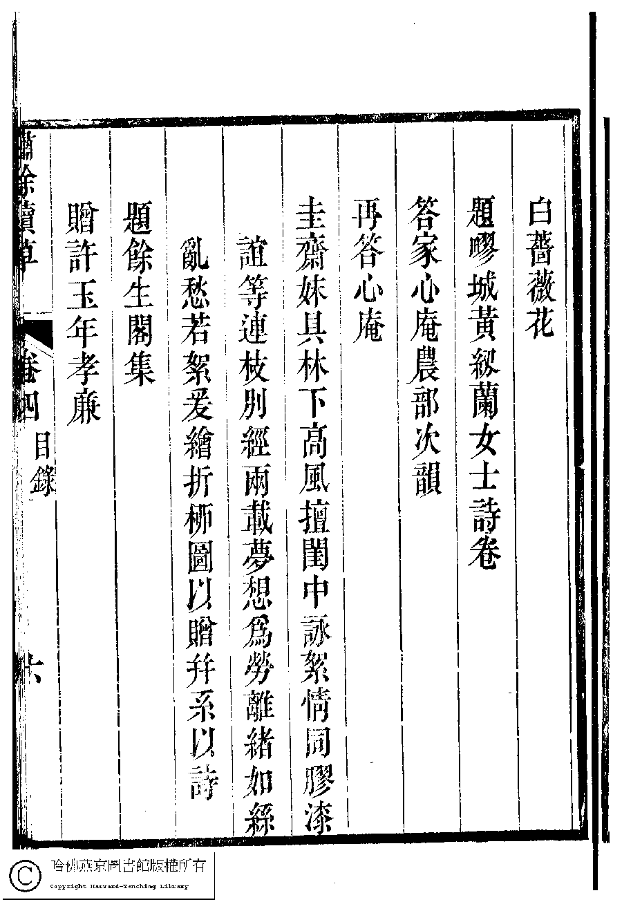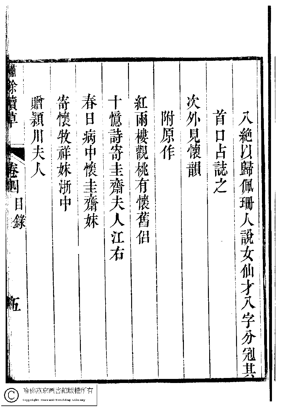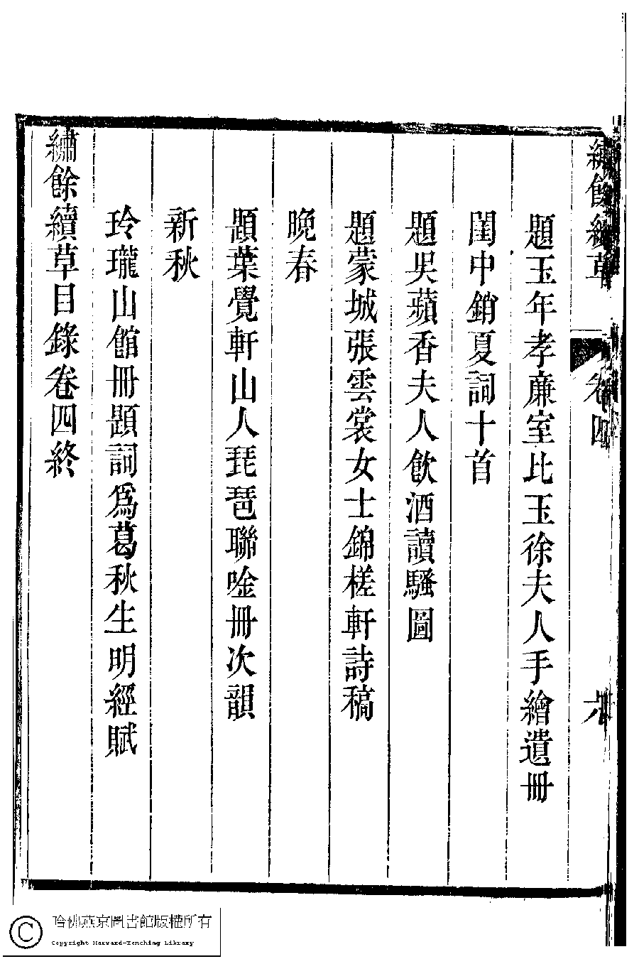 繡餘續草﹕五卷(清歸懋儀撰) Xiu yu xu cao: 5 juan (by Gui Maoyi, Qing dynasty) , pp. 4.目錄.1a,4.目錄.1b,4.目錄.2a,4.目錄.2b,4.目錄.3a,4.目錄.3b,4.目錄.4a,4.目錄.4b,4.目錄.5a,4.目錄.5b,4.目錄.6a,4.目錄.6b.