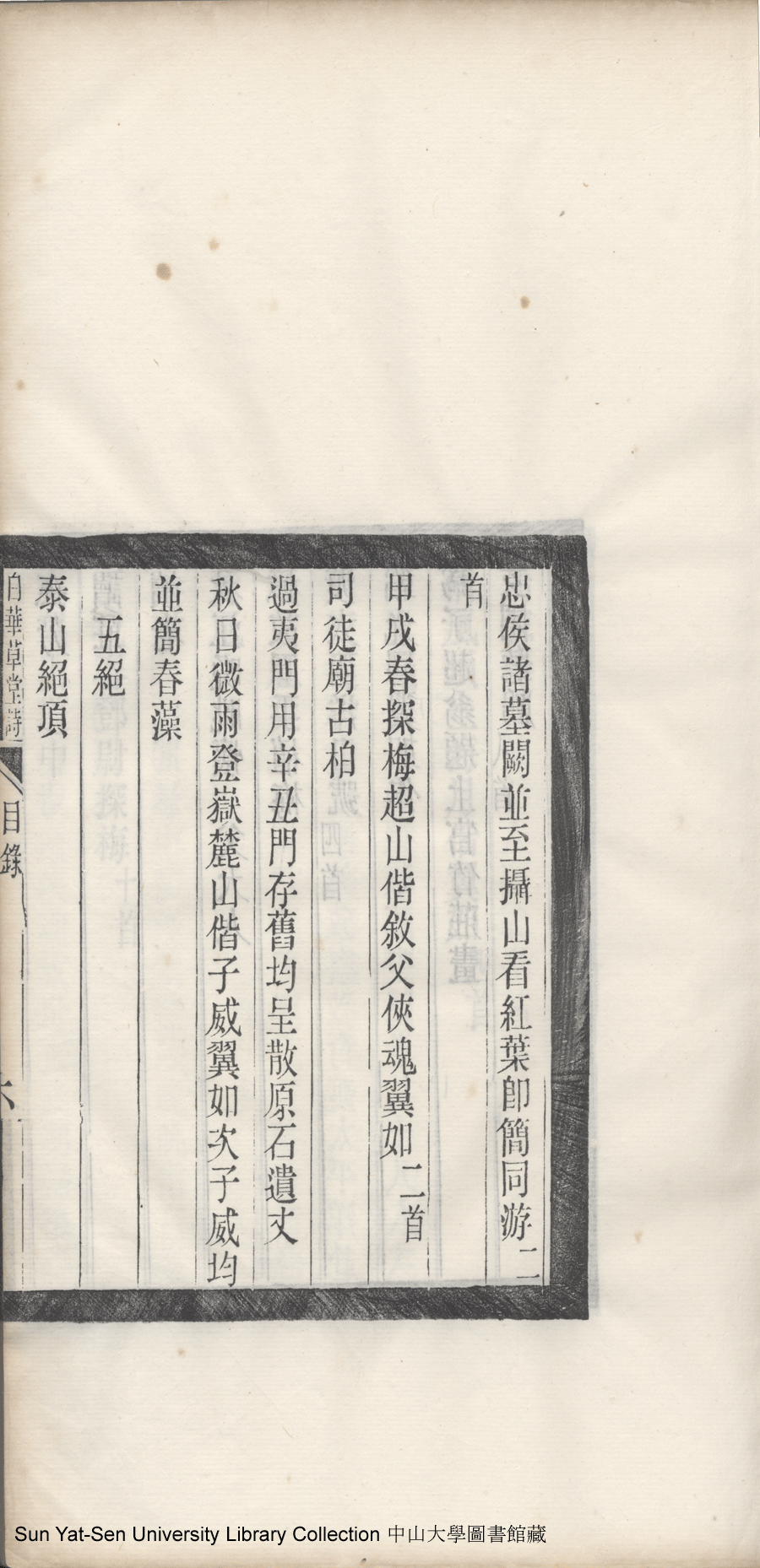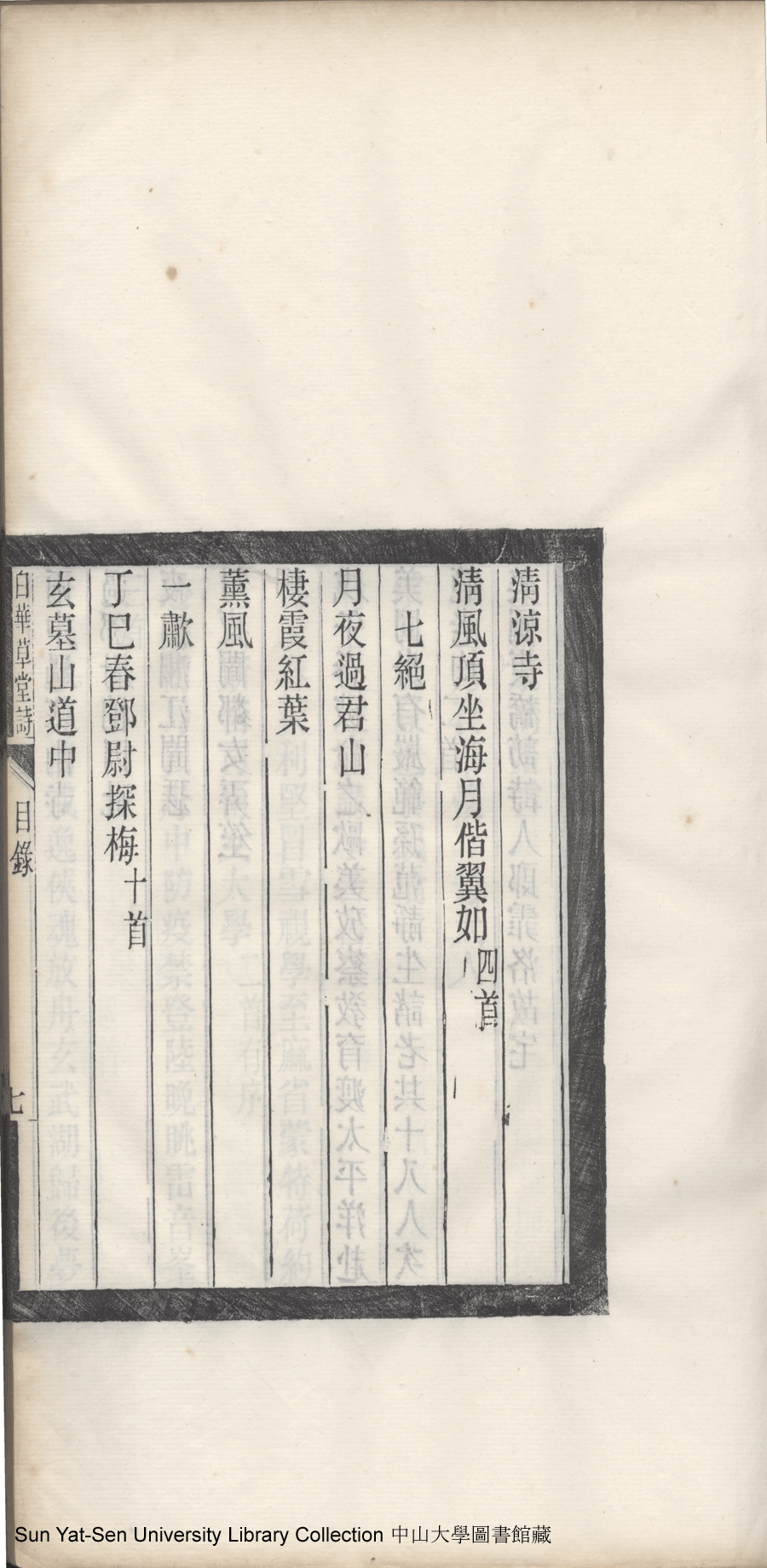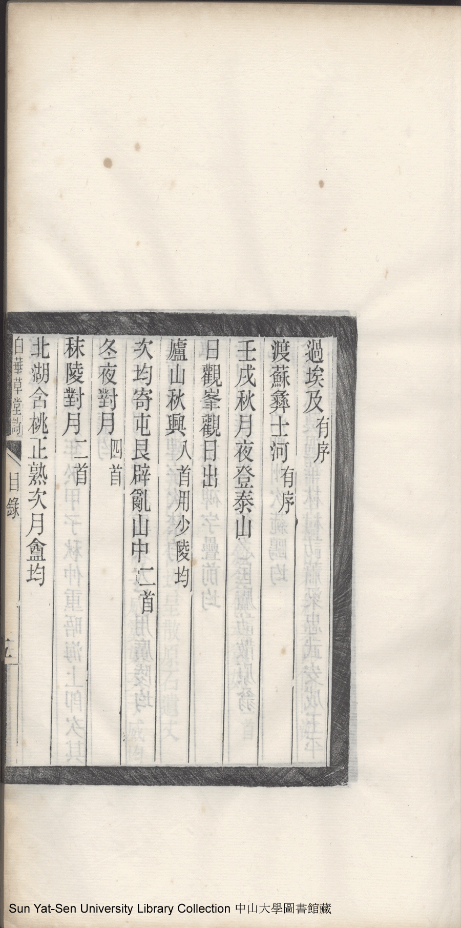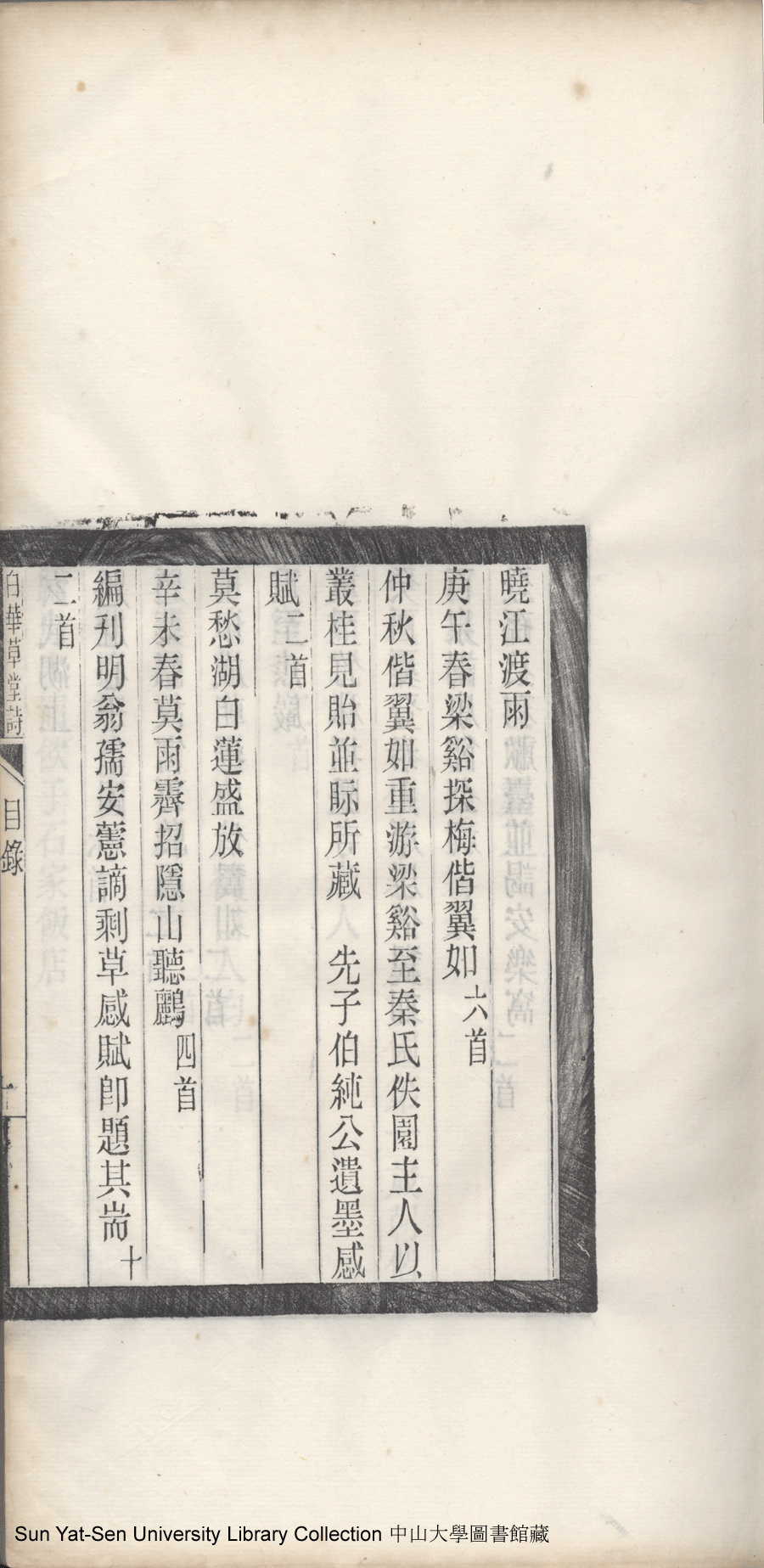 | 白華草堂詩目錄 Bai hua cao tang shi mu lu 白華草堂詩:六卷,玉尺樓詩:一卷(清張昭漢撰) Bai hua cao tang shi: 6 juan, Yu chi lou shi: 1 juan(by Zhang Zhaohan, Qing dynasty) , pp. 目錄10a,目錄10b,目錄11a,目錄11b,目錄1a,目錄1b,目錄2a,目錄2b,目錄3a,目錄3b,目錄4a,目錄4b,目錄5a,目錄5b,目錄6a,目錄6b,目錄7a,目錄7b,目錄8a,目錄8b,目錄9a,目錄9b. |