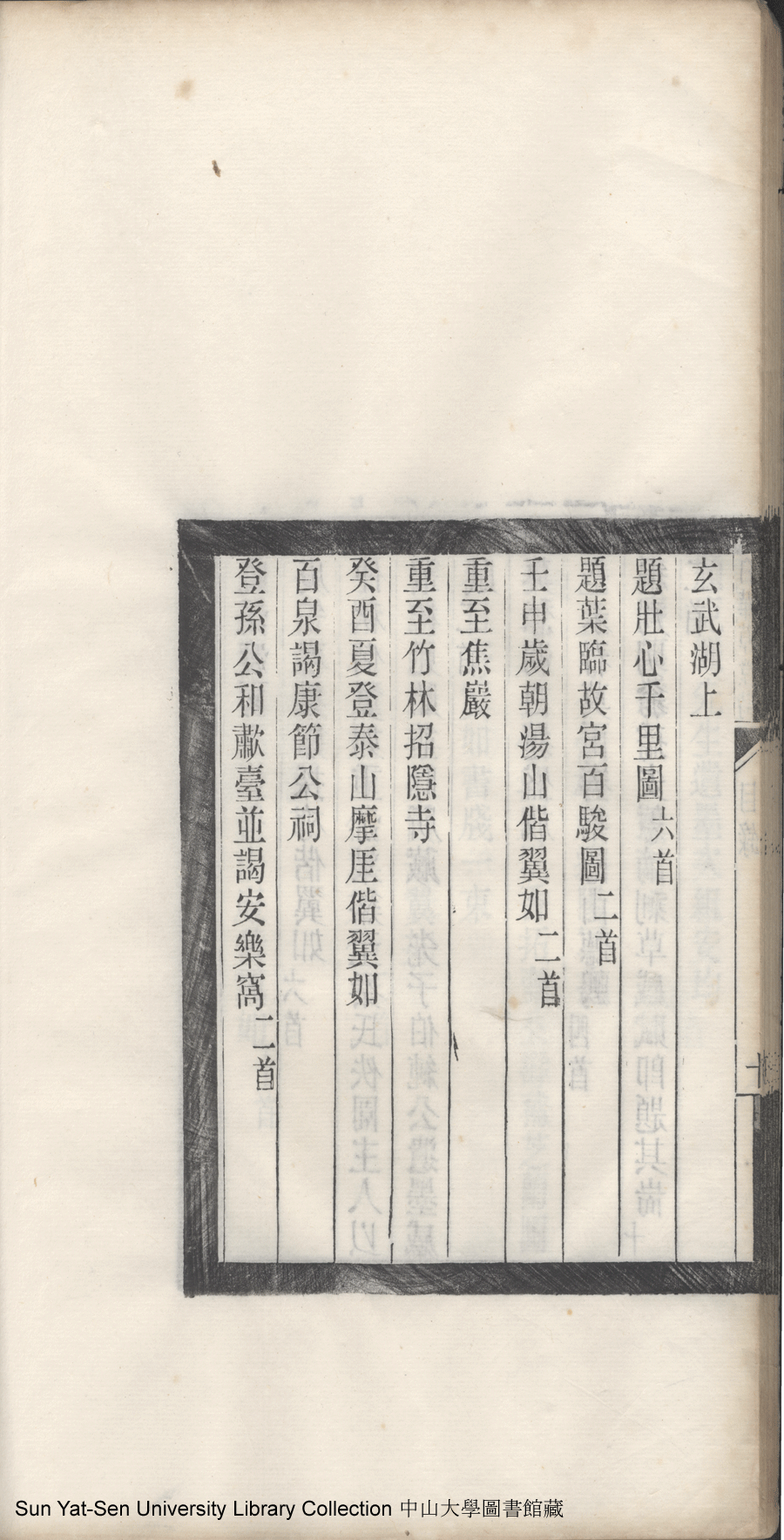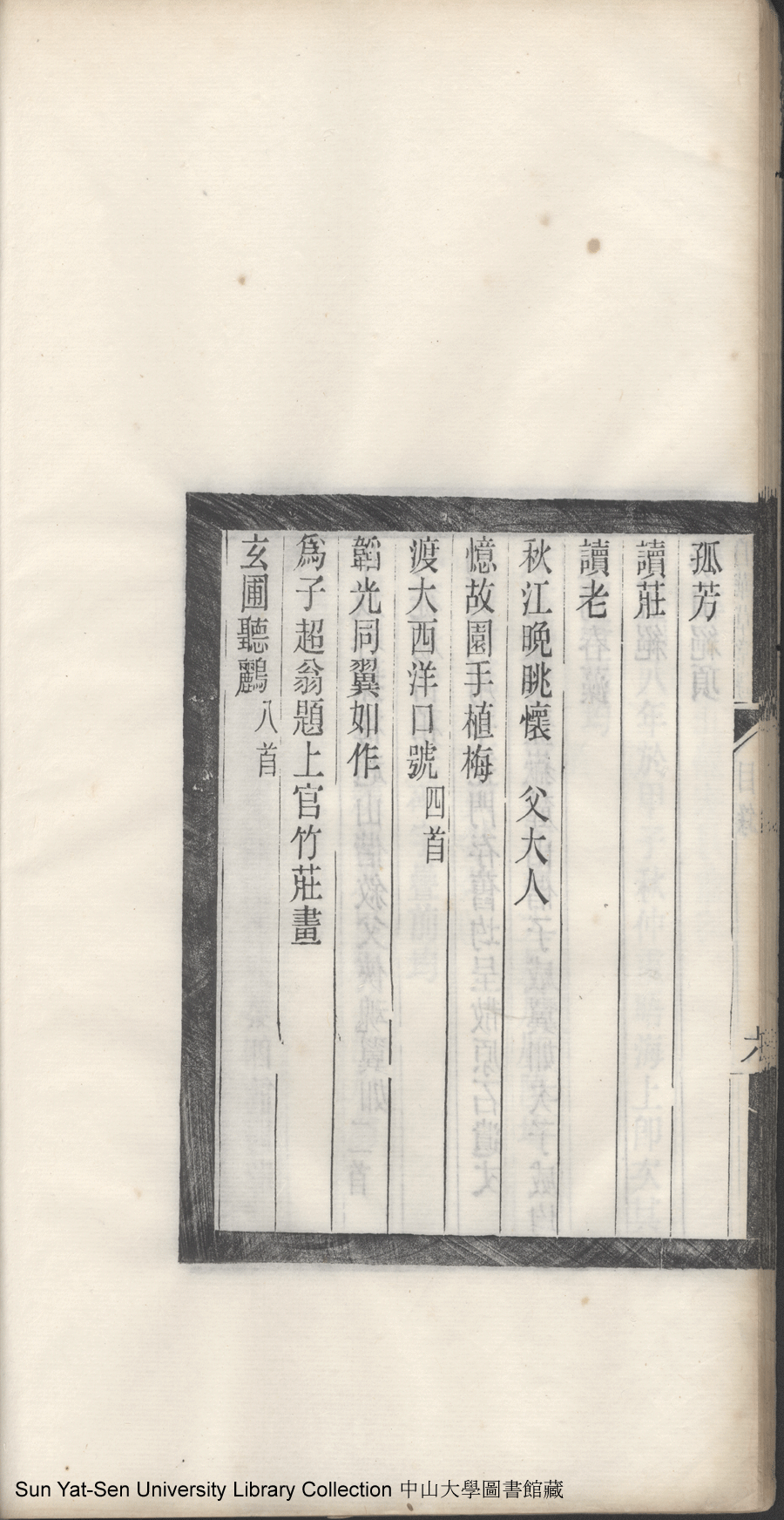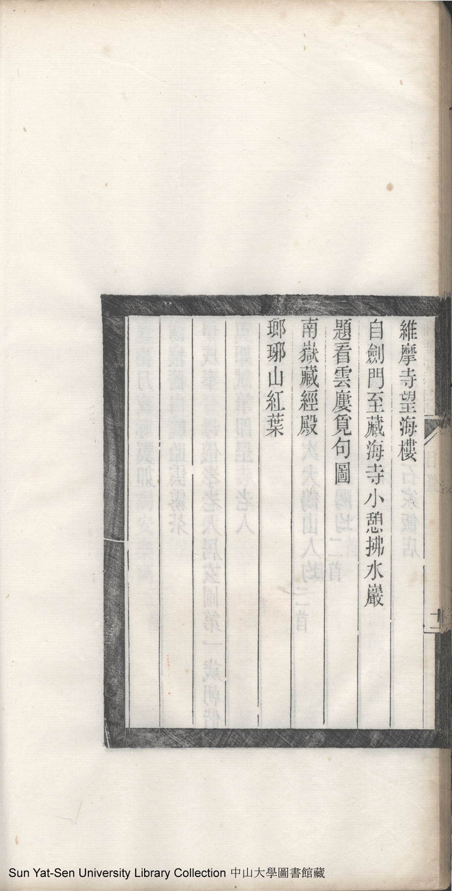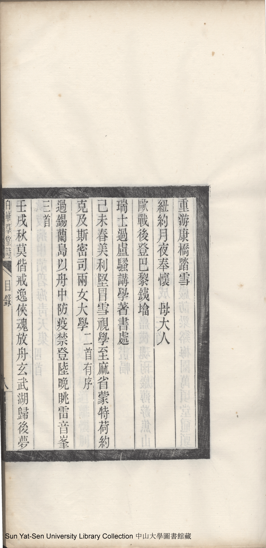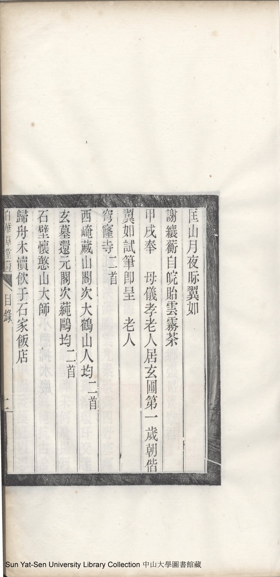 | 白華草堂詩目錄 Bai hua cao tang shi mu lu 白華草堂詩:六卷,玉尺樓詩:一卷(清張昭漢撰) Bai hua cao tang shi: 6 juan, Yu chi lou shi: 1 juan(by Zhang Zhaohan, Qing dynasty) , pp. 目錄10a,目錄10b,目錄11a,目錄11b,目錄1a,目錄1b,目錄2a,目錄2b,目錄3a,目錄3b,目錄4a,目錄4b,目錄5a,目錄5b,目錄6a,目錄6b,目錄7a,目錄7b,目錄8a,目錄8b,目錄9a,目錄9b. |
