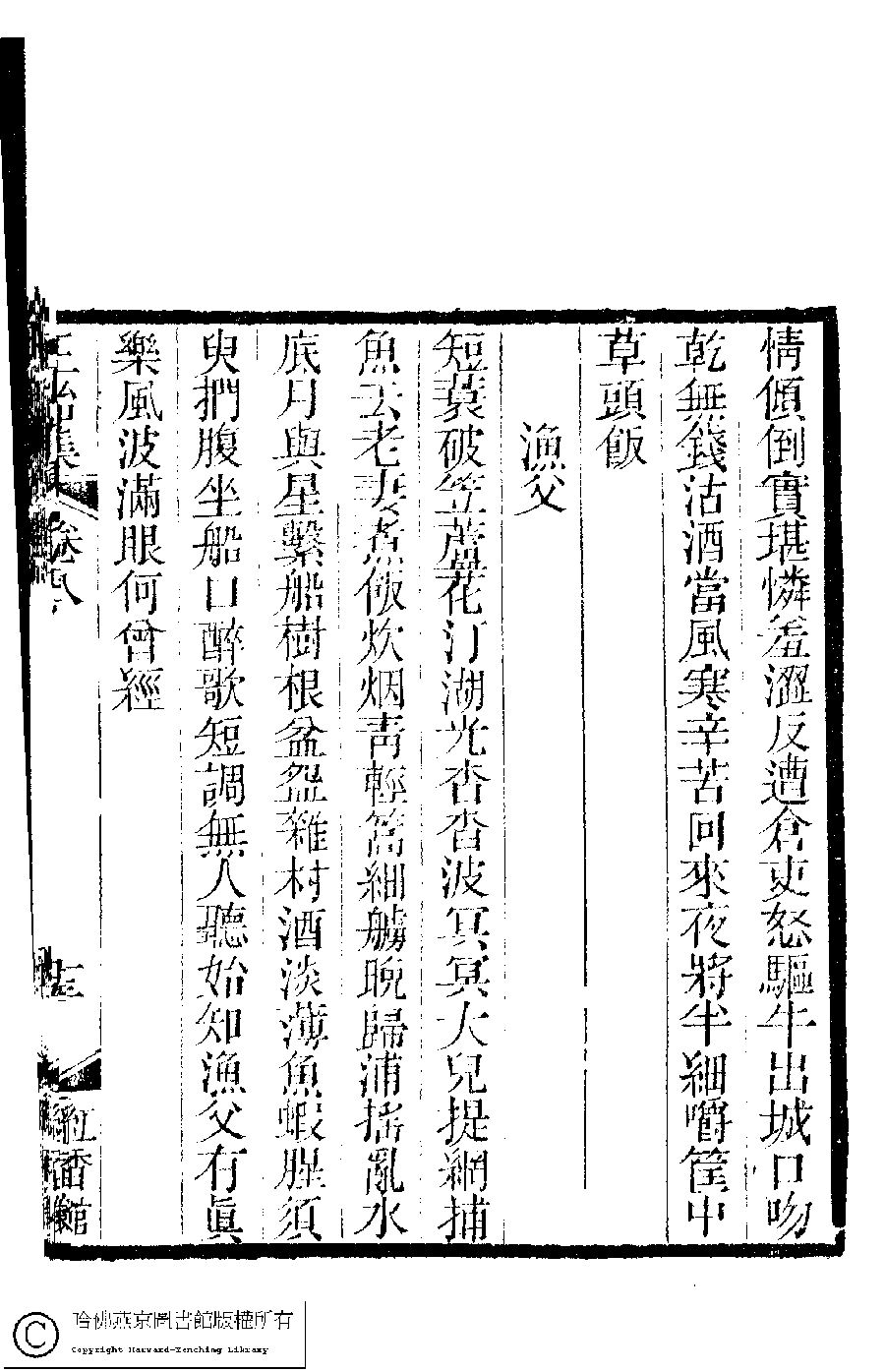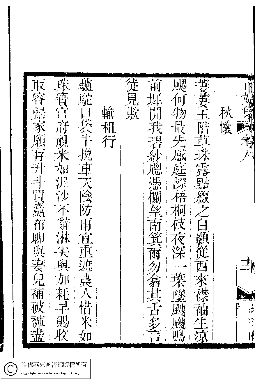 | 輸租行 Shu zu xing 詩 - 樂府 shi - yuefu 高景芳﹐字遠芬 Gao Jingfang, zi: Yuanfen 國朝閨秀正始集﹕二十卷﹐附錄﹕一卷﹐補遺﹕一卷﹐又附題詞﹕一卷(清惲珠輯) Guo chao gui xiu zheng shi ji: 20 juan, fu lu: 1 juan, bu yi: 1 juan, you fu ti ci: 1 juan (edited by Yun Zhu, Qing dynasty) , pp. 8.12b,8.13a. |
