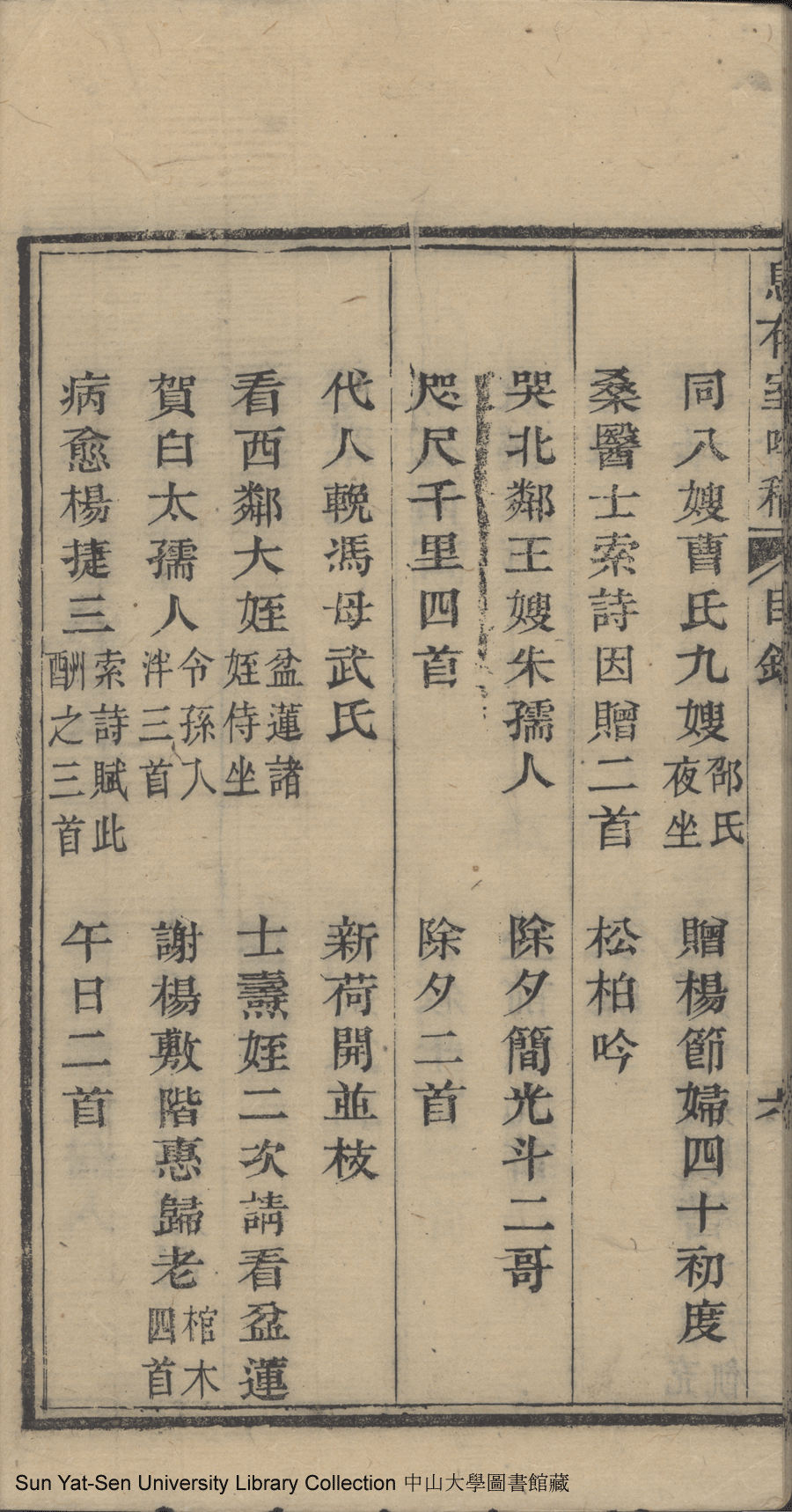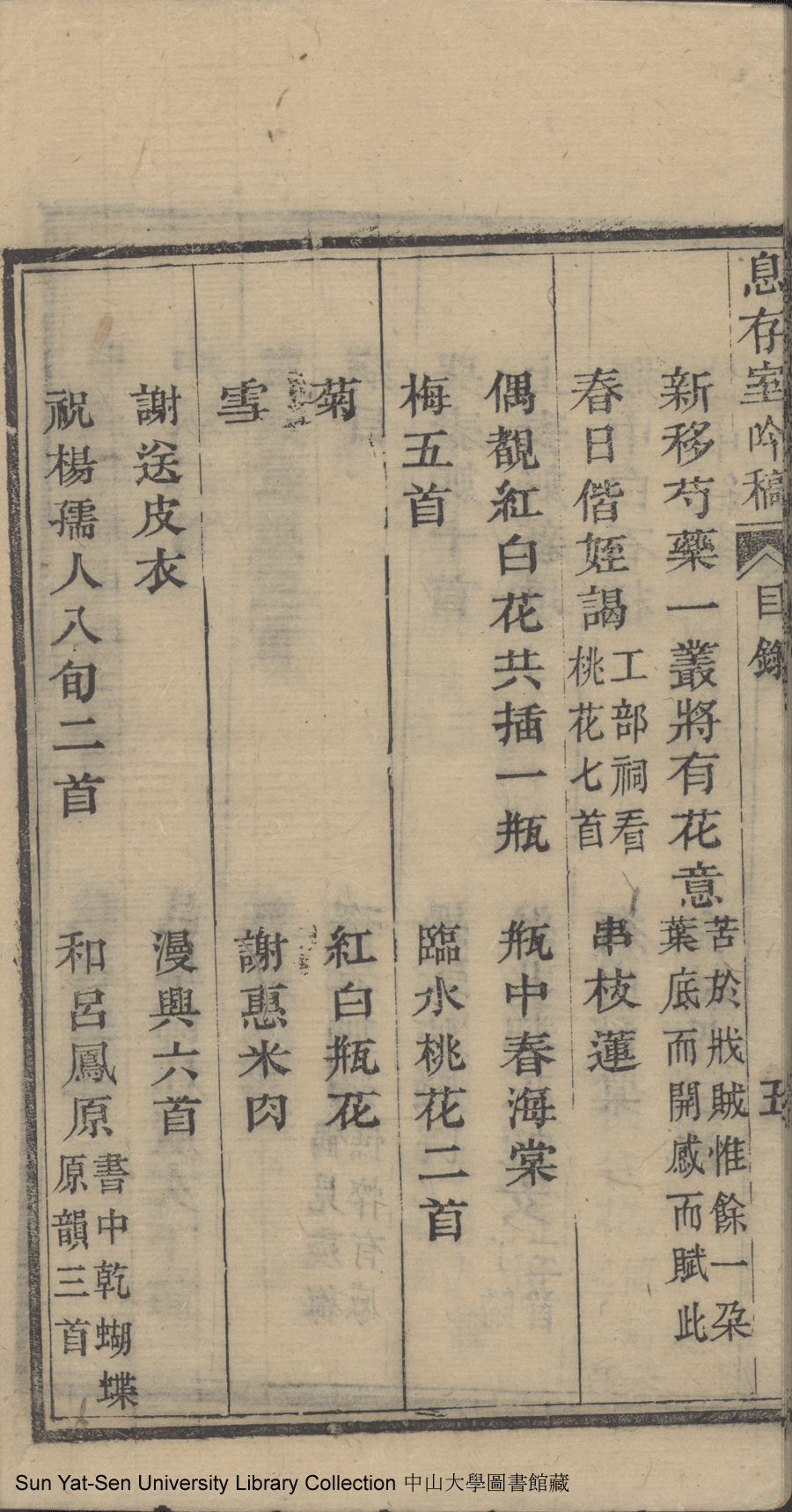 息存室吟稿初集一卷續集一卷:二卷(清杭溫如撰) Xi cun shi yin gao chu ji yi juan xu ji yi juan: 2 juan (by Hang Wenru, Qing Dynasty) , pp. 目錄1a,目錄1b,目錄2a,目錄2b,目錄3a,目錄3b,目錄4a,目錄4b,目錄5a,目錄5b,目錄6a,目錄6b,目錄7a,目錄7b.