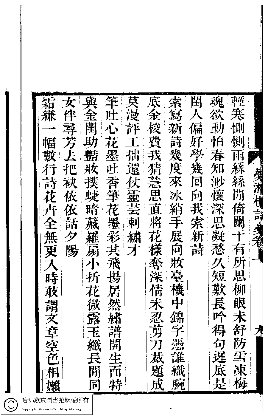 | 壬寅上元前二日閨人有以素袖索題者時值春陰已久烟雨迷離觸景興懷率成四律詞之工拙所不計也(四首) Ren yin shang yuan qian er ri gui ren you yi su xiu suo ti zhe shi zhi chun yin yi jiu yan yu mi li chu jing xing huai shuai cheng si lü ci zhi gong zhuo suo bu ji ye 詩 shi 宗婉﹐字婉生 Zong Wan, zi: Wansheng 夢湘樓詩稿﹕二卷﹐詞稿﹕一卷﹔繭香館吟艸﹕一卷﹐繡餘詞草﹕一卷(清宗婉等撰) Meng xiang lou shi gao: 2 juan, ci gao: 1 juan; jian xiang guan yin cao: 1 juan, xiu yu ci cao: 1 juan (by Zong Wan, Qing dynasty) , pp. 上.10a,上.9a,上.9b. |