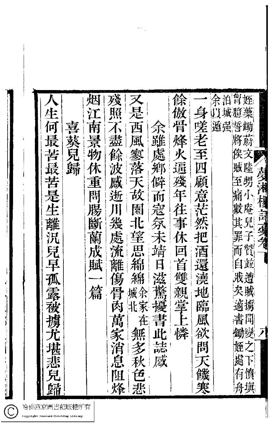 | 喜葵兒歸 Xi Kui er gui 詩 - 五言古詩 shi - wuyangushi 宗婉﹐字婉生 Zong Wan, zi: Wansheng 夢湘樓詩稿﹕二卷﹐詞稿﹕一卷﹔繭香館吟艸﹕一卷﹐繡餘詞草﹕一卷(清宗婉等撰) 夢湘樓詩稿﹕二卷﹐詞稿﹕一卷 Meng xiang lou shi gao: 2 juan, ci gao: 1 juan; jian xiang guan yin cao: 1 juan, xiu yu ci cao: 1 juan (by Zong Wan, Qing dynasty) Meng xiang lou shi gao: yi juan, ci gao: 1 juan, pp. 下.8b,下.9a. |