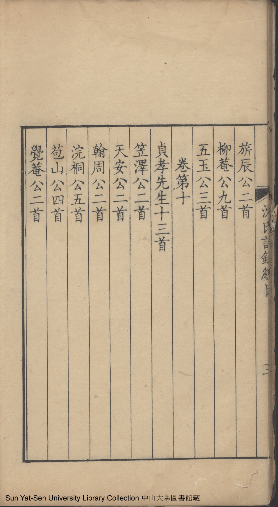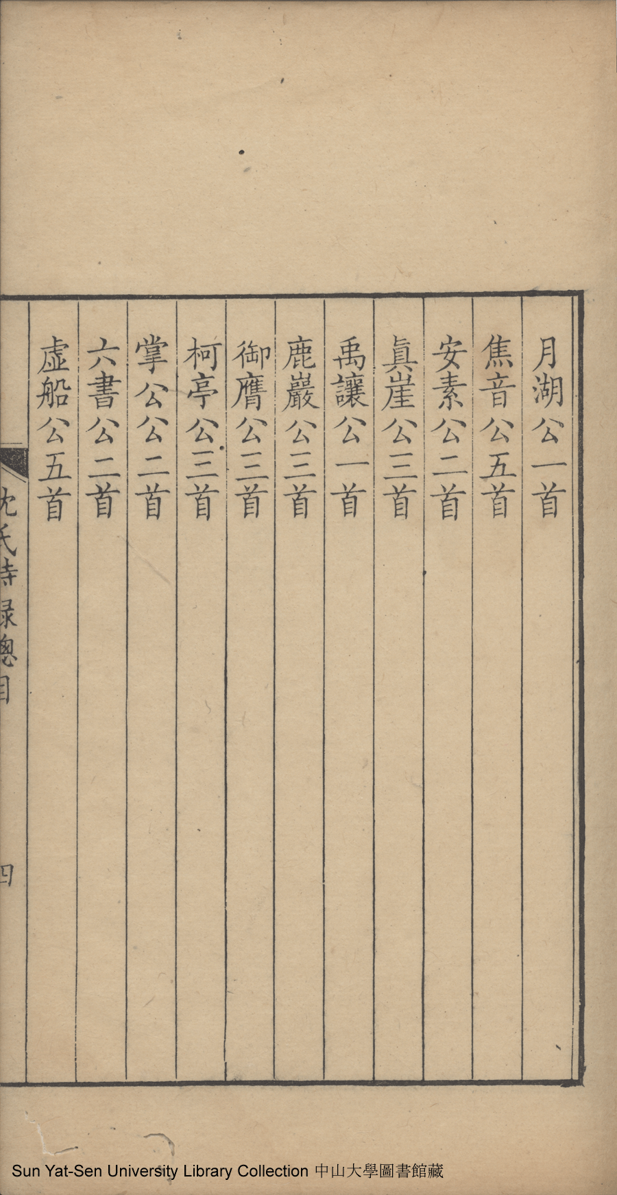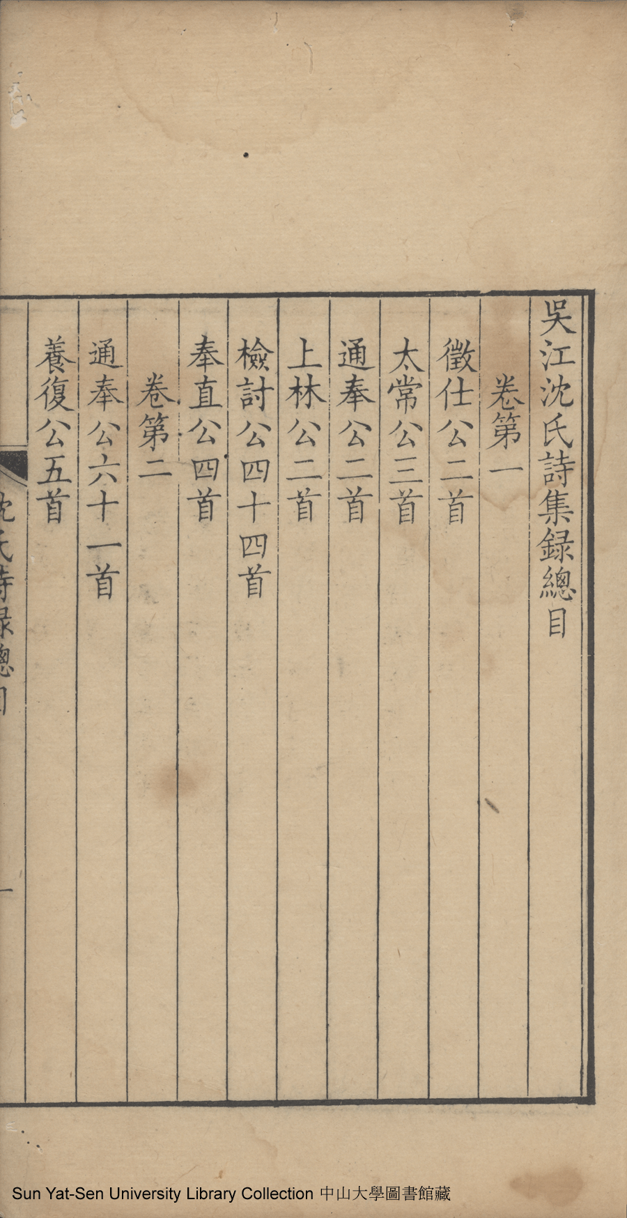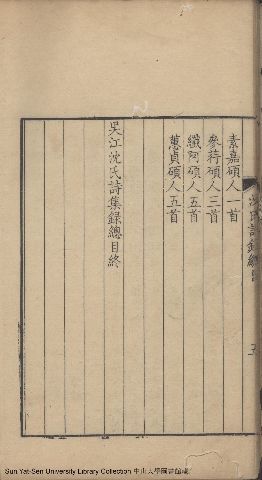 吳江沈氏詩集:十二卷(清沈祖禹輯) Wujiang Shen shi shi ji: 12 juan (by Shen Zuyu, Qing dynasty , pp. 總目1a,總目1b,總目2a,總目2b,總目3a,總目3b,總目4a,總目4b,總目5a,總目5b.
