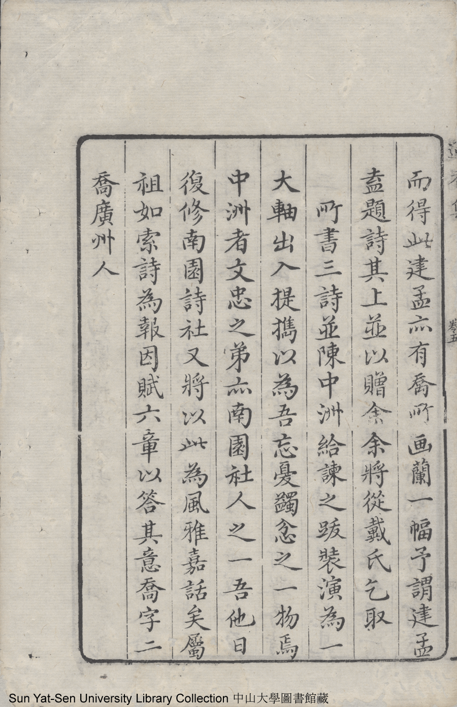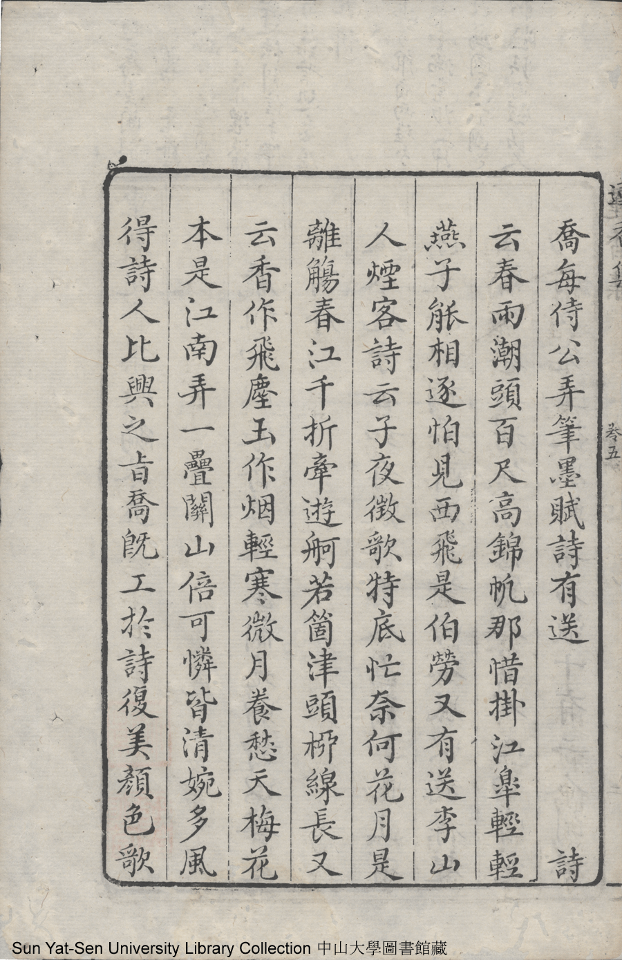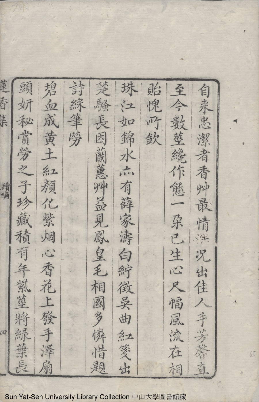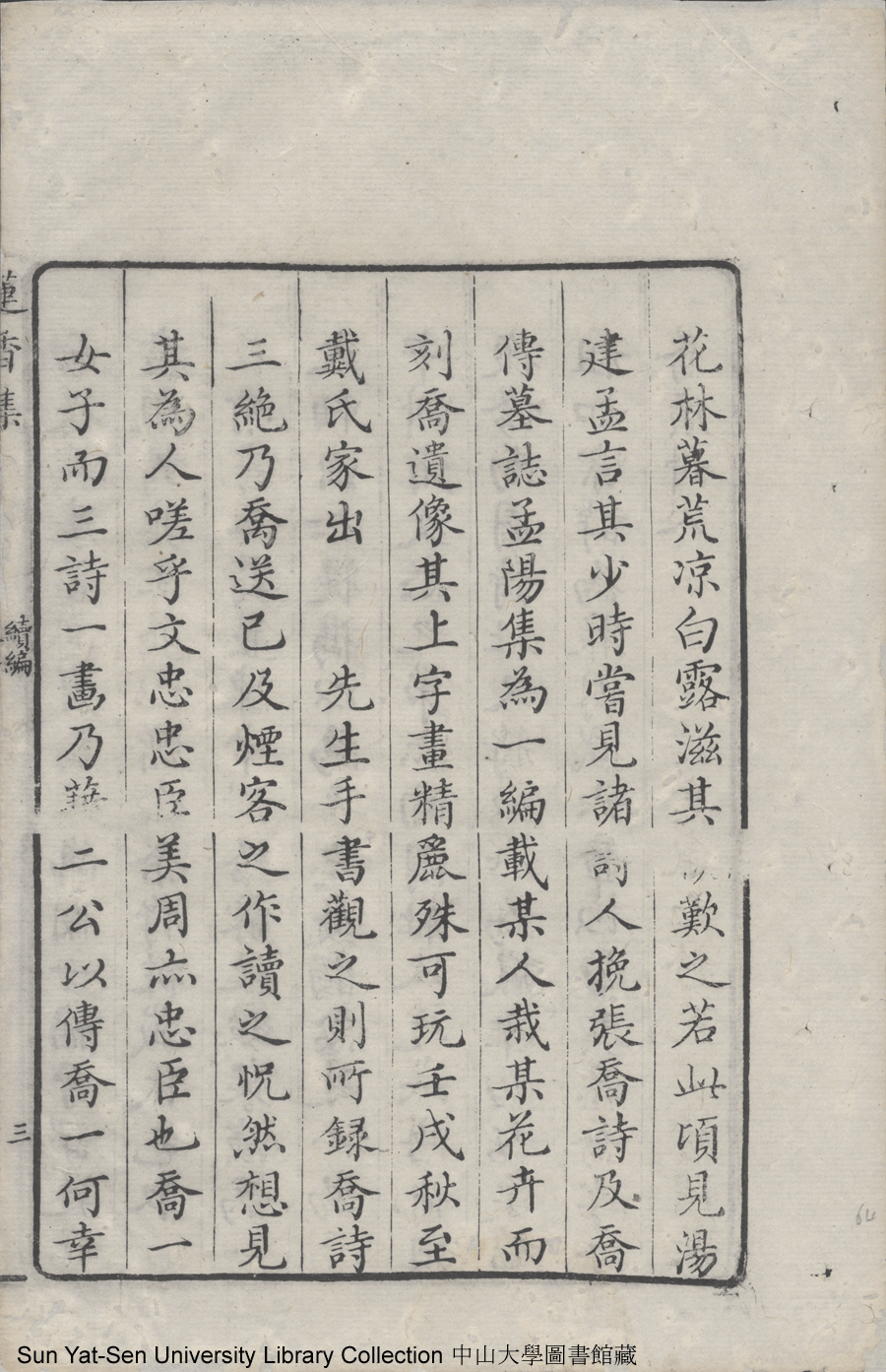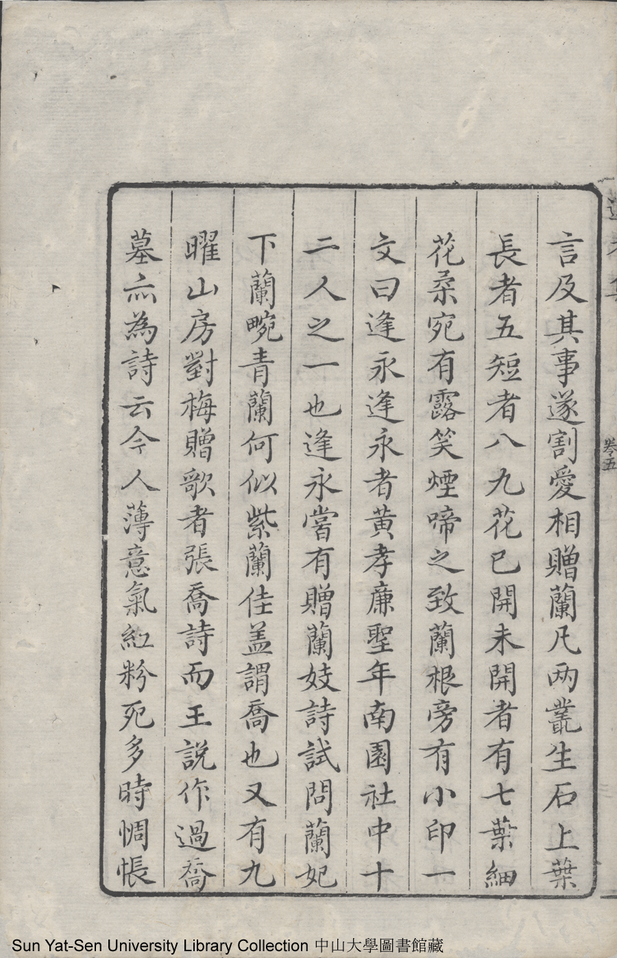 | 龐祖如以張喬美人畫蘭見贈詩以答之有序(六首) Pang Zuru yi Zhang Qiao mei ren hua lan jian zeng shi yi da zhi you xu (liu shou) 詩 - 五言律詩 shi - wuyanlüshi 屈大均﹐號三外野人﹐字翁山﹐又名泠君,介子 Qu Dajun, hao: Sanwaiyeren, zi: Wengshan 蓮香集:五卷(明張喬撰) Lian xiang ji: 5 juan (by Zhang Qiao, Ming Dynasty) , pp. 卷五1a,卷五1b,卷五2a,卷五2b,卷五3a,卷五3b,卷五4a,卷五4b,卷五5a. |