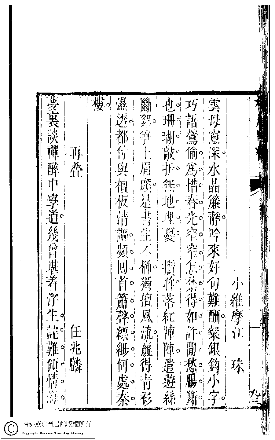 | 前調[鳳皇臺上憶吹簫] : 奉和林屋散仙題浣紗詞卷 Qian diao[Feng huang tai shang yi chui xiao] : Feng he Linwusanxian ti Huan sha ci juan 詞 ci 江珠﹐字碧岑﹐又名小維摩 Jiang Zhu, zi: Bicen 吳中女士詩鈔(清任兆麟輯,張滋蘭選) 翡翠樓集﹕一卷﹐浣紗詞﹕一卷 Wu zhong nü shi shi chao (edited by Ren Zhaolin, Qing dynasty) Fei cui lou ji: 1 juan, huan sha ci: 1 juan, pp. 翡翠樓.20a,翡翠樓.20b. |