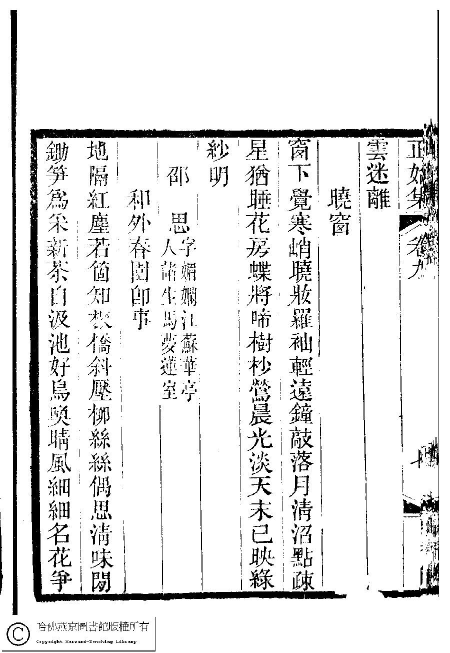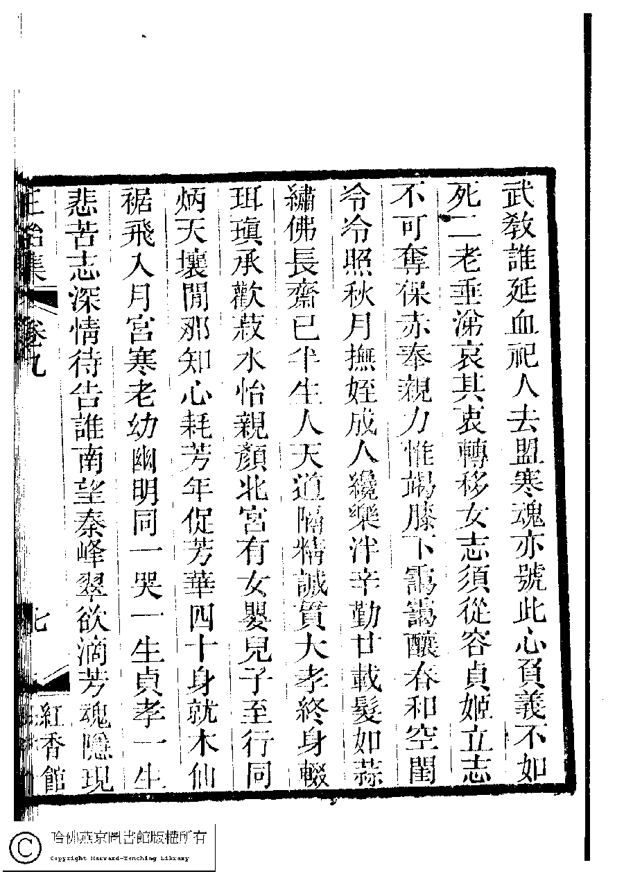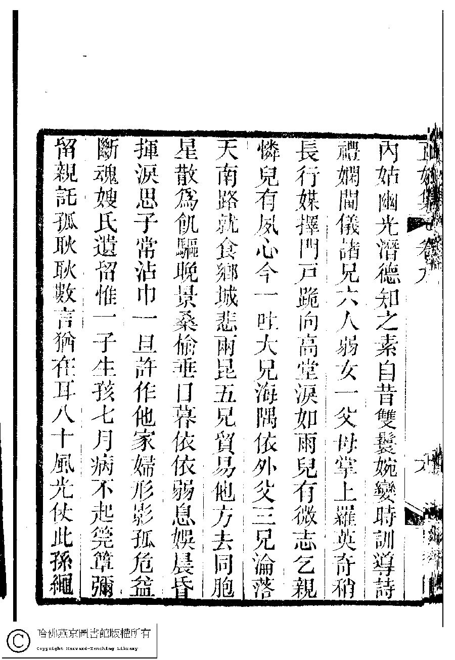 | 馬貞孝女詩 Ma zhen xiao nü shi 詩 - 七言古詩 shi - qiyangushi 董雪暉 Dong Xuehui 國朝閨秀正始集﹕二十卷﹐附錄﹕一卷﹐補遺﹕一卷﹐又附題詞﹕一卷(清惲珠輯) Guo chao gui xiu zheng shi ji: 20 juan, fu lu: 1 juan, bu yi: 1 juan, you fu ti ci: 1 juan (edited by Yun Zhu, Qing dynasty) , pp. 9.6a,9.6b,9.7a,9.7b. |
