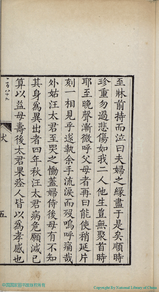| 皇清例封孺人亡婦朱孺人狀 Huang Qing li feng ru ren wang fu Zhu ru ren zhuang 文﹕行狀 Wen: Xing zhuang 徐錫第﹐號蘭叔﹐字雲楣 Xu Xidi, hao: Lanshu, zi: Yunmei 珠來閣遺稿:一卷(清朱萼增撰),哀弦集:一卷(清徐錫第撰) Zhu lai ge yi gao:1 juan (by Zhu Ezeng, Qing Dynasty),Ai xian ji:1 juan (by Xu Yunmei, Qing Dynasty) , pp. 狀.1a,狀.1b,狀.2a,狀.2b,狀.3a,狀.3b,狀.4a,狀.4b,狀.5a,狀.5b. |
