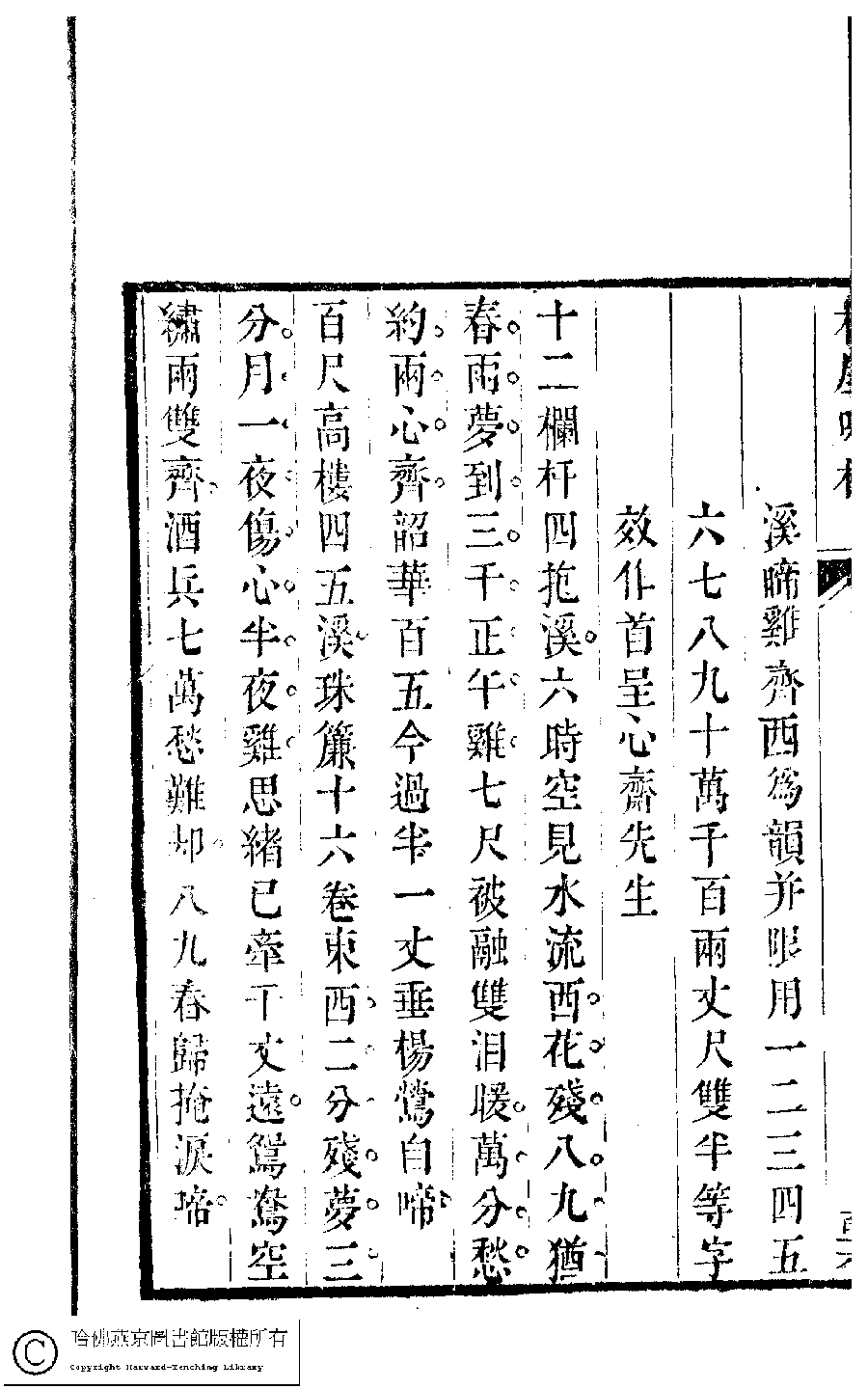 | 司宼徐健菴宗伯韓慕廬作春閨詩限以溪啼雞齊西為韻并限用一二三四五六七八九十萬千百兩丈尺雙半等字效作首呈心齋先生(二首) Si kou Xu Jian'an zong bo Han Mulu zuo chun gui shi xian yi xi ti ji qi xi wei yun bing xian yong yi er san si wu liu qi ba jiu shi wan qian bai liang zhang chi shuang ban deng zi xiao zuo shou cheng Xinzhai xian sheng 詩 - 七言律詩 shi - qiyanlüshi 尤澹僊﹐字素蘭﹐又名寄湘 You Danxian, zi: Sulan 吳中女士詩鈔(清任兆麟輯,張滋蘭選) 曉春閣詩稿﹕一卷 Wu zhong nü shi shi chao (edited by Ren Zhaolin, Qing dynasty) Xiao chun ge shi ji: 1 juan, pp. 曉春閣.15a,曉春閣.15b. |