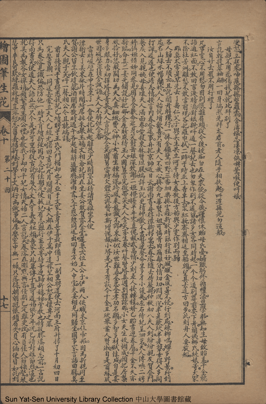 | 第二十回 賢皇后諫封外戚 苦佳人泣別慈幃 慕前盟通宵不寐 呈往蹟驀地潛歸 Di er shi hui Xian huang hou jian feng wai qi Gu jia ren qi bie ci wei Mu qian meng tong xiao bu mei Cheng wang ji mo di qian gui 文﹕彈詞 Wen: Tan ci 邱心如 Qiu Xinru 繪圖筆生花: 十六卷三十二回(清邱心如撰) Hui tu Bi sheng hua: 16 juan 32 hui (by Qiu Xinru, Qing Dynasty) , pp. 卷十11b,卷十12a,卷十12b,卷十13a,卷十13b,卷十14a,卷十14b,卷十15a,卷十15b,卷十16a,卷十16b,卷十17a,卷十17b,卷十18a,卷十18b,卷十19a,卷十19b,卷十20a,卷十20b,卷十21a,卷十21b,卷十22a,卷十22b,卷十23a,卷十23b. |