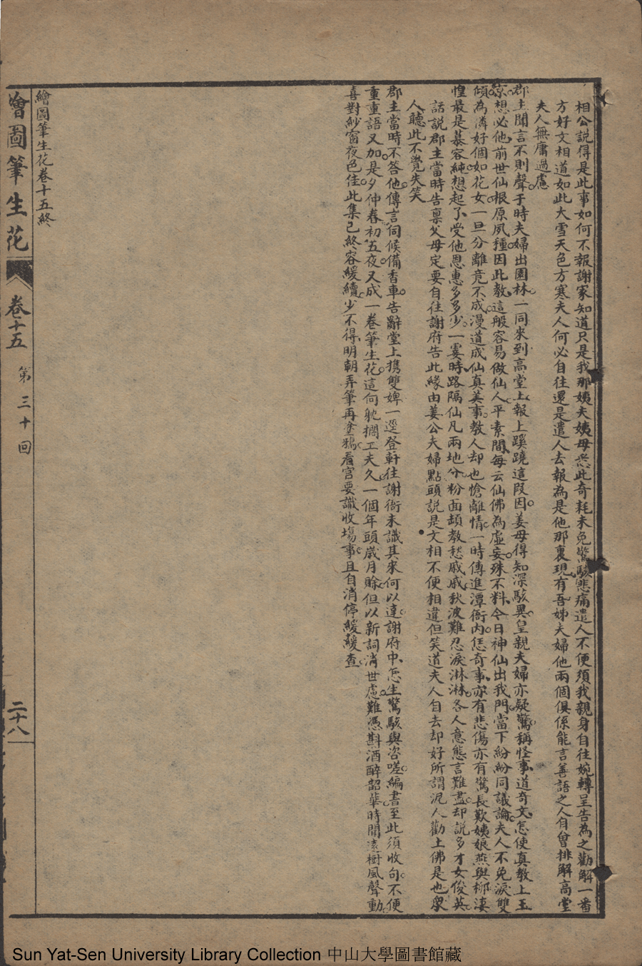 | 第三十回 亡獅吼陰銷夙孽 荷鴻恩職主群材 送麟來益增歡樂 乘鶴去不免悲哀 Di san shi hui Wang shi kou yin xiao su nie He hong en zhi zhu qun cai Song lin lai yi zeng huan le Cheng he qu bu mian bei ai 文﹕彈詞 Wen: Tan ci 邱心如 Qiu Xinru 繪圖筆生花: 十六卷三十二回(清邱心如撰) Hui tu Bi sheng hua: 16 juan 32 hui (by Qiu Xinru, Qing Dynasty) , pp. 卷十五14b,卷十五15a,卷十五15b,卷十五16a,卷十五16b,卷十五17a,卷十五17b,卷十五18a,卷十五18b,卷十五19a,卷十五19b,卷十五20a,卷十五20b,卷十五21a,卷十五21b,卷十五22a,卷十五22b,卷十五23a,卷十五23b,卷十五24a,卷十五24b,卷十五25a,卷十五25b,卷十五26a,卷十五26b,卷十五27a,卷十五27b,卷十五28a,卷十五28b. |