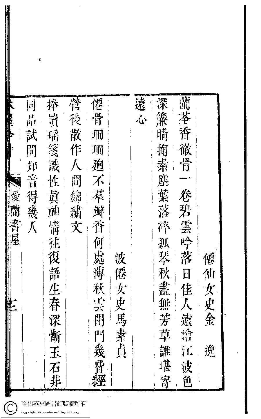吳中女士詩鈔(清任兆麟輯,張滋蘭選) 愛蘭詩鈔﹕一卷 Wu zhong nü shi shi chao (edited by Ren Zhaolin, Qing dynasty) Ai lan shi chao: 1 juan, pp. 愛蘭書屋.12a.
