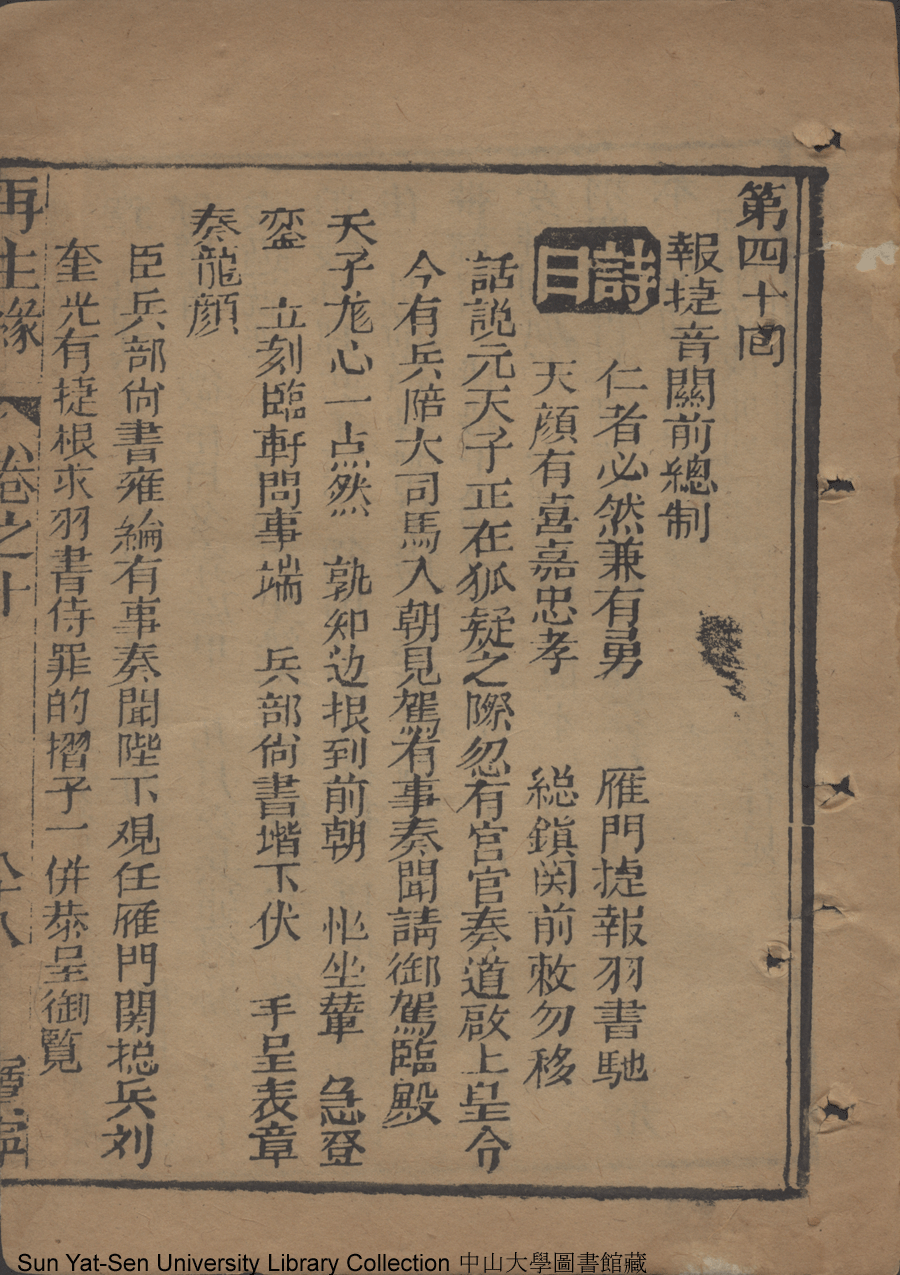 | 第四十回 報捷音關前總制 Di si shi hui Bao jie yin guan qian zong zhi 文﹕彈詞 Wen: Tan ci 侯芝﹐字香葉 Hou Zhi, zi: Xiangye 再生緣全傳: 二十卷八十回(清侯芝改訂) Zai sheng yuan quan zhuan: 20 juan 80 hui (by Hou Zhi, Qing Dynasty) , pp. 卷十88a,卷十88b,卷十89a,卷十89b,卷十90a,卷十90b,卷十91a,卷十91b,卷十92a,卷十92b,卷十93a,卷十93b,卷十94a,卷十94b,卷十95a,卷十95b,卷十96a,卷十96b,卷十97a,卷十97b,卷十98a,卷十98b,卷十99a,卷十99b. |