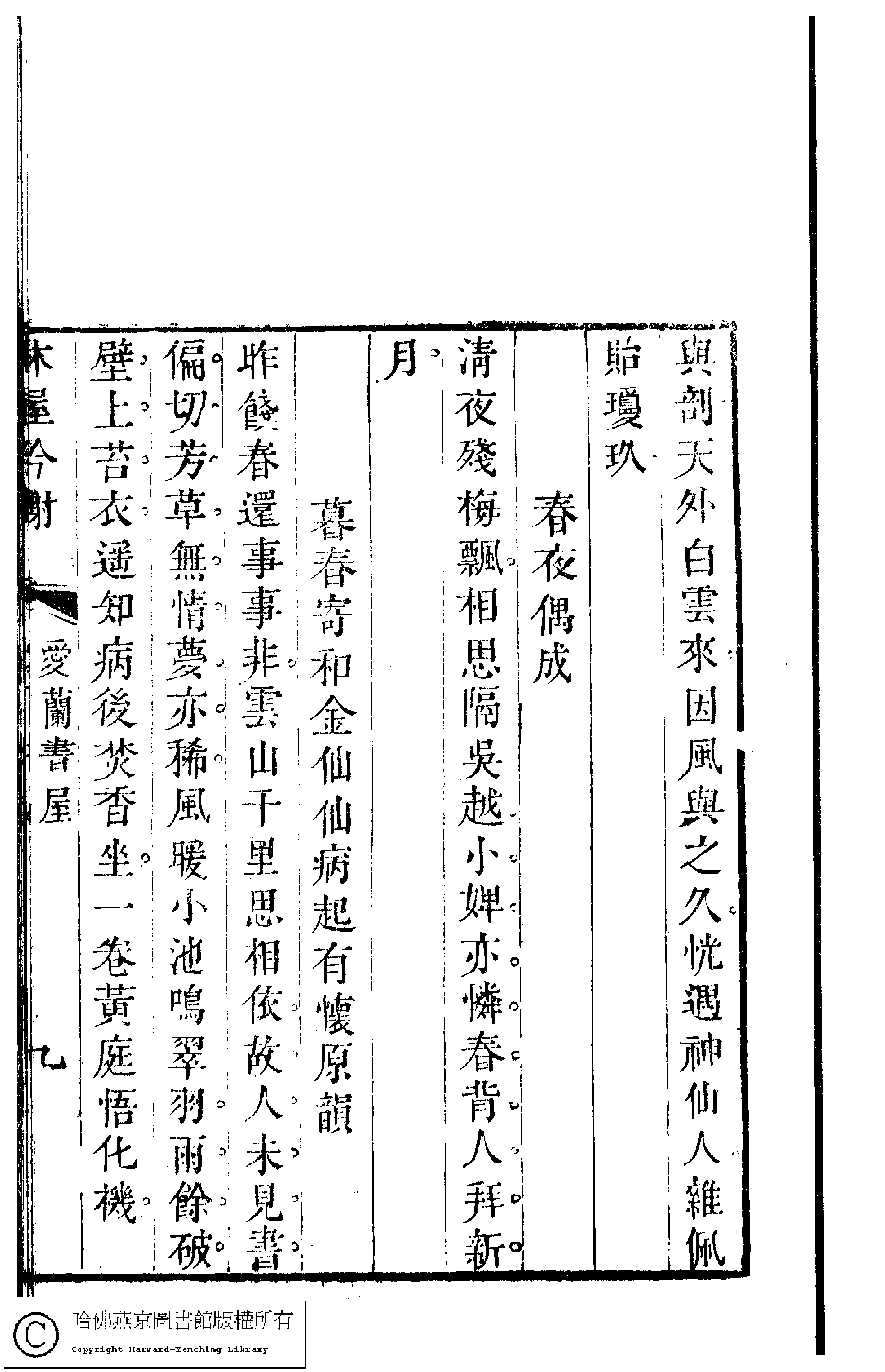 | 偶讀翡翠樓詩即用贈郟杜蘭原韵 Ou du Fei cui lou shi ji yong zeng Jia Dulan yuan yun 詩 - 五言古詩 shi - wuyangushi 王瓊﹐號愛蘭老人﹐字碧雲 Wang Qiong, hao: Ailanlaoren, zi: Biyun 吳中女士詩鈔(清任兆麟輯,張滋蘭選) 愛蘭詩鈔﹕一卷 Wu zhong nü shi shi chao (edited by Ren Zhaolin, Qing dynasty) Ai lan shi chao: 1 juan, pp. 愛蘭書屋.8b,愛蘭書屋.9a. |