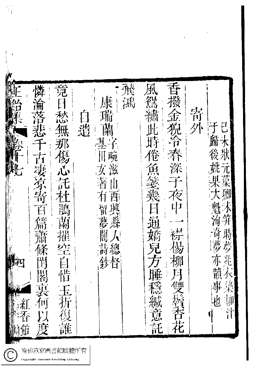 | 自遣 Zi qian 詩 - 五言律詩 shi - wuyanlüshi 康蕙蘭﹐字畹滋﹐又名康瑞蘭 Kang Huilan, zi: Wanzi 國朝閨秀正始集﹕二十卷﹐附錄﹕一卷﹐補遺﹕一卷﹐又附題詞﹕一卷(清惲珠輯) Guo chao gui xiu zheng shi ji: 20 juan, fu lu: 1 juan, bu yi: 1 juan, you fu ti ci: 1 juan (edited by Yun Zhu, Qing dynasty) , pp. 17.4a,17.4b. |