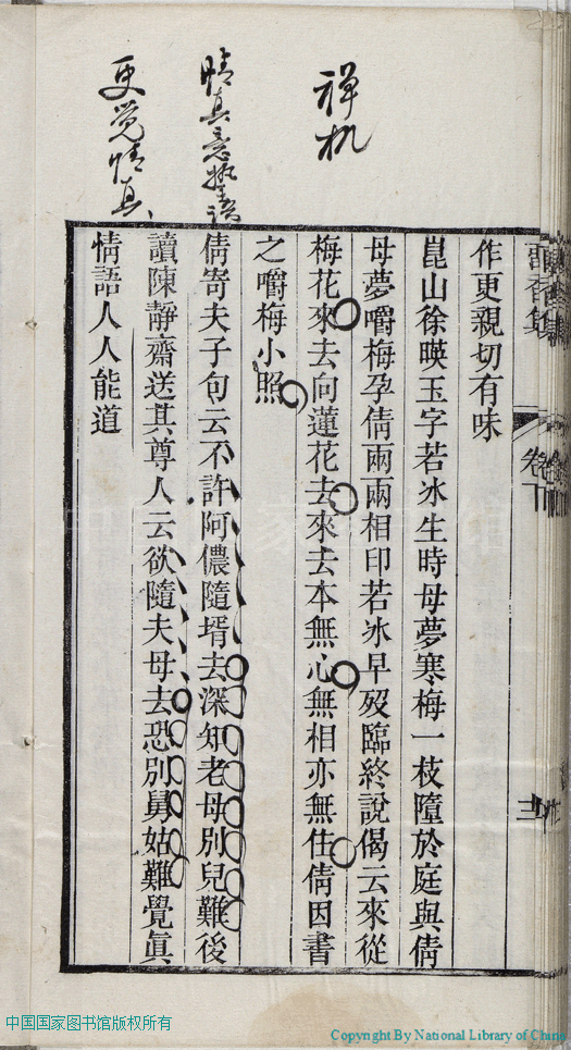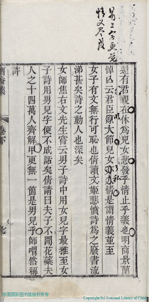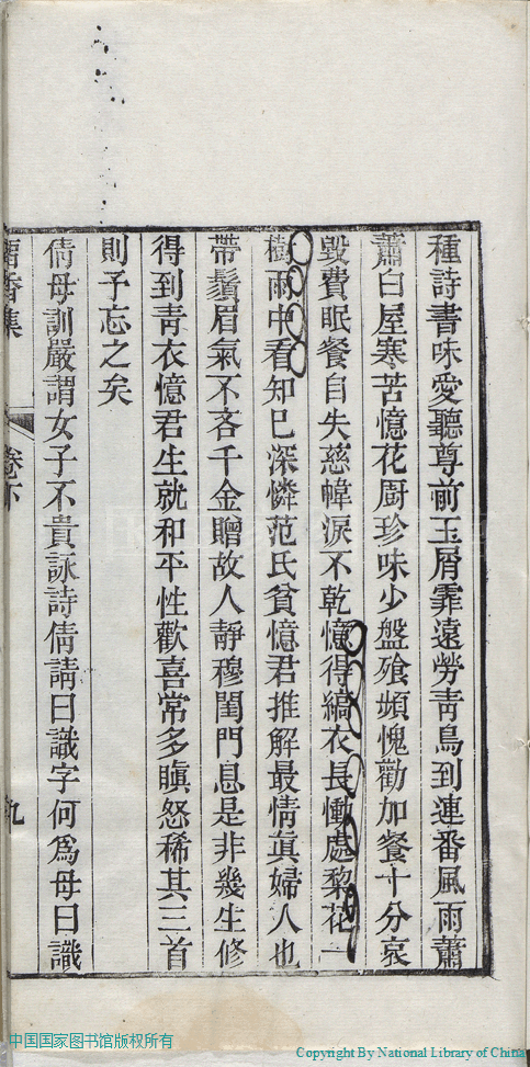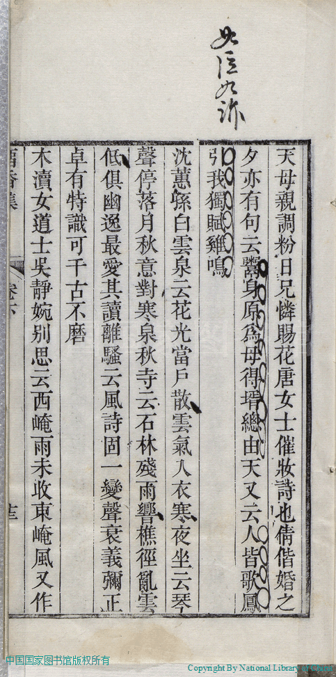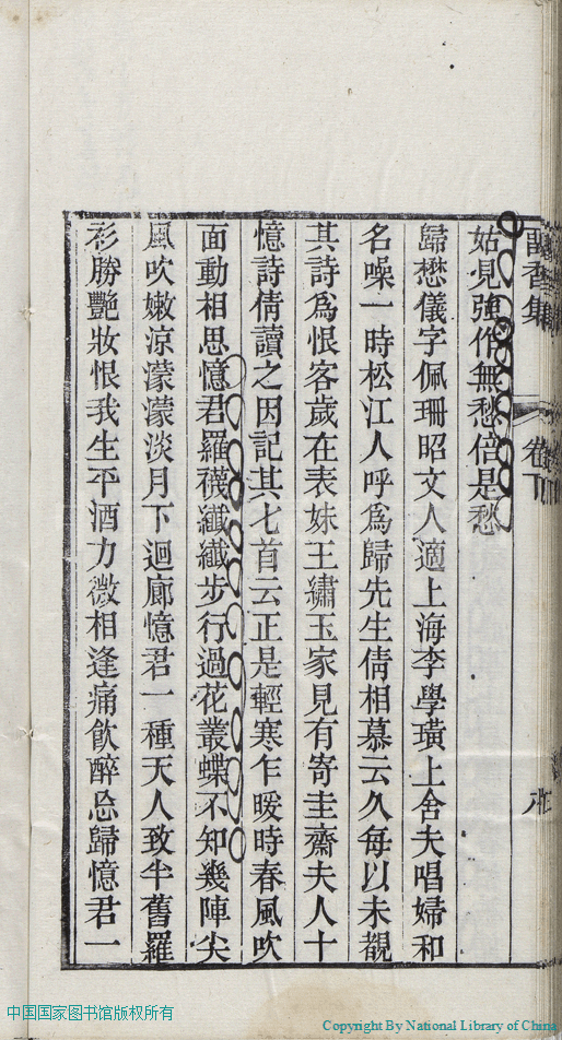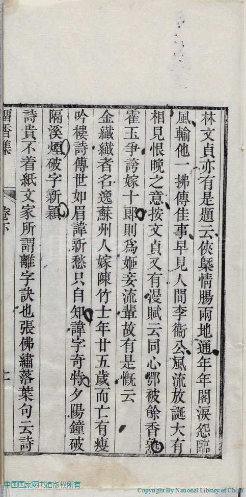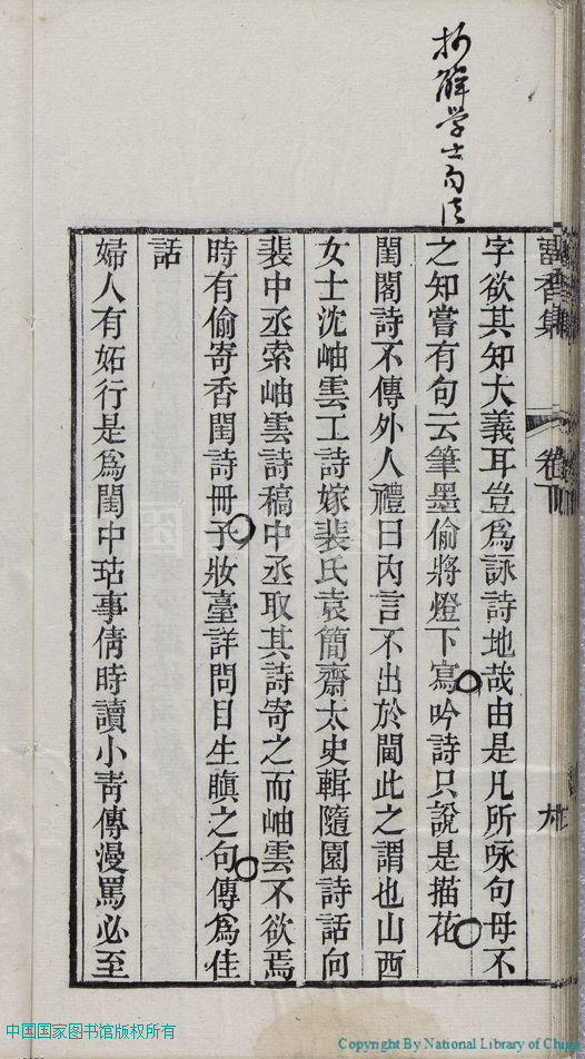 | 名媛詩話 Ming yuan shi hua 文﹕詩話 Wen: Shi hua 張倩﹐號又亭﹐字青人﹐又名憨憨 Zhang Qian, hao: Youting, zi: Qingren 留香集:二卷(清張倩撰) Liu xiang ji:2 juan (by Zhang Qian, Qing Dynasty) , pp. 下卷-名媛詩話.10a,下卷-名媛詩話.10b,下卷-名媛詩話.11a,下卷-名媛詩話.11b,下卷-名媛詩話.12a,下卷-名媛詩話.12b,下卷-名媛詩話.1a,下卷-名媛詩話.1b,下卷-名媛詩話.2a,下卷-名媛詩話.2b,下卷-名媛詩話.3a,下卷-名媛詩話.3b,下卷-名媛詩話.4a,下卷-名媛詩話.4b,下卷-名媛詩話.5a,下卷-名媛詩話.5b,下卷-名媛詩話.6a,下卷-名媛詩話.6b,下卷-名媛詩話.7a,下卷-名媛詩話.7b,下卷-名媛詩話.8a,下卷-名媛詩話.8b,下卷-名媛詩話.9a,下卷-名媛詩話.9b. |
