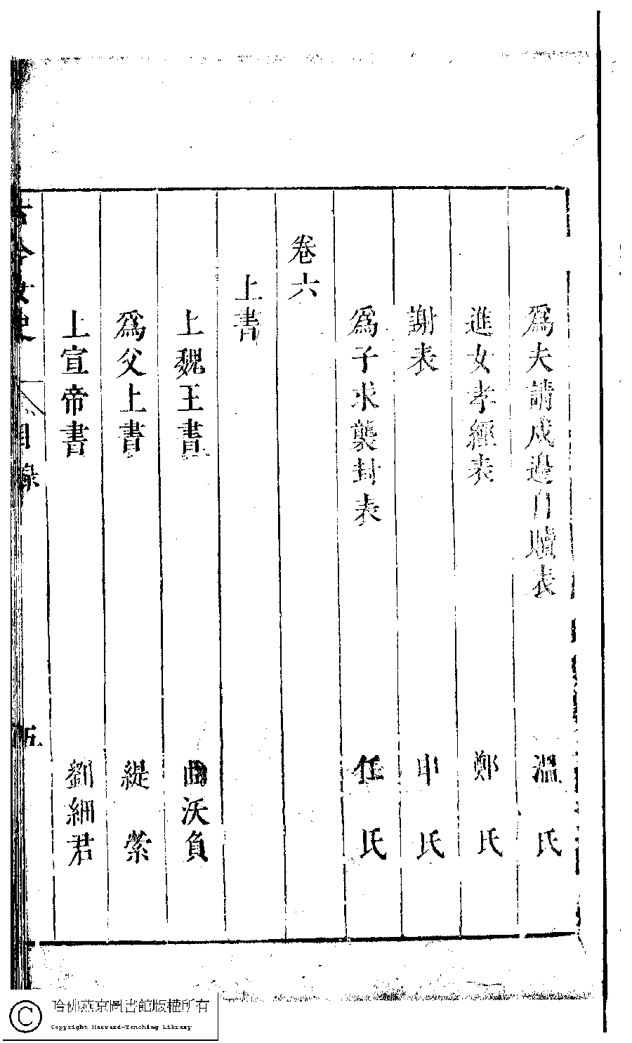 Gu jin nü shi qian ji mu lu 古今女史﹕十二卷﹐詩集﹕八卷﹐附姓氏字里詳節﹕一卷(明趙世杰輯) Gu jin nü shi: 12 juan, shi ji: 8 juan, fu Xing shi zi li xiang jie: 1 juan (edited by Zhao shijie, Ming dynasty) , pp. 目錄.1a,目錄.1b,目錄.2a,目錄.2b,目錄.3a,目錄.3b,目錄.4a,目錄.4b,目錄.5a,目錄.5b,目錄.6a. |