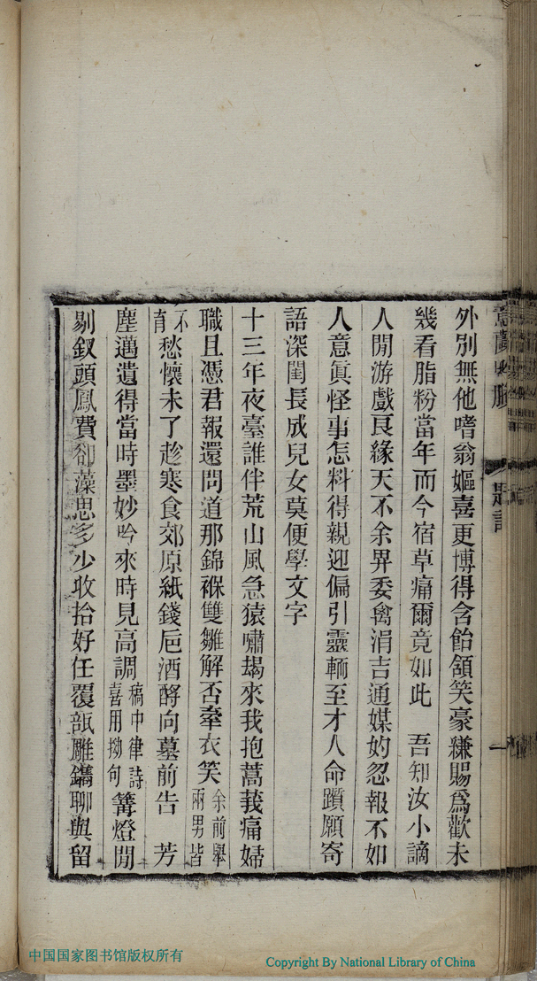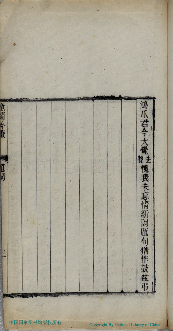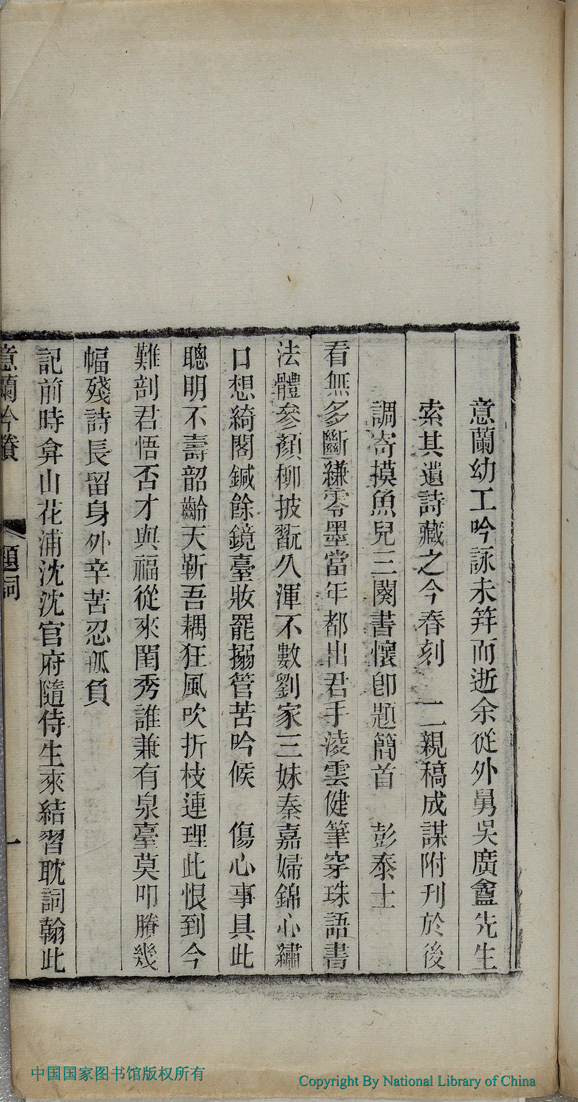 | 摸魚兒 : 意蘭幼工吟詠未笄而逝余從外舅吳廣盦先生索其遣詩藏之今春刻二親稿成謀附刊於後調寄摸魚兒三闕書懷即題簡首 Mo yu er : Yilan you gong yin yong bing ji er shi yu cong wai jiu Wu Guangan xian sheng suo qi yi shi cang zhi jin chun ke er qin gao cheng mou fu kan yu hou diao ji Mo yu er san que shu huai ji ti jian shou 詞 ci 彭泰士﹐號頡林﹐字魯瞻 Peng Taishi, hao: Jielin, zi: Luzhan 意蘭吟剩:一卷(清吳毓蓀撰) Yilan yin sheng: 1 juan (by Wu Yusun, Qing dynasty) , pp. 題詞.1a,題詞.1b,題詞.2a,題詞.2b. |