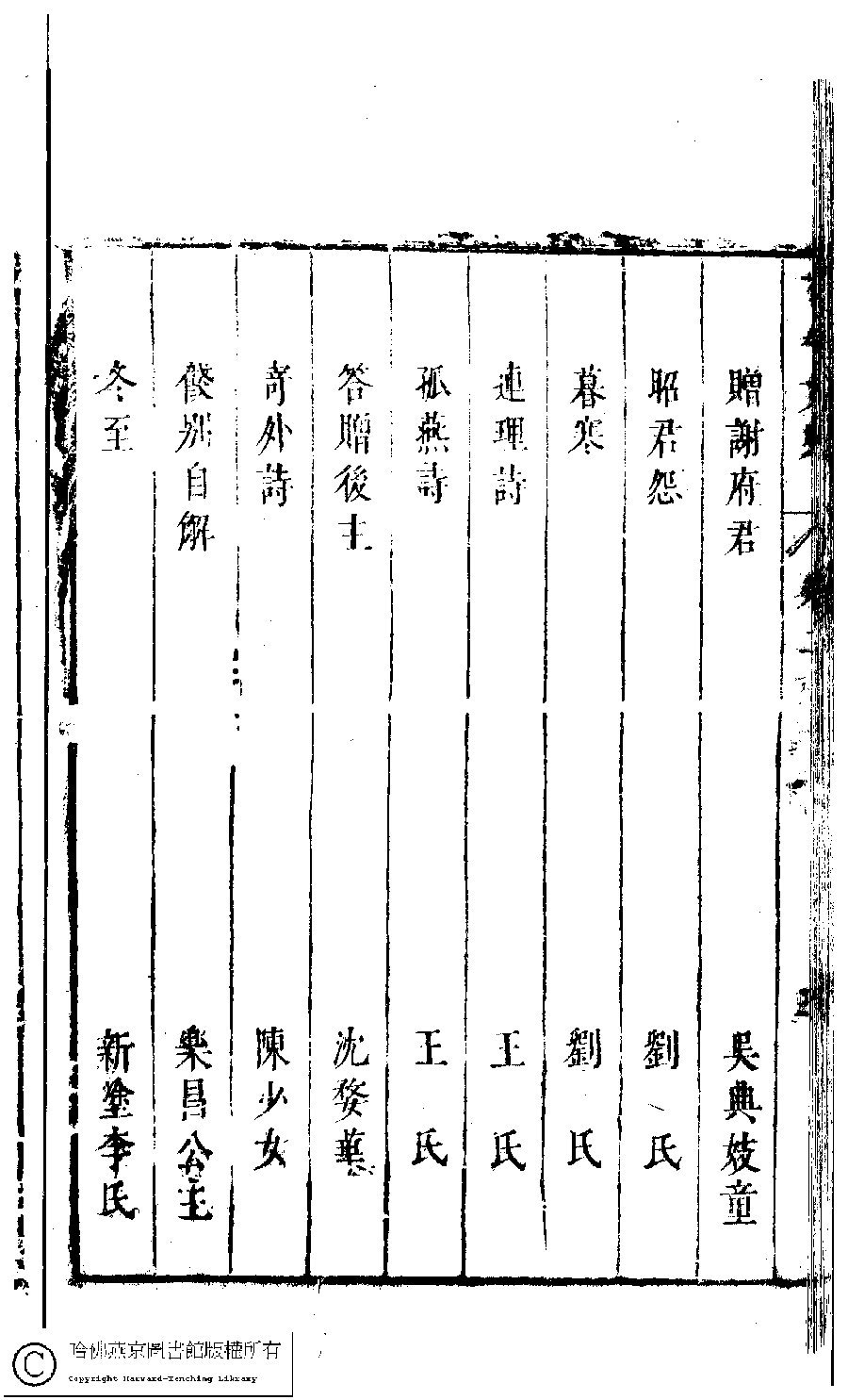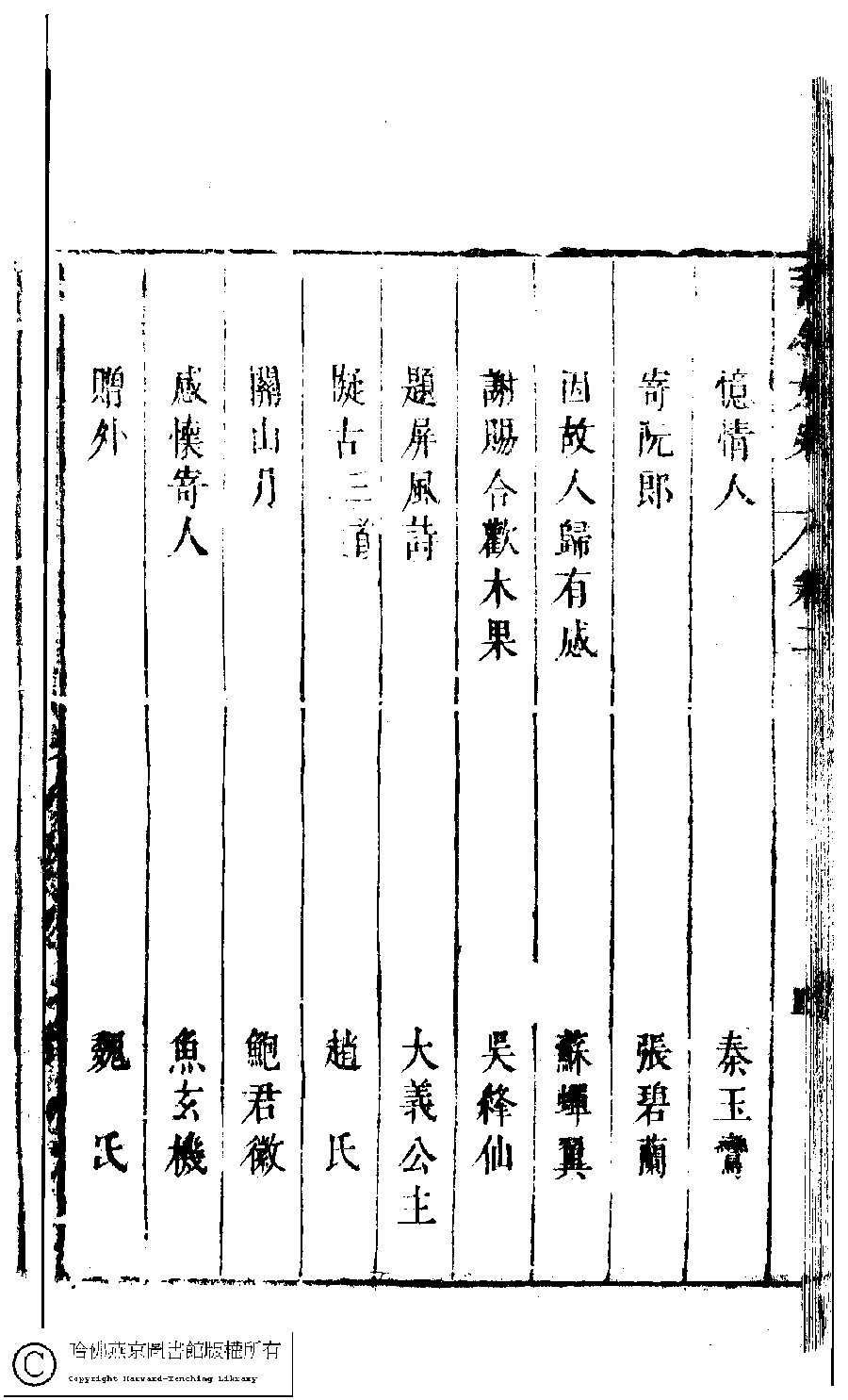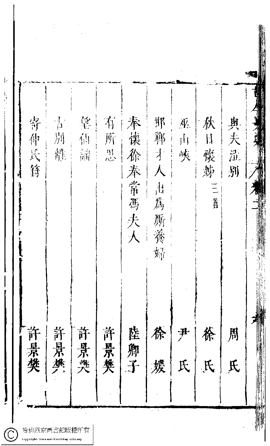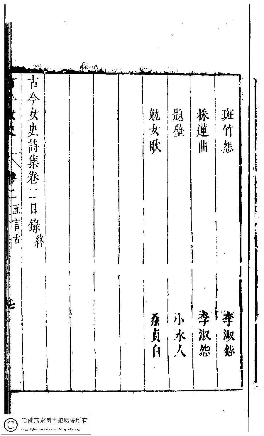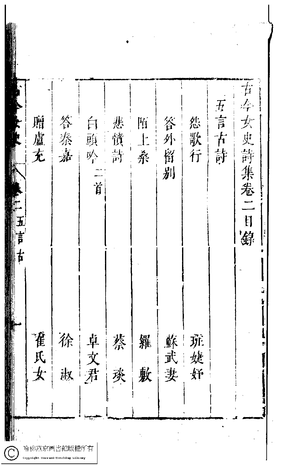 | 古今女史詩集卷二目錄 Gu jin nü shi shi ji juan er mu lu 古今女史﹕十二卷﹐詩集﹕八卷﹐附姓氏字里詳節﹕一卷(明趙世杰輯) Gu jin nü shi: 12 juan, shi ji: 8 juan, fu Xing shi zi li xiang jie: 1 juan (edited by Zhao shijie, Ming dynasty) , pp. 2.目錄.1a,2.目錄.1b,2.目錄.2a,2.目錄.2b,2.目錄.3a,2.目錄.3b,2.目錄.4a,2.目錄.4b,2.目錄.5a,2.目錄.5b,2.目錄.6a,2.目錄.6b,2.目錄.7a,2.目錄.7b. |
