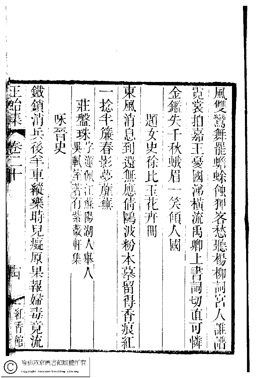 | 題女史徐比玉花卉冊 Ti nü shi Xu Biyu hua hui ce 詩 - 七言絕句 shi - qiyanjueju 陸韻梅﹐字琇卿 Lu Yunmei, zi: Xiuqing 國朝閨秀正始集﹕二十卷﹐附錄﹕一卷﹐補遺﹕一卷﹐又附題詞﹕一卷(清惲珠輯) Guo chao gui xiu zheng shi ji: 20 juan, fu lu: 1 juan, bu yi: 1 juan, you fu ti ci: 1 juan (edited by Yun Zhu, Qing dynasty) , pp. 20.14a. |