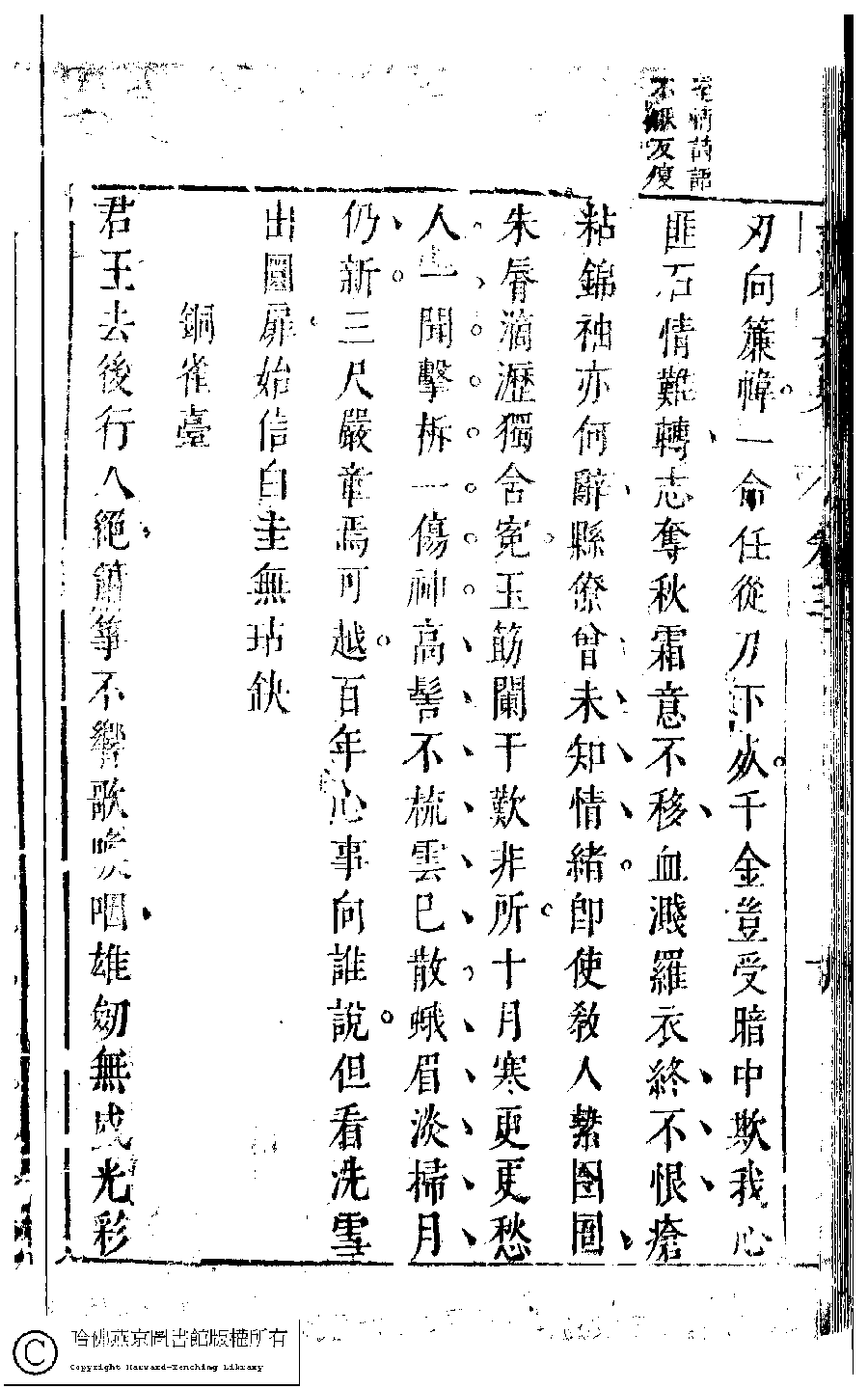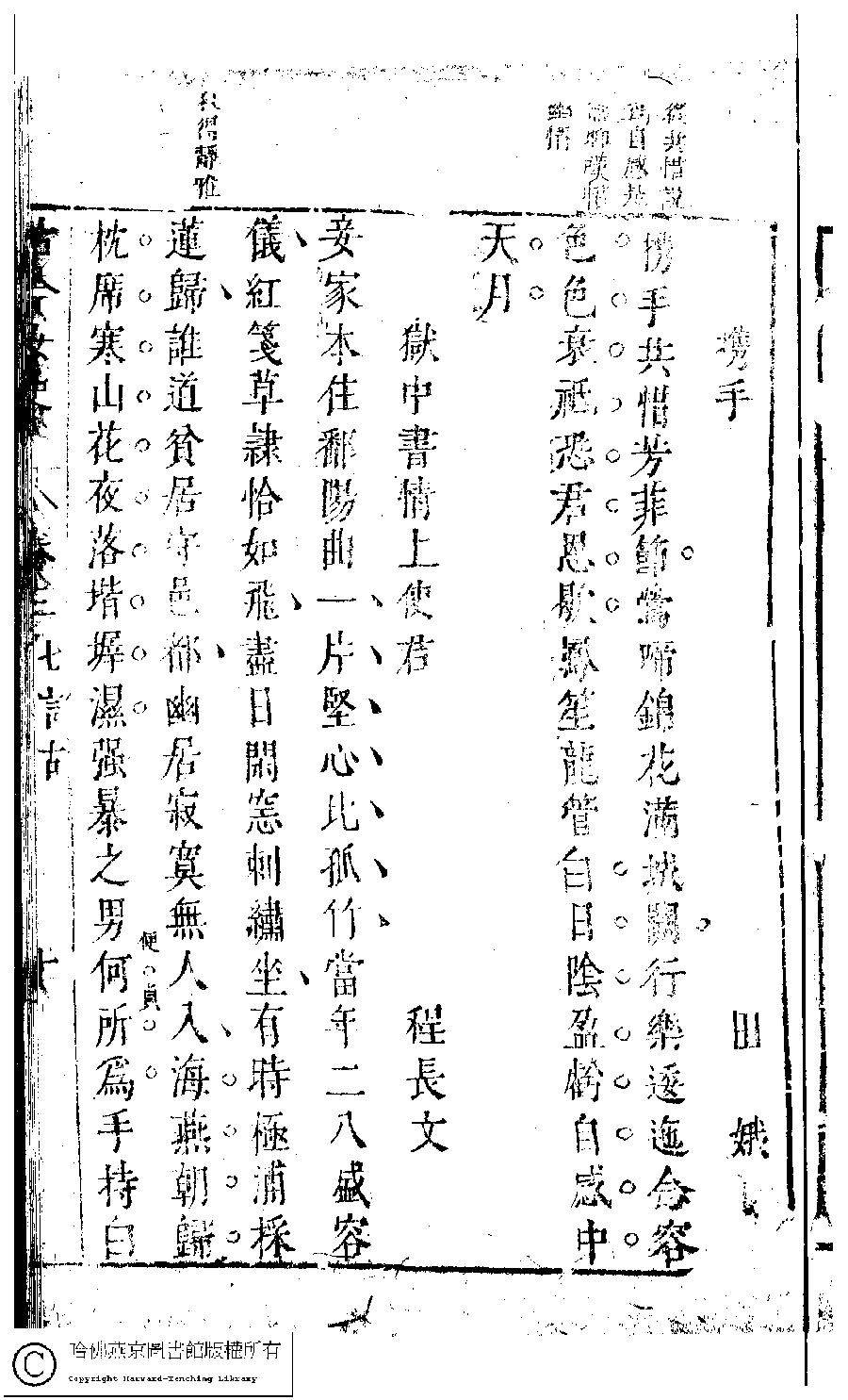 | 獄中書情上使君 Yu zhong shu qing shang shi jun 詩 - 七言古詩 shi - qiyangushi 程長文 Cheng Changwen 古今女史﹕十二卷﹐詩集﹕八卷﹐附姓氏字里詳節﹕一卷(明趙世杰輯) Gu jin nü shi: 12 juan, shi ji: 8 juan, fu Xing shi zi li xiang jie: 1 juan (edited by Zhao shijie, Ming dynasty) , pp. 3.10a,3.10b. |