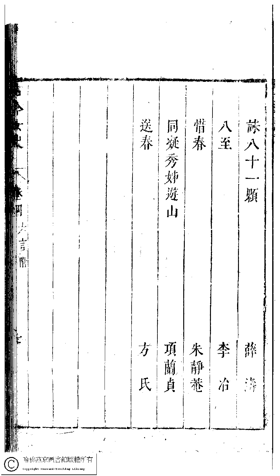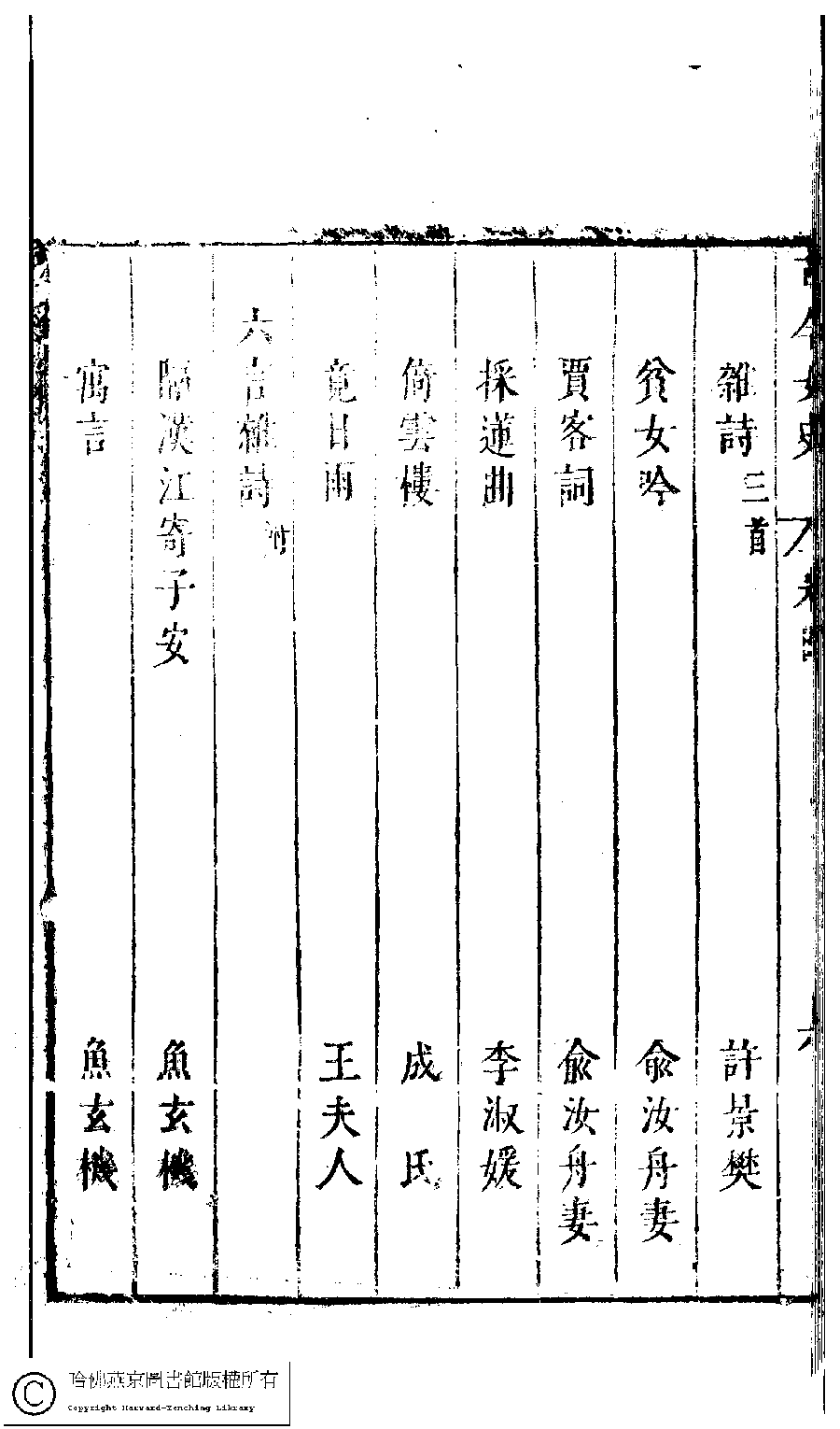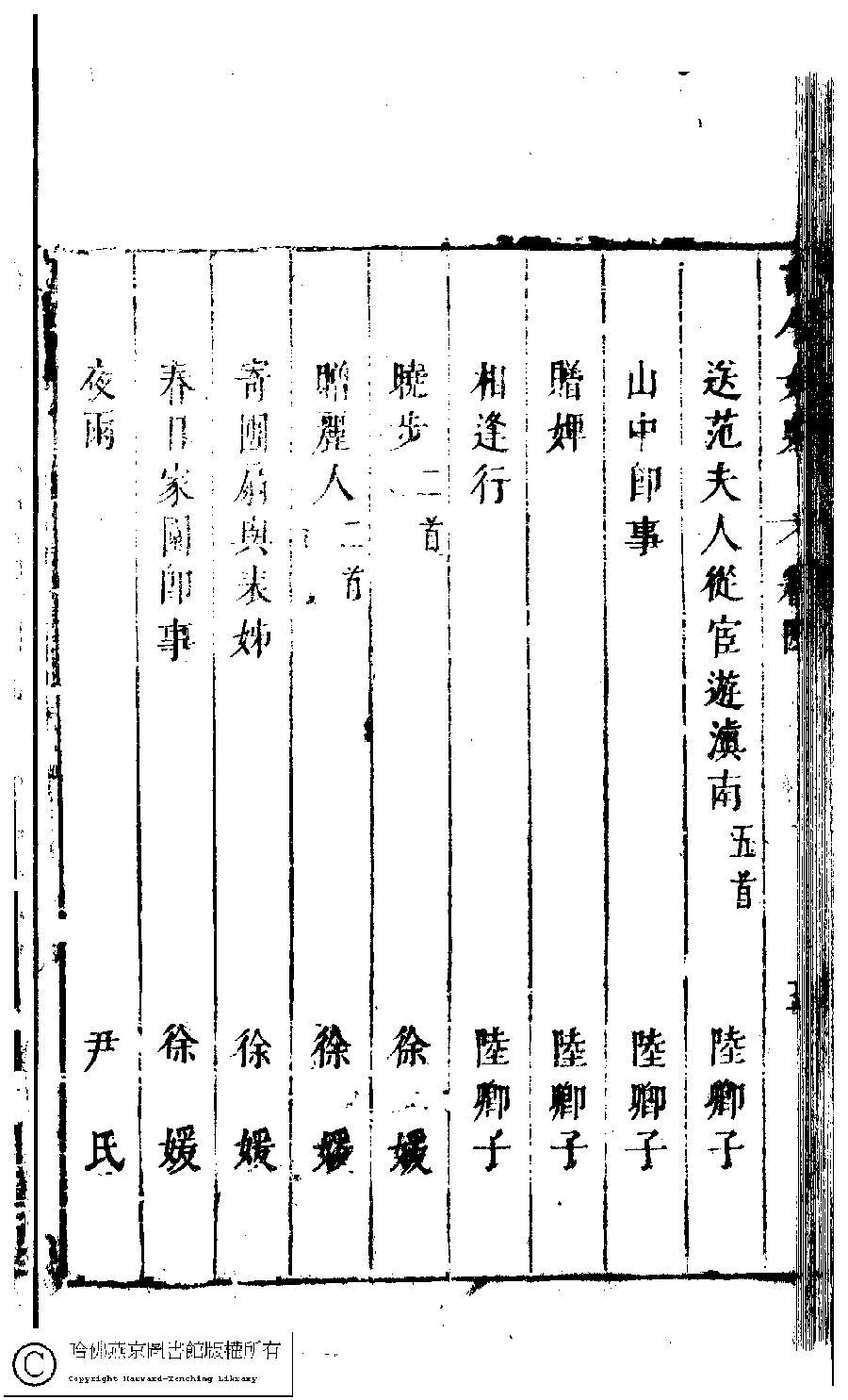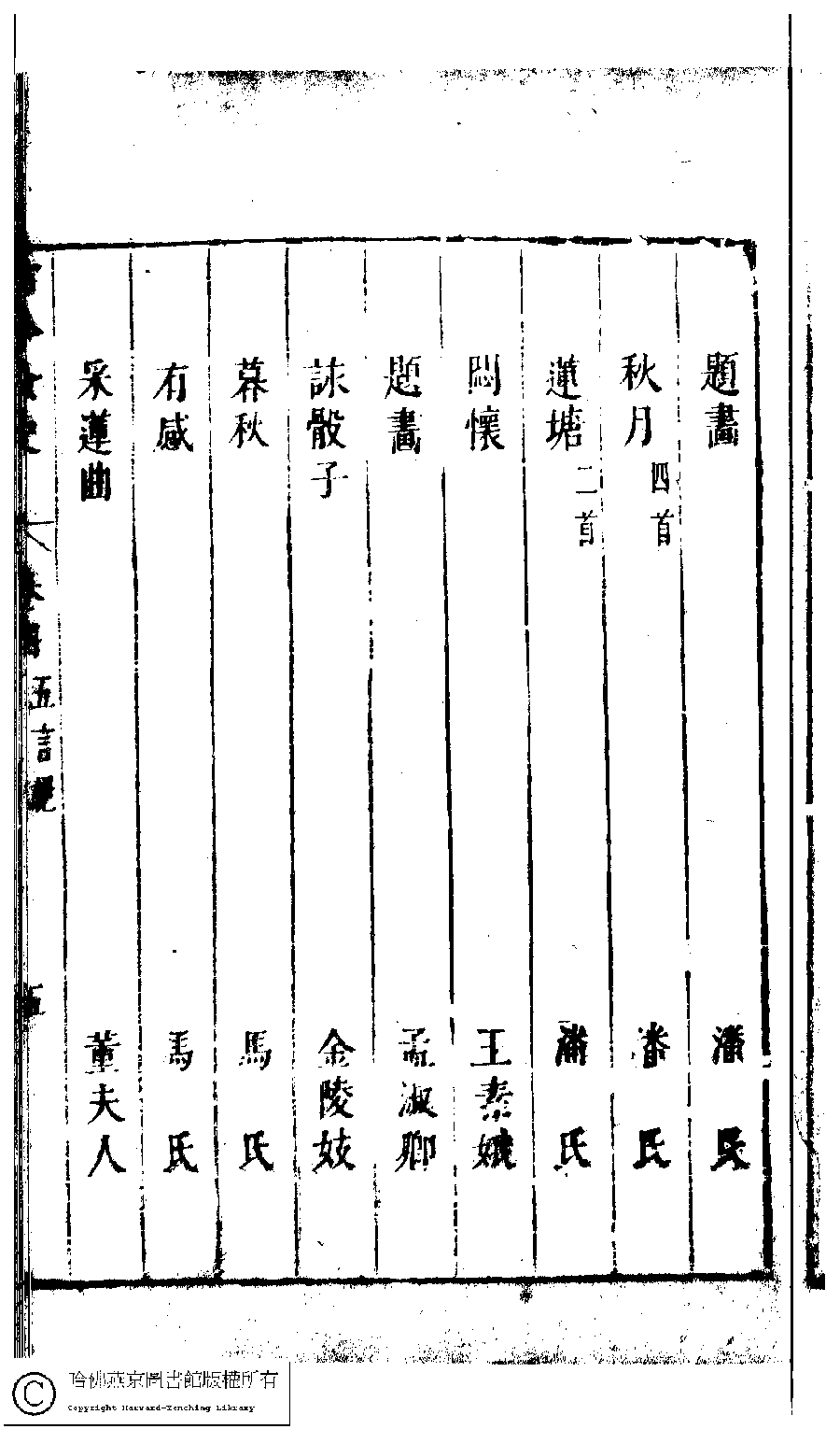 | 古今女史詩集卷四目錄 Gu jin nü shi shi ji juan si mu lu 古今女史﹕十二卷﹐詩集﹕八卷﹐附姓氏字里詳節﹕一卷(明趙世杰輯) Gu jin nü shi: 12 juan, shi ji: 8 juan, fu Xing shi zi li xiang jie: 1 juan (edited by Zhao shijie, Ming dynasty) , pp. 3.目錄..3a,4.目錄.1a,4.目錄.1b,4.目錄.2a,4.目錄.2b,4.目錄.3b,4.目錄.4a,4.目錄.5a,4.目錄.5b,4.目錄.6a,4.目錄.6b,4.目錄.7a,4.目錄.7b,目錄.4.4b. |