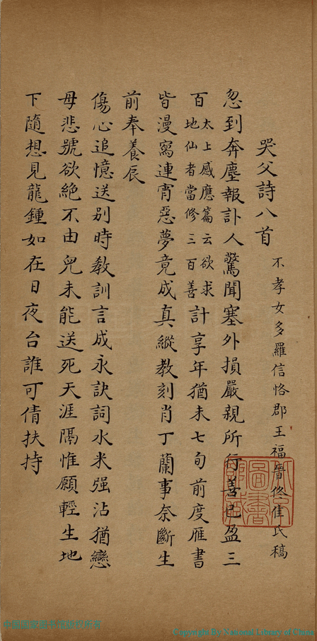 哭父母詩:一卷(清佟佳氏著) Ku fu mu shi: 1 juan (by Tongjia shi, Qing dynasty) , pp. 詩.1a,詩.1b,詩.2a,詩.2b.