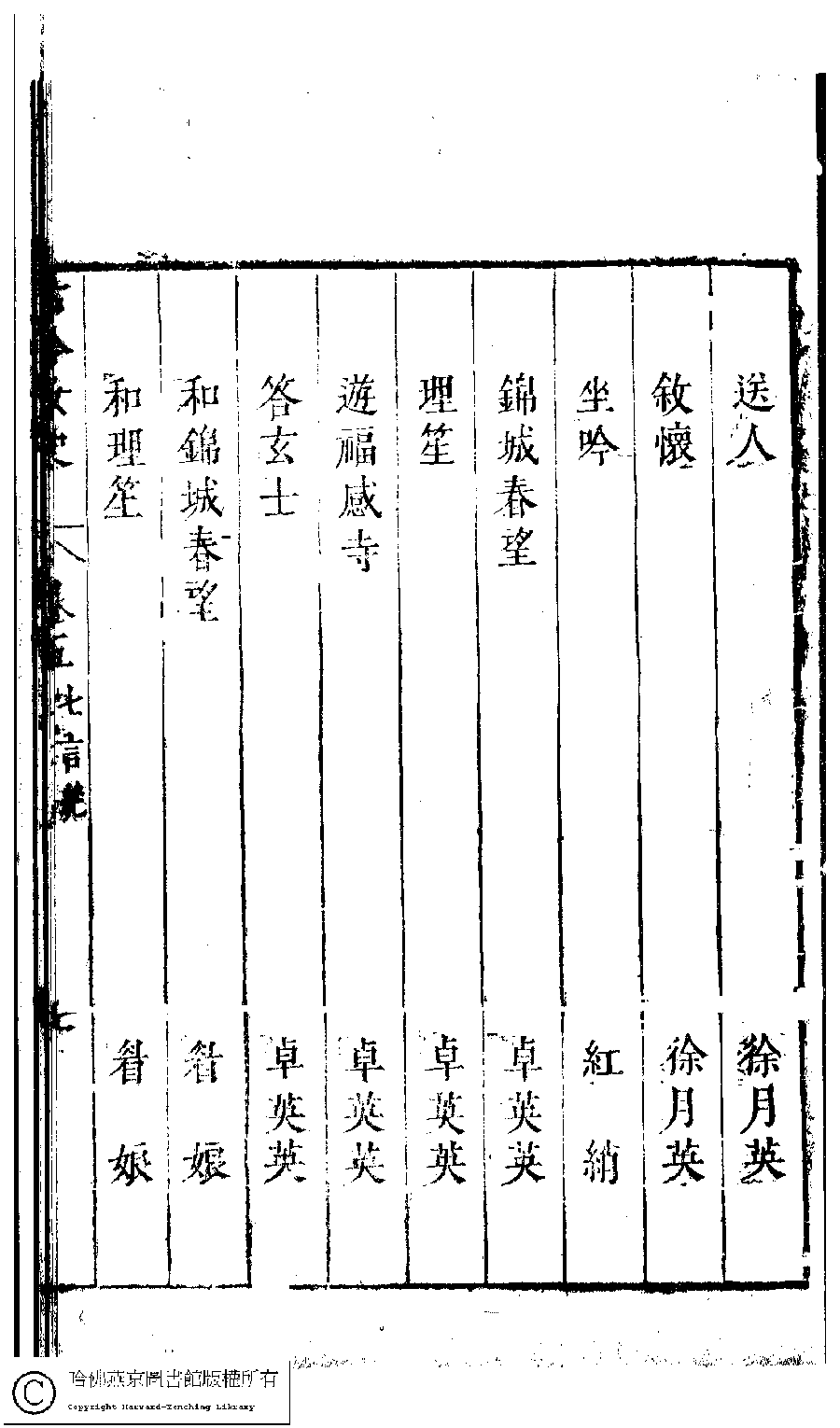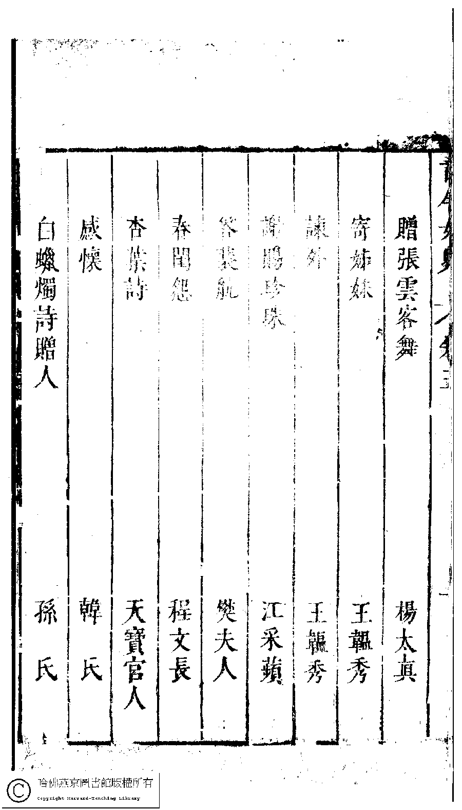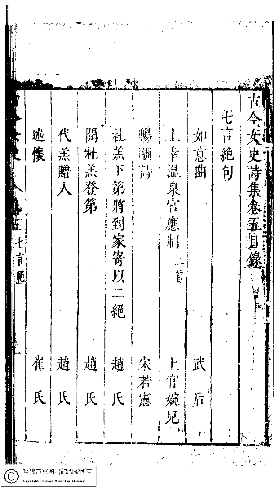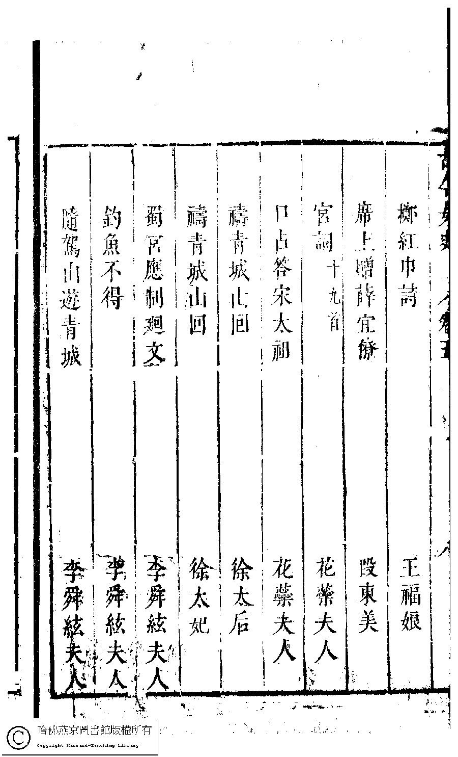 | 古今女史詩集卷五目錄 Gu jin nü shi shi ji juan wu mu lu 古今女史﹕十二卷﹐詩集﹕八卷﹐附姓氏字里詳節﹕一卷(明趙世杰輯) Gu jin nü shi: 12 juan, shi ji: 8 juan, fu Xing shi zi li xiang jie: 1 juan (edited by Zhao shijie, Ming dynasty) , pp. 5.目錄.10a,5.目錄.10b,5.目錄.11b,5.目錄.1a,5.目錄.1b,5.目錄.2a,5.目錄.2b,5.目錄.3a,5.目錄.3b,5.目錄.4a,5.目錄.4b,5.目錄.5a,5.目錄.5b,5.目錄.6a,5.目錄.6b,5.目錄.7a,5.目錄.7b,5.目錄.8a,5.目錄.8b,5.目錄.9a,5.目錄.9b,目錄.5.11a. |