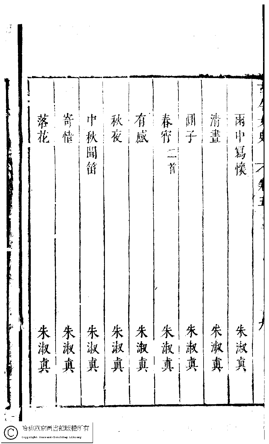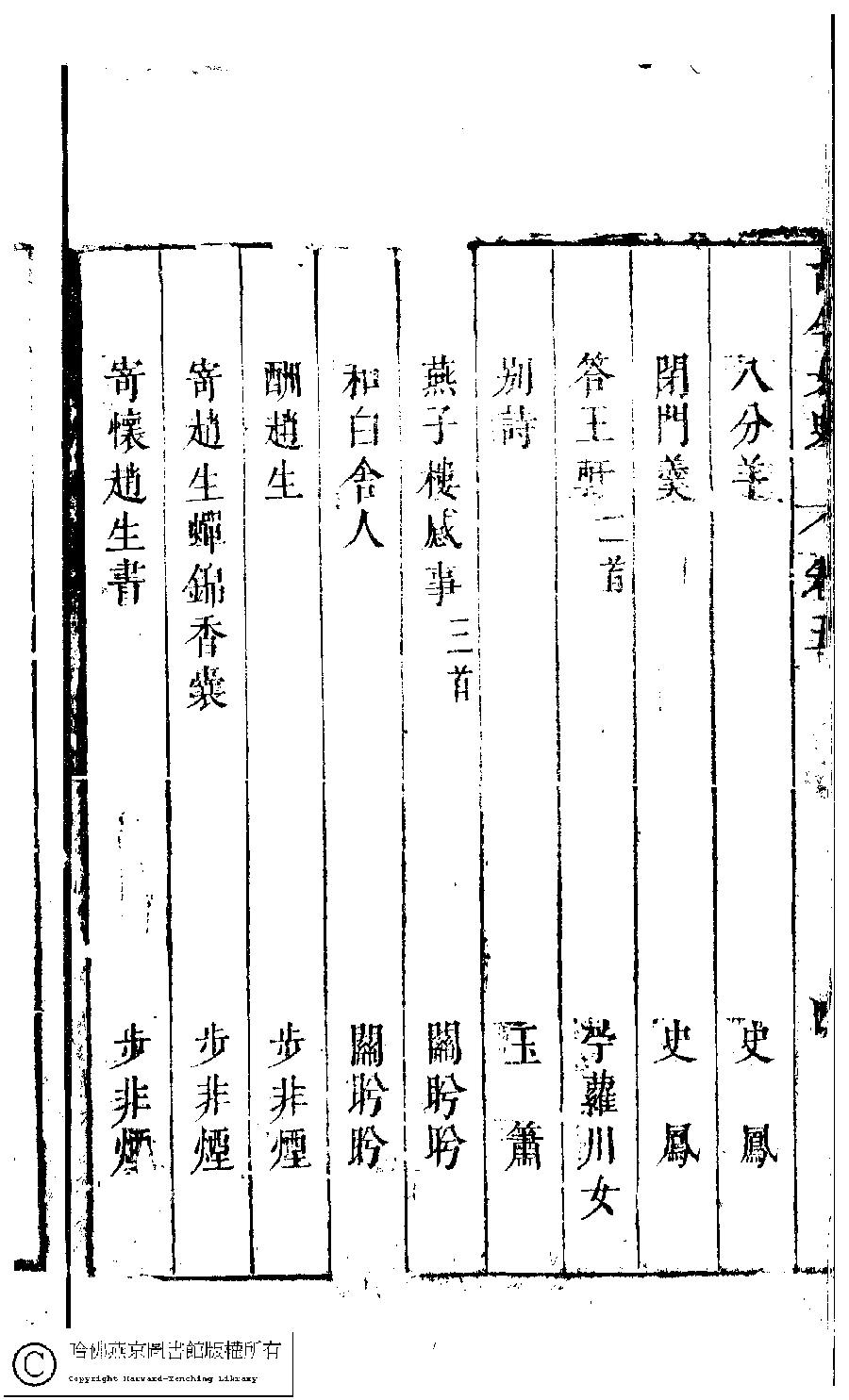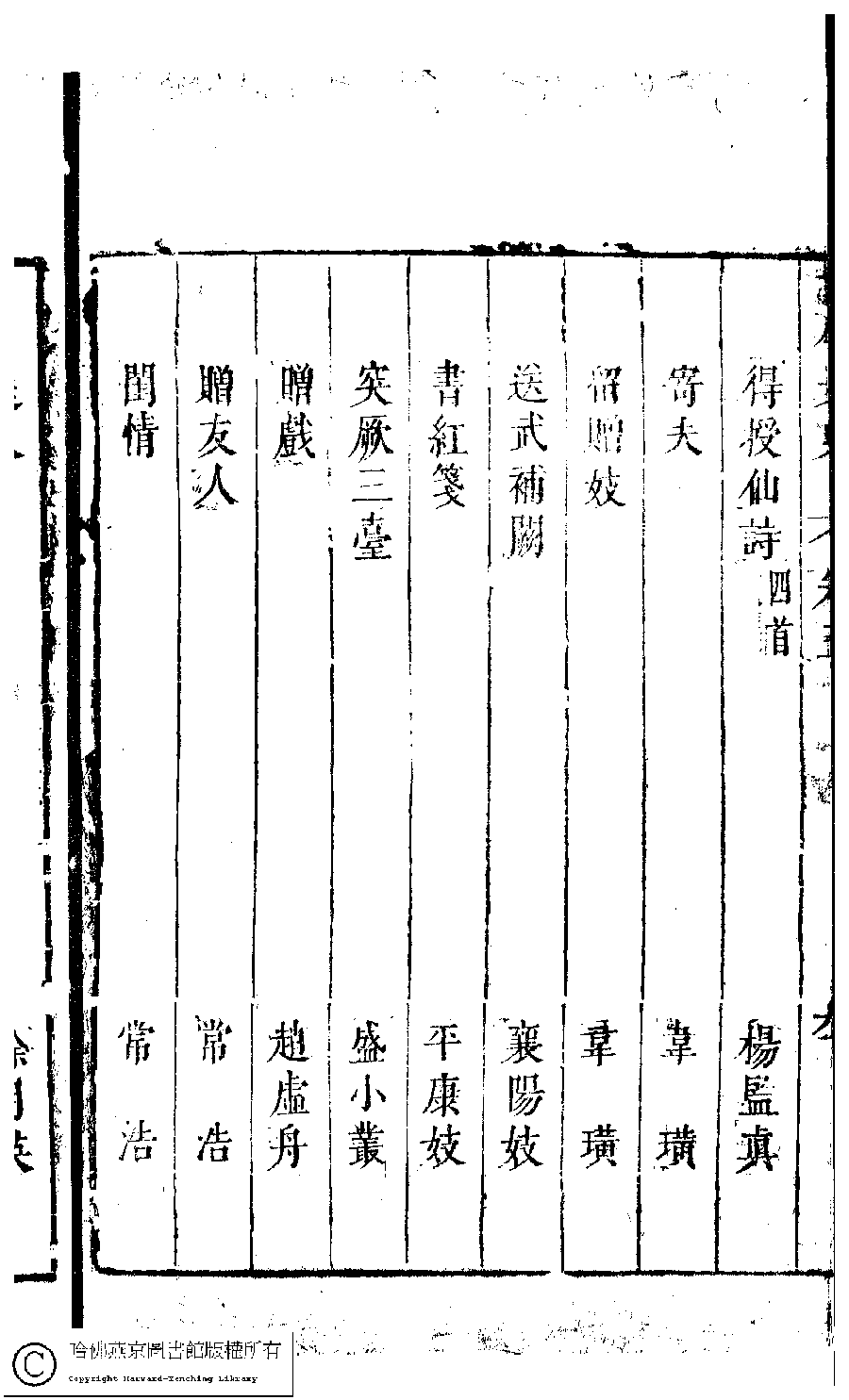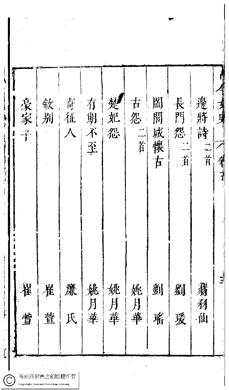 | 古今女史詩集卷五目錄 Gu jin nü shi shi ji juan wu mu lu 古今女史﹕十二卷﹐詩集﹕八卷﹐附姓氏字里詳節﹕一卷(明趙世杰輯) Gu jin nü shi: 12 juan, shi ji: 8 juan, fu Xing shi zi li xiang jie: 1 juan (edited by Zhao shijie, Ming dynasty) , pp. 5.目錄.10a,5.目錄.10b,5.目錄.11b,5.目錄.1a,5.目錄.1b,5.目錄.2a,5.目錄.2b,5.目錄.3a,5.目錄.3b,5.目錄.4a,5.目錄.4b,5.目錄.5a,5.目錄.5b,5.目錄.6a,5.目錄.6b,5.目錄.7a,5.目錄.7b,5.目錄.8a,5.目錄.8b,5.目錄.9a,5.目錄.9b,目錄.5.11a. |
