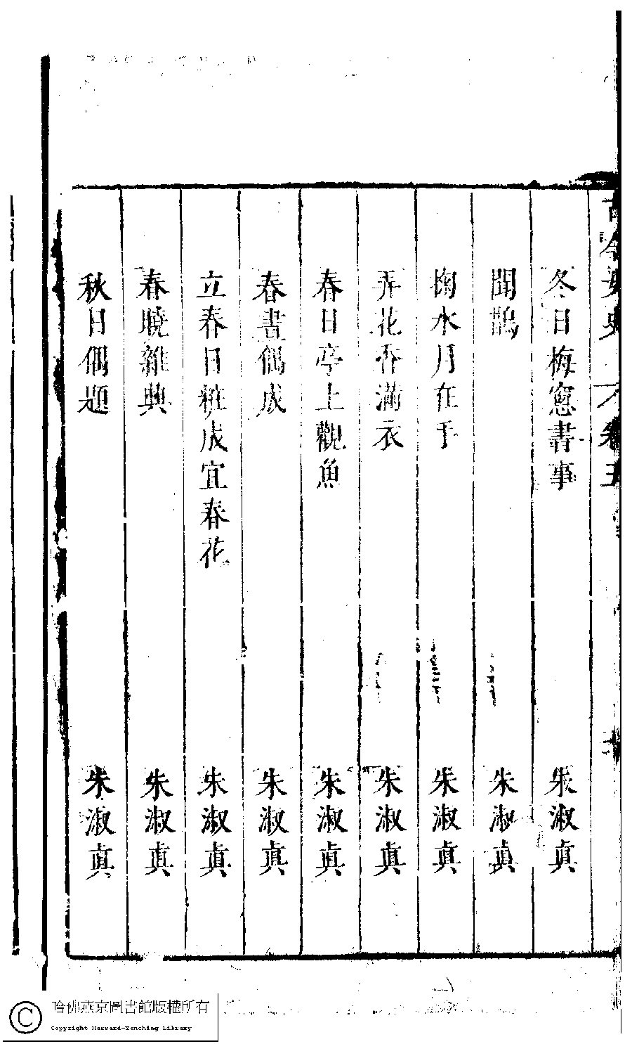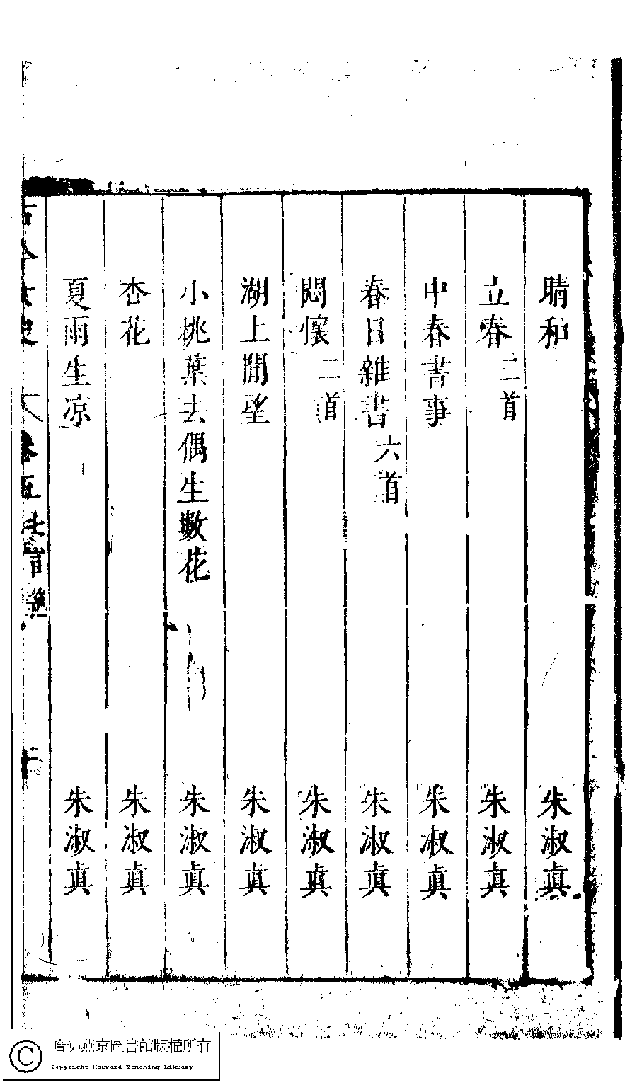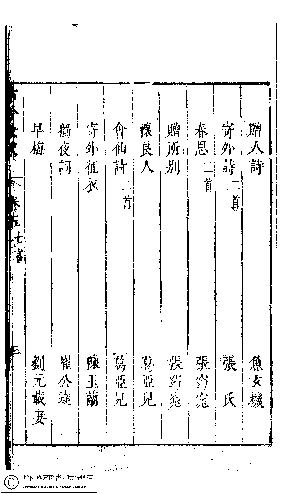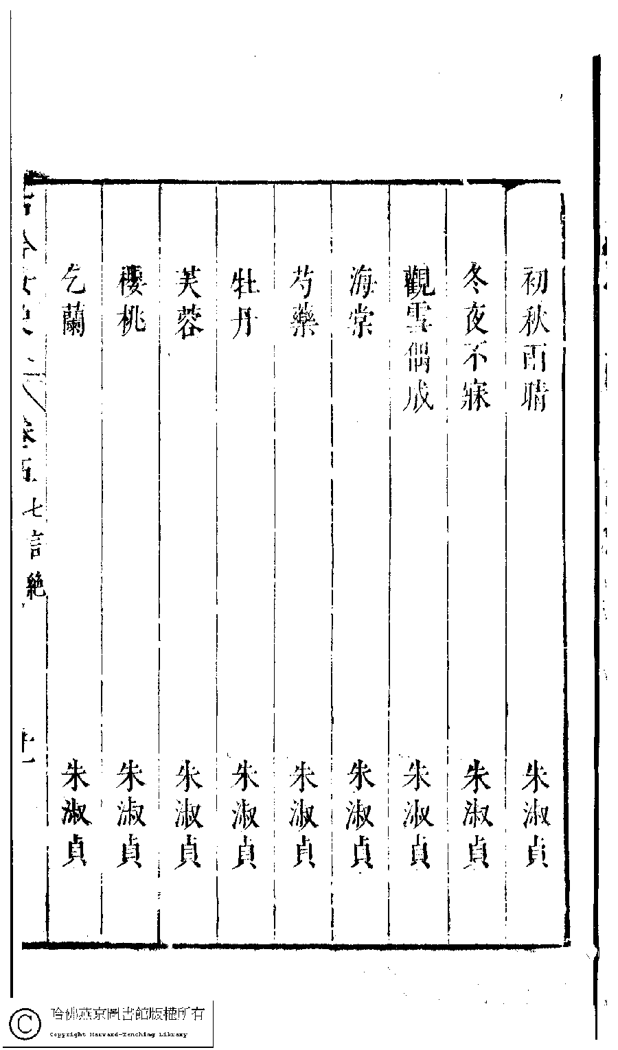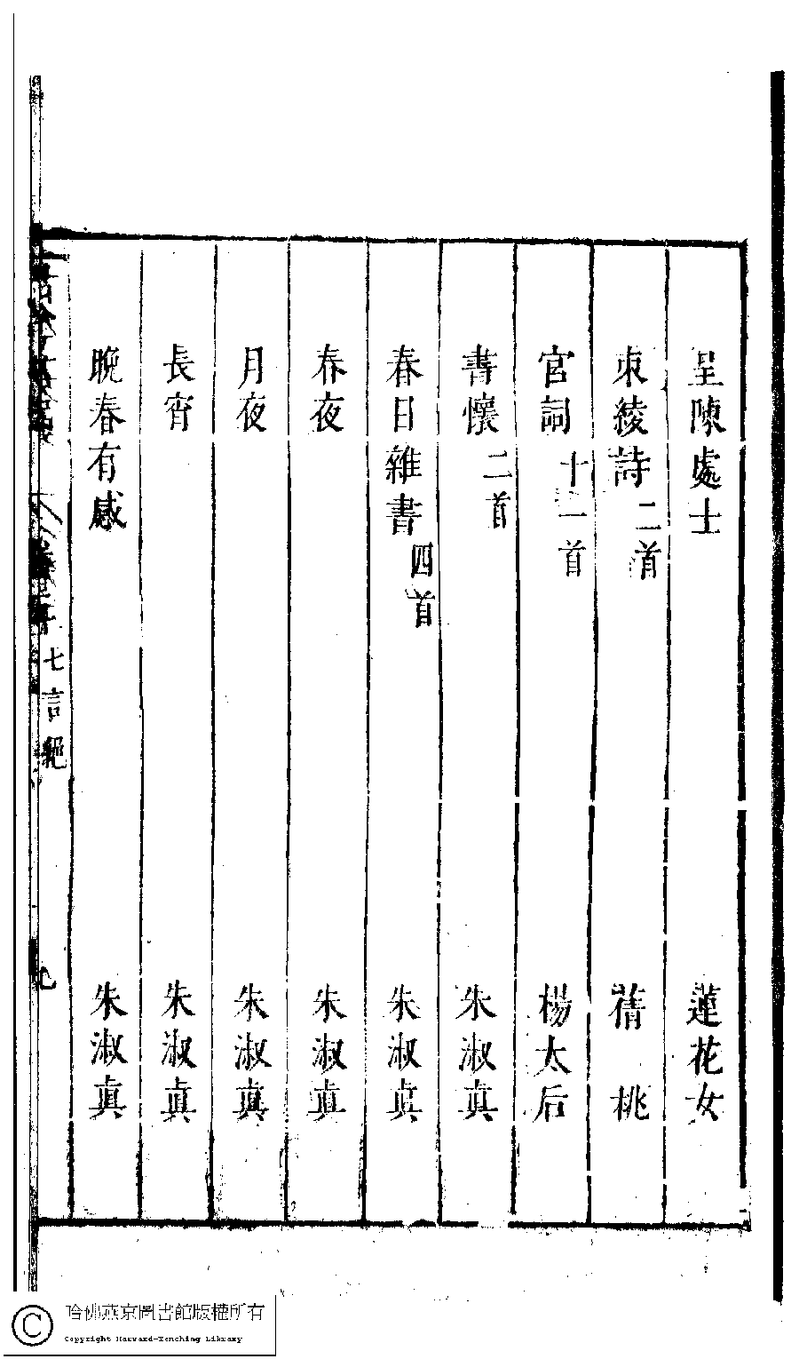 | 古今女史詩集卷五目錄 Gu jin nü shi shi ji juan wu mu lu 古今女史﹕十二卷﹐詩集﹕八卷﹐附姓氏字里詳節﹕一卷(明趙世杰輯) Gu jin nü shi: 12 juan, shi ji: 8 juan, fu Xing shi zi li xiang jie: 1 juan (edited by Zhao shijie, Ming dynasty) , pp. 5.目錄.10a,5.目錄.10b,5.目錄.11b,5.目錄.1a,5.目錄.1b,5.目錄.2a,5.目錄.2b,5.目錄.3a,5.目錄.3b,5.目錄.4a,5.目錄.4b,5.目錄.5a,5.目錄.5b,5.目錄.6a,5.目錄.6b,5.目錄.7a,5.目錄.7b,5.目錄.8a,5.目錄.8b,5.目錄.9a,5.目錄.9b,目錄.5.11a. |
