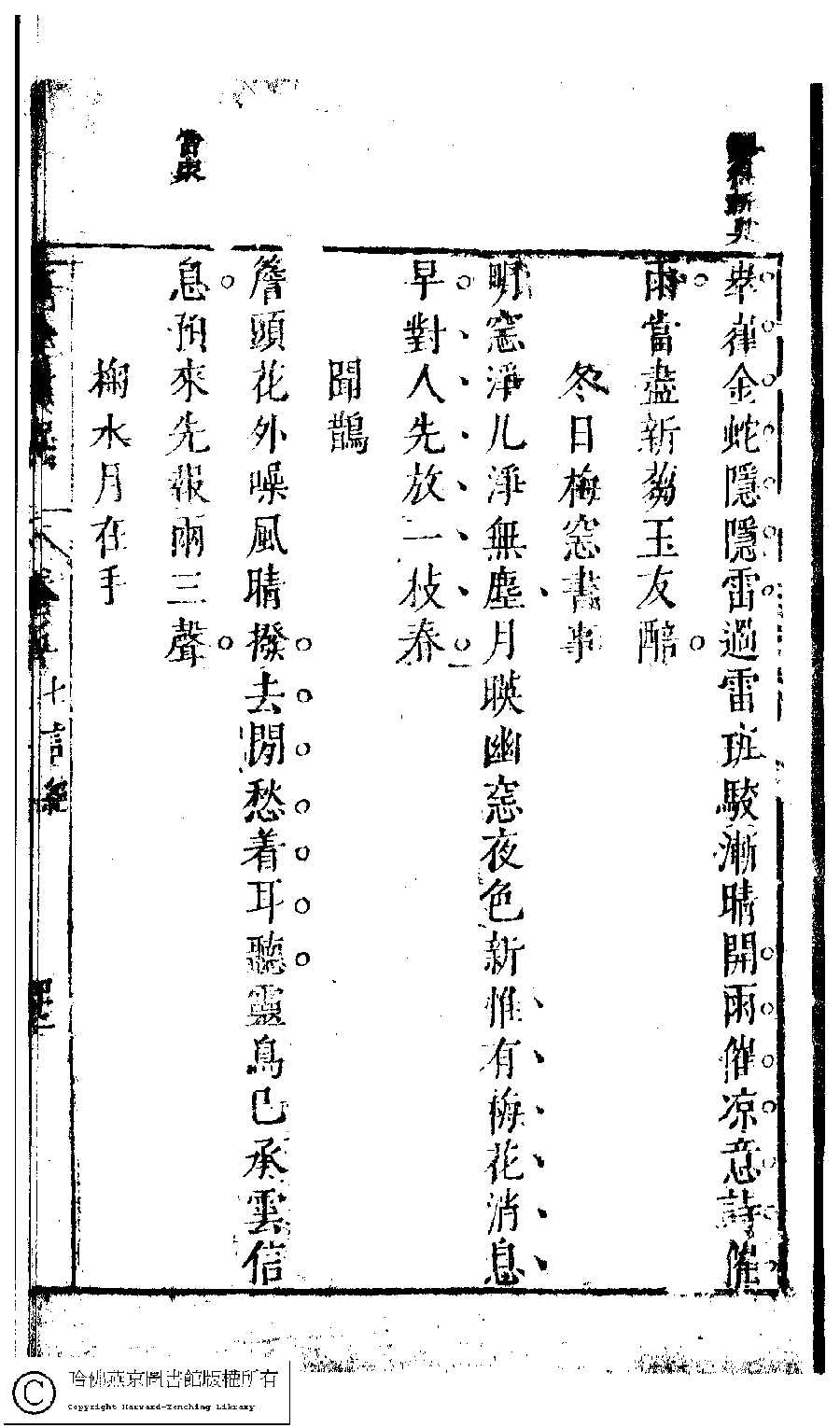 | 冬日梅窻書事 Dong ri mei chuang shu shi 詩 - 七言絕句 shi - qiyanjueju 朱淑真﹐號幽栖居士 Zhu Shuzhen, hao: Youqijushi 古今女史﹕十二卷﹐詩集﹕八卷﹐附姓氏字里詳節﹕一卷(明趙世杰輯) Gu jin nü shi: 12 juan, shi ji: 8 juan, fu Xing shi zi li xiang jie: 1 juan (edited by Zhao shijie, Ming dynasty) , pp. 5.42a. |