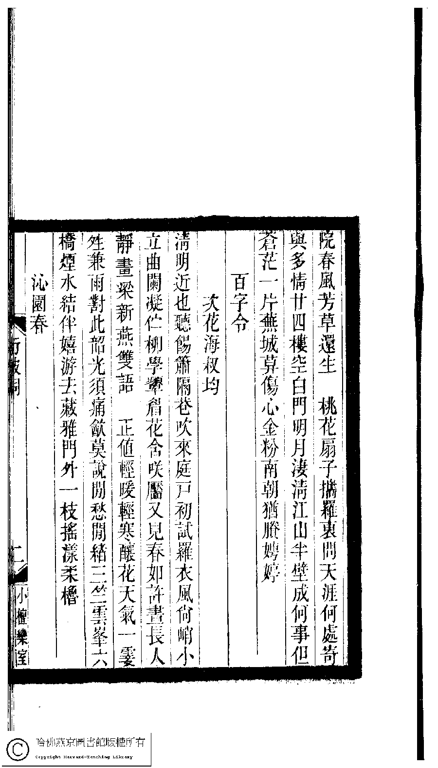 | 百字令 : 次花海叔均 Bai zi ling : Ci Huahai shu yun 詞 ci 孫蓀意﹐字秀芬﹐又名孫琦﹐苕玉 Sun Sunyi, zi: Xiufen 小檀欒室彙刻閨秀詞﹕十集一百種一百卷(清徐乃昌輯) 衍波詞﹕一卷 Xiao tan luan shi hui ke gui xiu ci: 10 ji 100 zhong 100 juan (edited by Xu Naichang, Qing dynasty) Yan bo ci: 1 juan, pp. 衍波詞.2a. |